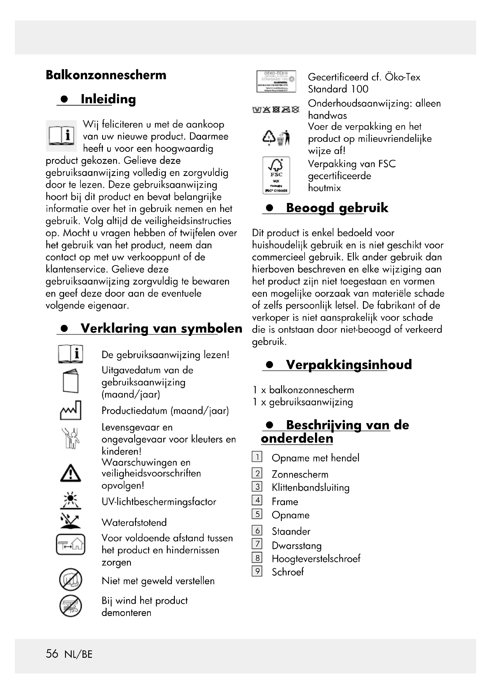 Assistenza Svizzera Tel.: 00800 80040044 E-Mail: administration@mynetsend.de IAN 400220_2107 Per qualsiasi richiesta si prega di conservare lo scontrino e il codice dell‘articolo (ad es. IAN 123456) da esibire come prova d‘acquisto. La versione aggiornata delle istruzioni per l’uso è disponibile nel sito: www.citygate24.de56 NL/BE Balkonzonnescherm z Inleiding Wij feliciteren u met de aankoop van uw nieuwe product. Daarmee heeft u voor een hoogwaardig product gekozen. Gelieve deze gebruiksaanwijzing volledig en zorgvuldig door te lezen. Deze gebruiksaanwijzing hoort bij dit product en bevat belangrijke informatie over het in gebruik nemen en het gebruik. Volg altijd de veiligheidsinstructies op. Mocht u vragen hebben of twijfelen over het gebruik van het product, neem dan contact op met uw verkooppunt of de klantenservice. Gelieve deze gebruiksaanwijzing zorgvuldig te bewaren en geef deze door aan de eventuele volgende eigenaar. z Verklaring van symbolen De gebruiksaanwijzing lezen! Uitgavedatum van de gebruiksaanwijzing (maand/jaar) Productiedatum (maand/jaar) Levensgevaar en ongevalgevaar voor kleuters en kinderen! Waarschuwingen en veiligheidsvoorschriften opvolgen! UV-lichtbeschermingsfactor Waterafstotend Voor voldoende afstand tussen het product en hindernissen zorgen Niet met geweld verstellen Bij wind het product demonteren Gecerticeerd cf. Öko-Tex Standard 100 Onderhoudsaanwijzing: alleen handwas Voer de verpakking en het product op milieuvriendelijke wijze af! Verpakking van FSC gecerticeerde houtmix z Beoogd gebruik Dit product is enkel bedoeld voor huishoudelijk gebruik en is niet geschikt voor commercieel gebruik. Elk ander gebruik dan hierboven beschreven en elke wijziging aan het product zijn niet toegestaan en vormen een mogelijke oorzaak van materiële schade of zelfs persoonlijk letsel. De fabrikant of de verkoper is niet aansprakelijk voor schade die is ontstaan door niet-beoogd of verkeerd gebruik. z Verpakkingsinhoud 1 x balkonzonnescherm 1 x gebruiksaanwijzing z Beschrijving van de onderdelen