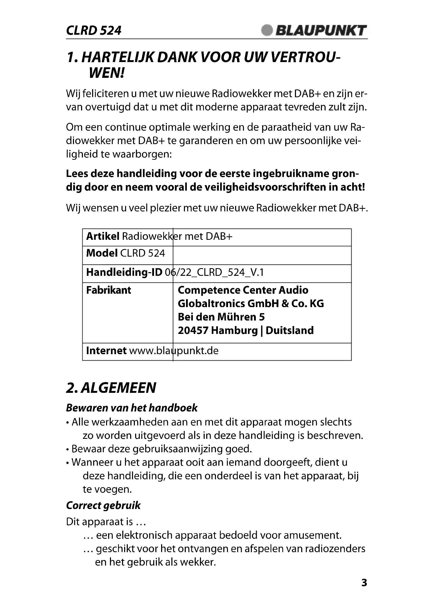 - Wanneer u het apparaat ooit aan iemand doorgeeft, dient u deze handleiding, die een onderdeel is van het apparaat, bij te voegen. Correct gebruik Dit apparaat is … … een elektronisch apparaat bedoeld voor amusement. … geschikt voor het ontvangen en afspelen van radiozenders en het gebruik als wekker. Artikel Radiowekker met DAB+ Model CLRD 524 Handleiding-ID 06/22_CLRD_524_V.1 Fabrikant Competence Center Audio Globaltronics GmbH & Co. KG Bei den Mühren 5 20457 Hamburg | Duitsland Internet www.blaupunkt.de4 CLRD 524 Het apparaat is bestemd voor privégebruik en is niet geschikt voor commercieel gebruik. Elk ander gebruik of elke modificatie is uitgesloten van het gebruik volgens de voorschriften. Aanduidingen/symbolen Indien noodzakelijk vindt u de volgende waarschuwingen in deze handleiding: GEVAAR! Hoog risico: het niet in acht nemen van de waar- schuwing kan lichamelijk letsel of de dood veroorzaken. WAARSCHUWING! Matig risico: het niet in acht nemen van de waarschuwing kan verwondingen of ernstige materiële schade veroorzaken. LET OP: gering risico: het niet in acht nemen van de waarschu- wing kan lichte verwondingen of materiële schade veroorzaken. AANWIJZING: toedrachten en bijzonderheden waarop tijdens het gebruik van het apparaat moet worden gelet.