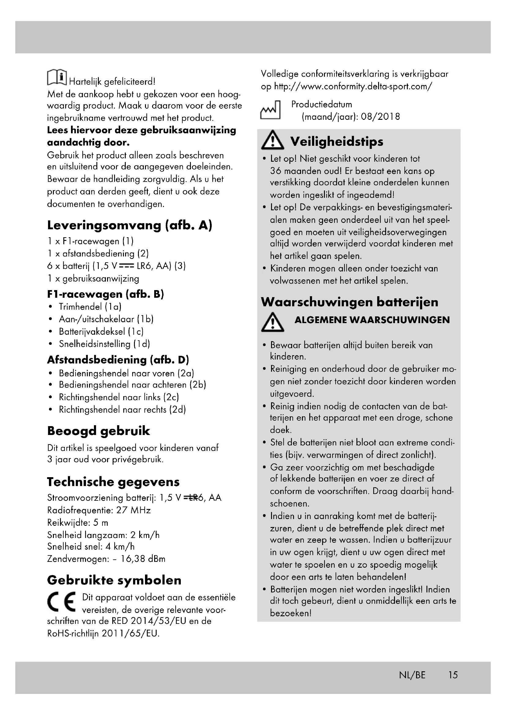 - Richtingshendel naar rechts (2d) Beoogd gebruik Dit artikel is speelgoed voor kinderen vanaf 3 jaar oud voor privégebruik. Technische gegevens Stroomvoorziening batterij: 1,5 V LR6, AA Radiofrequentie: 27 MHz Reikwijdte: 5 m Snelheid langzaam: 2 km/h Snelheid snel: 4 km/h Zendvermogen: – 16,38 dBm Gebruikte symbolen Dit apparaat voldoet aan de essentiële vereisten, de overige relevante voor- schriften van de RED 2014/53/EU en de RoHS-richtlijn 2011/65/EU. Volledige conformiteitsverklaring is verkrijgbaar op http://www.conformity.delta-sport.com/ Productiedatum (maand/jaar): 08/2018 Veiligheidstips