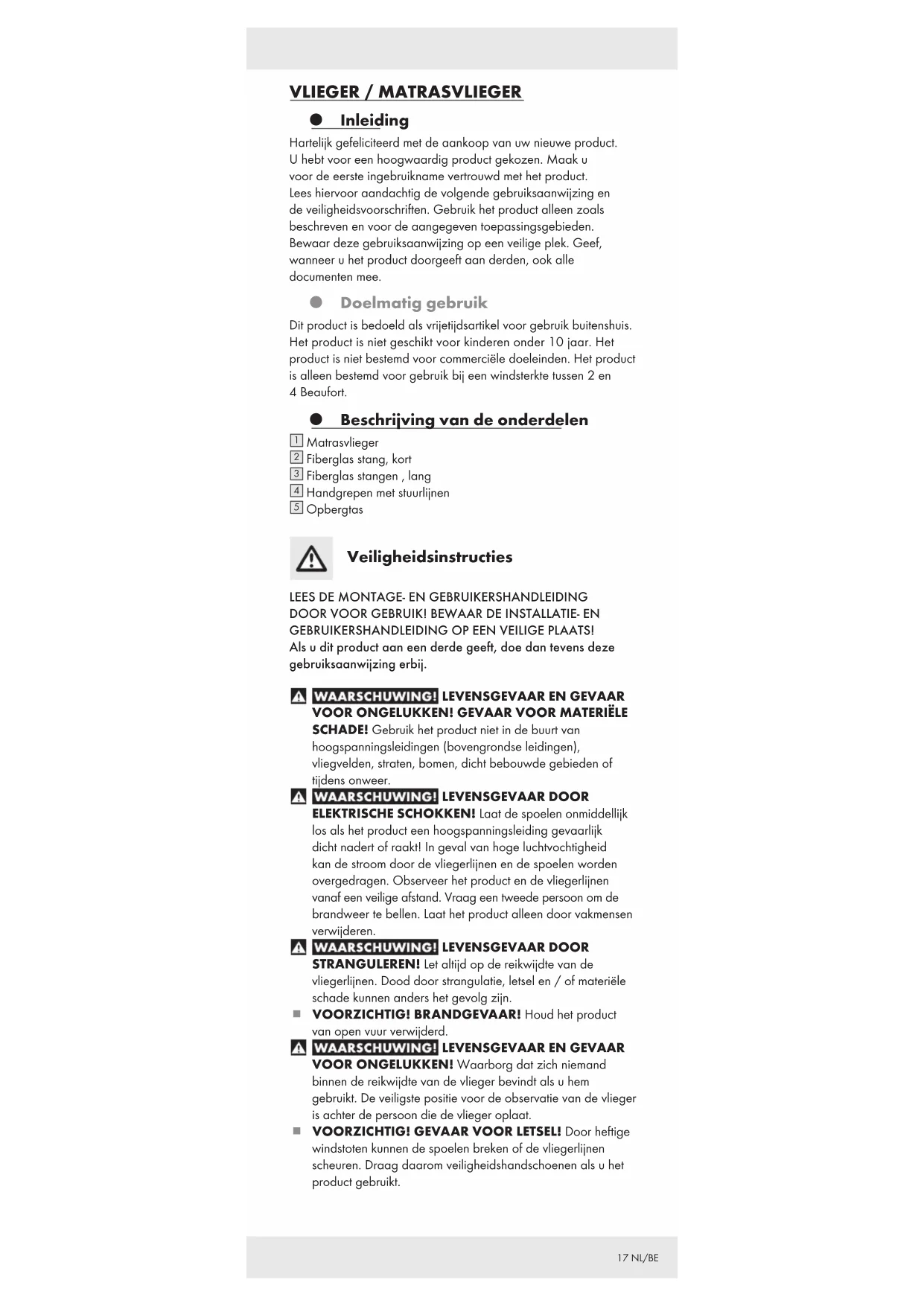 VOOR ONGELUKKEN! Waarborg dat zich niemand binnen de reikwijdte van de vlieger bevindt als u hem gebruikt. De veiligste positie voor de observatie van de vlieger is achter de persoon die de vlieger oplaat. VOORZICHTIG! GEVAAR VOOR LETSEL! Door heftige windstoten kunnen de spoelen breken of de vliegerlijnen scheuren. Draag daarom veiligheidshandschoenen als u het product gebruikt.18 NL/BE