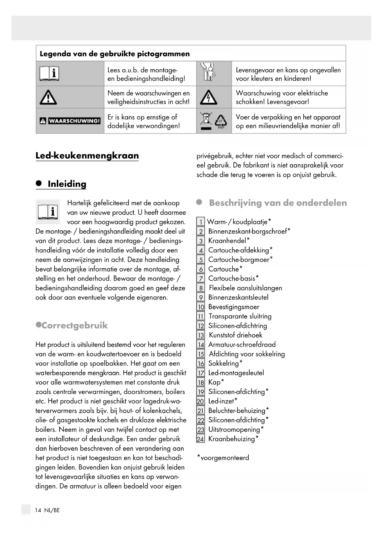 PAP Voer de verpakking en het apparaat op een milieuvriendelijke manier af! Led-keukenmengkraan Inleiding Hartelijk gefeliciteerd met de aankoop van uw nieuwe product. U heeft daarmee voor een hoogwaardig product gekozen. De montage- / bedieningshandleiding maakt deel uit van dit product. Lees deze montage- / bedienings- handleiding vóór de installatie volledig door een neem de aanwijzingen in acht. Deze handleiding bevat belangrijke informatie over de montage, af- stelling en het onderhoud. Bewaar de montage- / bedieningshandleiding daarom goed en geef deze ook door aan eventuele volgende eigenaren. Correct gebruik Het product is uitsluitend bestemd voor het reguleren van de warm- en koudwatertoevoer en is bedoeld voor installatie op spoelbakken. Het gaat om een