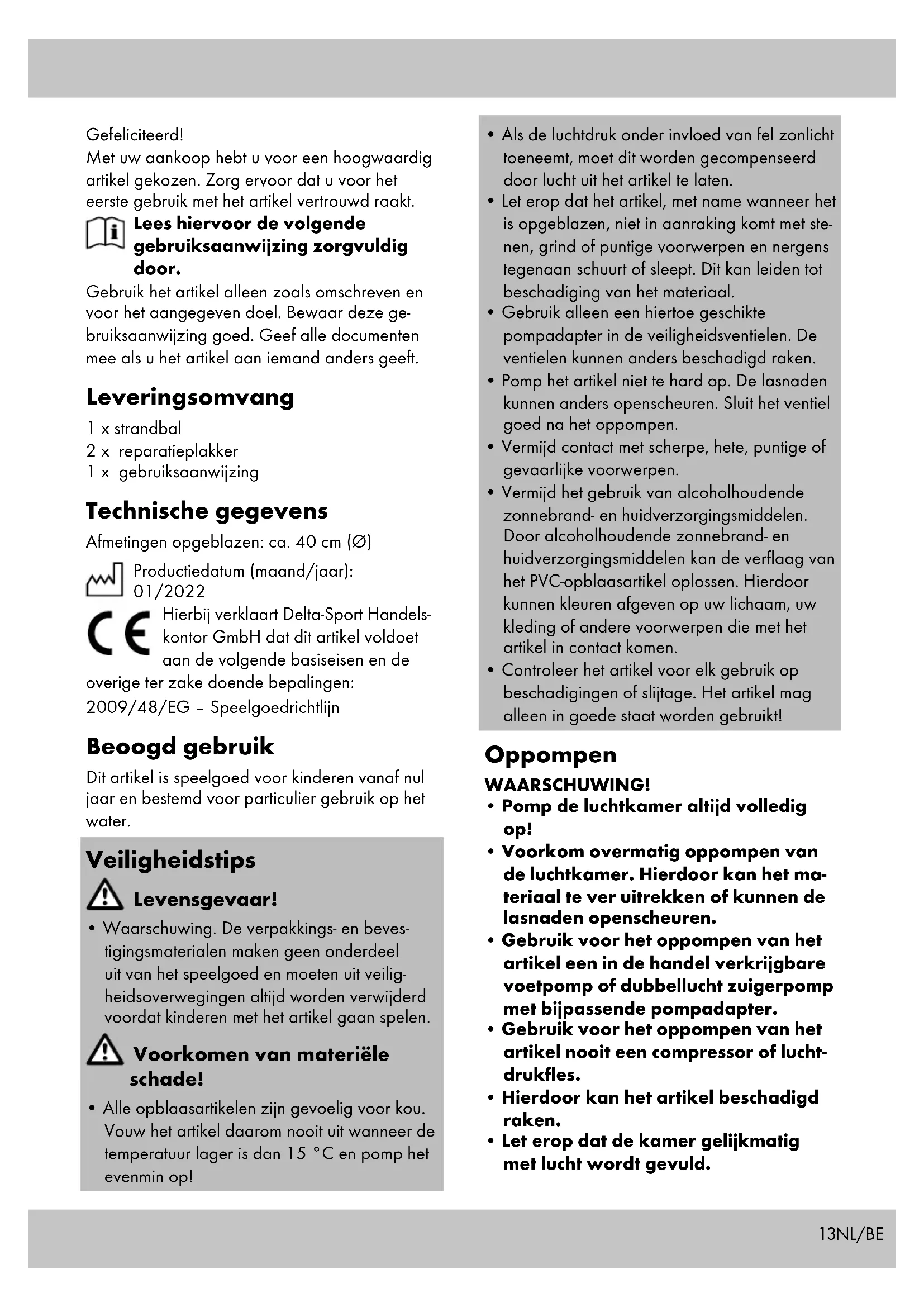 - Trek de plakker van het papier, plaats deze op de beschadiging en druk hem goed aan. Opslag, reiniging Bewaar het artikel wanneer u dit niet gebruikt altijd droog, schoon en onopgepompt op kamer- temperatuur. Zorg ervoor dat het ventiel tijdens opslag altijd gesloten is. Plaats tijdens de winteropslag geen scherpe voorwerpen op het artikel en poeder het artikel niet in met talkpoeder. Reinig het artikel alleen met een vochtige schoonmaakdoek en droog het vervolgens af. BELANGRIJK! Reinig nooit met agressieve reini- gingsmiddelen. Afvalverwerking Voer het artikel en verpakkingsmaterialen in overeenstemming met actuele lokale voor- schriften af. Verpakkingsmaterialen, zoals bv. foliezakjes, horen niet thuis in kinderhanden. Berg het verpakkingsmateriaal buiten het bereik van kinderen op. Voer de producten en verpakkingen op milieuvriendelijke wijze af. De recyclingcode dient om verschillende materialen te kenmerken ten behoeve van hergebruik via het recyclingproces. De code bestaat uit het recyclingsymbool, dat het recyclingproces weerspiegelt, en een getal dat het materiaal identificeert. Opmerkingen over garantie en serviceafhandeling Het artikel werd met de grootste zorgvuldigheid en onder permanent toezicht geproduceerd. De firma DELTA-SPORT HANDELSKONTOR GmbH verleent particuliere eindklanten op dit artikel drie jaar garantie, te rekenen vanaf de datum van aankoop (garantietermijn) en dit op grond van de volgende bepalingen. De garantie geldt alleen voor materiaal- en verwerkingsfouten. De garantie is niet van toepassing op onderde- len die aan een normale slijtage onderhevig zijn en daarom als niet-slijtvaste onderdelen te beschouwen zijn (bv. batterijen) en evenmin op breekbare onderdelen, bv. schakelaars, accu’s of onderdelen die van glas gemaakt zijn. Uit de garantie voortvloeiende claims zijn uitge- sloten als het artikel onvakkundig, verkeerd of niet in het kader van de voorziene bepaling of in het kader van het voorziene gebruiksdoeleinde gebruikt werd of indien richtlijnen in de gebruiks- aanwijzing niet in acht genomen werden, tenzij de eindklant aantoont dat er sprake is van een materiaal- of verwerkingsfout die niet op één van de hoger vermelde omstandigheden gebaseerd is. NL/BE15NL/BE Uit de garantie voortvloeiende claims kunnen alleen tijdens de garantieperiode op vertoon van de originele kassabon ingediend wor- den. Gelieve daarom de originele kassabon te bewaren. De garantieperiode wordt door eventuele reparaties op grond van de garantie, wettelijke waarborg of coulance niet verlengd. Dit geldt ook voor vervangen en gerepareerde onderdelen. Gelieve u bij klachten in eerste instantie tot de hieronder vermelde servicehotline te richten of met ons per e-mail contact op te nemen. Is er sprake van een garantiegeval, dan wordt het ar- tikel door ons – naar onze keuze – voor u gratis gerepareerd, wordt het vervangen of wordt de aankoopsom terugbetaald. Verdere rechten op grond van de garantie bestaan niet. Uw wettelijke rechten, in het bijzonder rechten op garantie tegenover de betreffende verkoper, worden door deze garantie niet beperkt. IAN: 399689_2107 Service België Tel.: 070 270 171 (0,15 EUR/Min.) E-Mail: deltasport@lidl.be Service Nederland Tel.: 0900 0400223 (0,10 EUR/Min.) E-Mail: deltasport@lidl.nl16 PL Gratulujemy! Decydując się na ten produkt, otrzymują Pań- stwo towar wysokiej jakości. Należy zapoznać się z produktem przed jego pierwszym użyciem. Należy uważnie przeczytać następującą instrukcję użytkowa- nia. Produkt ten należy użytkować wyłącznie w opisany sposób oraz zgodnie ze wskazanym przeznaczeniem. Niniejszą instrukcję użytko- wania należy przechowywać w bezpiecznym miejscu. Przekazując produkt innej osobie, należy upewnić się, że otrzyma ona także całą dokumentację dotyczącą produktu. Zakres dostawy 1 x materac dmuchany 2 x łatka do naprawy 1 x instrukcja użytkowania Dane techniczne Wymiary po napompowaniu: ok. 40 cm (Ø) Data produkcji (miesiąc/rok): 01/2022 Firma Delta-Sport Handelskon- tor GmbH oświadcza, że niniejszy produkt spełnia najważniejsze wymagania oraz jest zgodny z podanymi poniżej wytycznymi: 2009/48/WE – dyrektywa w sprawie bezpie- czeństwa zabawek Użytkowanie zgodne z prze- znaczeniem Ten produkt jest zabawką przeznaczoną do pry- watnego użytkowania w wodzie przez dzieci od zera roku życia. Wskazówki bezpieczeństwa Zagrożenie życia!
