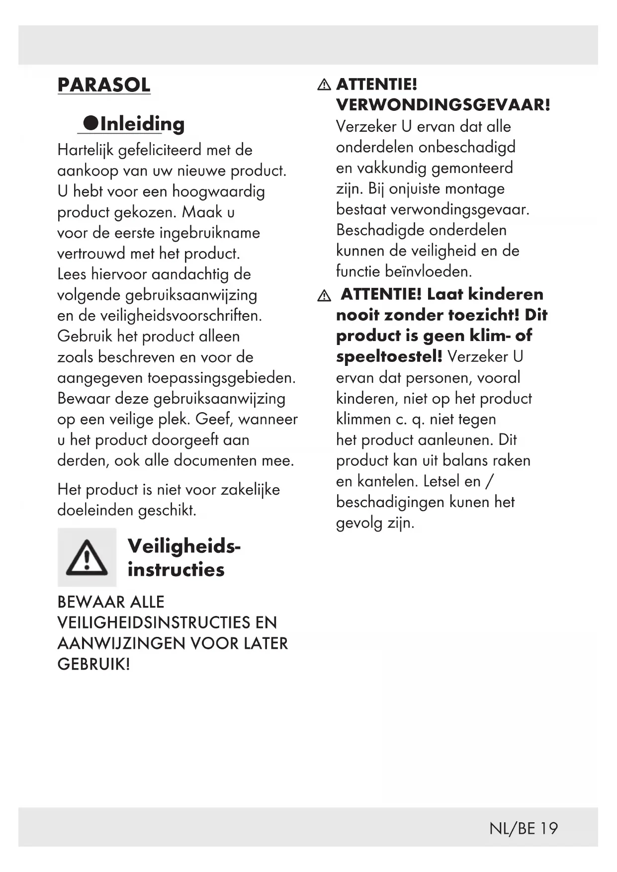 ATTENTIE! KANTELGEVAAR! Zorg er steeds voor dat het product stevig staat. Plaats de parasol in een hiervoor geschikte parasolvoet / bodemkoker. Anders kan de parasol kantelen en letsels alsook materiële schades kunnen het gevolg zijn.
