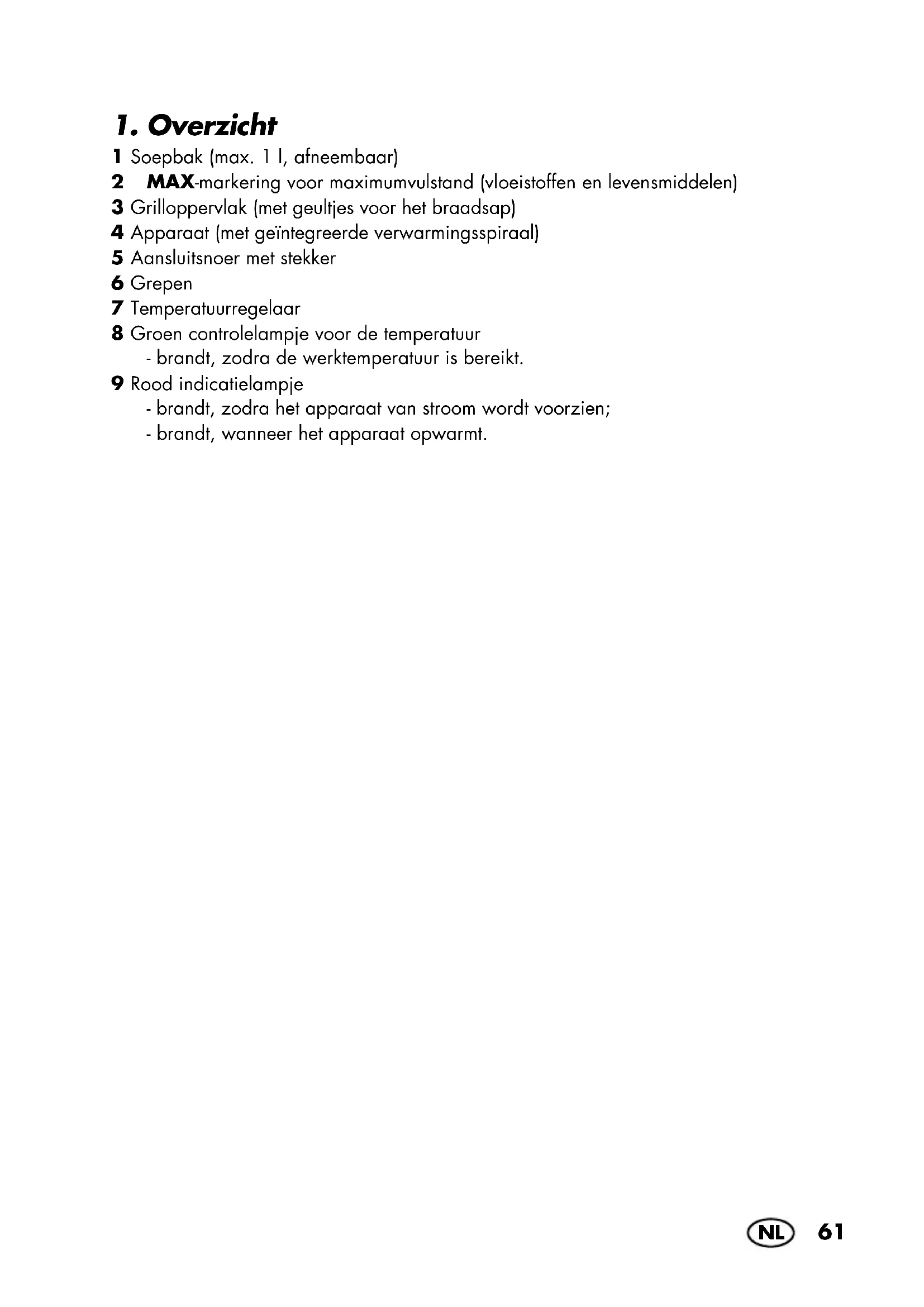 1 Soepbak (max. 1 l, afneembaar) 2MAX-markering voor maximumvulstand (vloeistoffen en levensmiddelen) 3 Grilloppervlak (met geultjes voor het braadsap) 4 Apparaat (met geïntegreerde verwarmingsspiraal) 5 Aansluitsnoer met stekker 6 Grepen 7 Temperatuurregelaar 8 Groen controlelampje voor de temperatuur - brandt, zodra de werktemperatuur is bereikt. 9 Rood indicatielampje - brandt, zodra het apparaat van stroom wordt voorzien; - brandt, wanneer het apparaat opwarmt. __383180_2110_Hot Pot 2 in 1_B8.book Seite 61 Freitag, 18. März 2022 11:11 1162