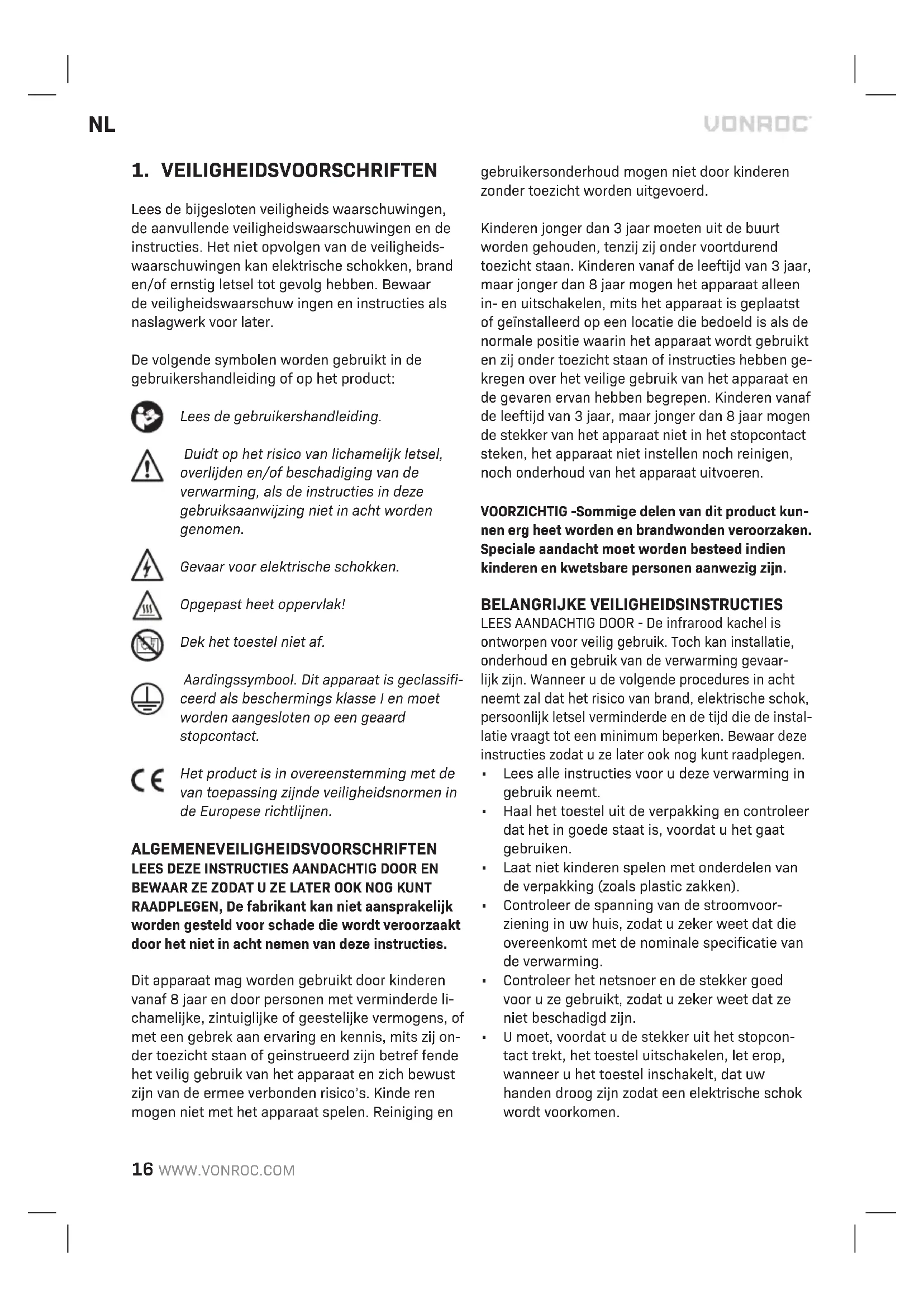 BEWAAR ZE ZODAT U ZE LATER OOK NOG KUNT RAADPLEGEN, De fabrikant kan niet aansprakelijk worden gesteld voor schade die wordt veroorzaakt door het niet in acht nemen van deze instructies. Dit apparaat mag worden gebruikt door kinderen vanaf 8 jaar en door personen met verminderde li- chamelijke, zintuiglijke of geestelijke vermogens, of met een gebrek aan ervaring en kennis, mits zij on- der toezicht staan of geinstrueerd zijn betref fende het veilig gebruik van het apparaat en zich bewust zijn van de ermee verbonden risico’s. Kinde ren mogen niet met het apparaat spelen. Reiniging en gebruikersonderhoud mogen niet door kinderen zonder toezicht worden uitgevoerd. Kinderen jonger dan 3 jaar moeten uit de buurt worden gehouden, tenzij zij onder voortdurend toezicht staan. Kinderen vanaf de leeftijd van 3 jaar, maar jonger dan 8 jaar mogen het apparaat alleen in- en uitschakelen, mits het apparaat is geplaatst of geïnstalleerd op een locatie die bedoeld is als de normale positie waarin het apparaat wordt gebruikt en zij onder toezicht staan of instructies hebben ge- kregen over het veilige gebruik van het apparaat en de gevaren ervan hebben begrepen. Kinderen vanaf de leeftijd van 3 jaar, maar jonger dan 8 jaar mogen de stekker van het apparaat niet in het stopcontact steken, het apparaat niet instellen noch reinigen, noch onderhoud van het apparaat uitvoeren. VOORZICHTIG -Sommige delen van dit product kun- nen erg heet worden en brandwonden veroorzaken. Speciale aandacht moet worden besteed indien kinderen en kwetsbare personen aanwezig zijn. BELANGRIJKE VEILIGHEIDSINSTRUCTIES LEES AANDACHTIG DOOR - De infrarood kachel is ontworpen voor veilig gebruik. Toch kan installatie, onderhoud en gebruik van de verwarming gevaar- lijk zijn. Wanneer u de volgende procedures in acht neemt zal dat het risico van brand, elektrische schok, persoonlijk letsel verminderde en de tijd die de instal- latie vraagt tot een minimum beperken. Bewaar deze instructies zodat u ze later ook nog kunt raadplegen.