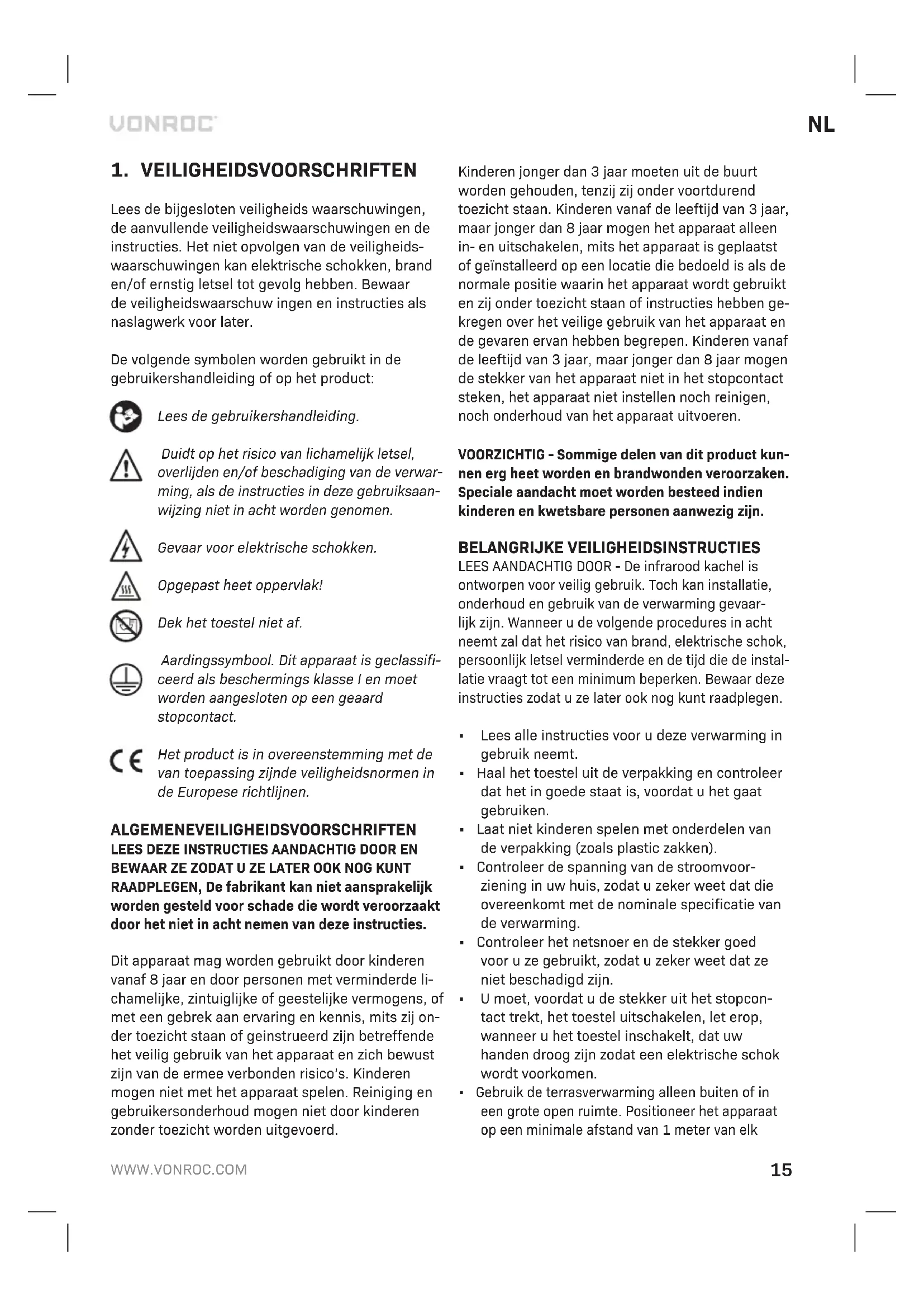 BEWAAR ZE ZODAT U ZE LATER OOK NOG KUNT RAADPLEGEN, De fabrikant kan niet aansprakelijk worden gesteld voor schade die wordt veroorzaakt door het niet in acht nemen van deze instructies. Dit apparaat mag worden gebruikt door kinderen vanaf 8 jaar en door personen met verminderde li- chamelijke, zintuiglijke of geestelijke vermogens, of met een gebrek aan ervaring en kennis, mits zij on- der toezicht staan of geinstrueerd zijn betreffende het veilig gebruik van het apparaat en zich bewust zijn van de ermee verbonden risico’s. Kinderen mogen niet met het apparaat spelen. Reiniging en gebruikersonderhoud mogen niet door kinderen zonder toezicht worden uitgevoerd. Kinderen jonger dan 3 jaar moeten uit de buurt worden gehouden, tenzij zij onder voortdurend toezicht staan. Kinderen vanaf de leeftijd van 3 jaar, maar jonger dan 8 jaar mogen het apparaat alleen in- en uitschakelen, mits het apparaat is geplaatst of geïnstalleerd op een locatie die bedoeld is als de normale positie waarin het apparaat wordt gebruikt en zij onder toezicht staan of instructies hebben ge- kregen over het veilige gebruik van het apparaat en de gevaren ervan hebben begrepen. Kinderen vanaf de leeftijd van 3 jaar, maar jonger dan 8 jaar mogen de stekker van het apparaat niet in het stopcontact steken, het apparaat niet instellen noch reinigen, noch onderhoud van het apparaat uitvoeren. VOORZICHTIG - Sommige delen van dit product kun- nen erg heet worden en brandwonden veroorzaken. Speciale aandacht moet worden besteed indien kinderen en kwetsbare personen aanwezig zijn. BELANGRIJKE VEILIGHEIDSINSTRUCTIES LEES AANDACHTIG DOOR - De infrarood kachel is ontworpen voor veilig gebruik. Toch kan installatie, onderhoud en gebruik van de verwarming gevaar- lijk zijn. Wanneer u de volgende procedures in acht neemt zal dat het risico van brand, elektrische schok, persoonlijk letsel verminderde en de tijd die de instal- latie vraagt tot een minimum beperken. Bewaar deze instructies zodat u ze later ook nog kunt raadplegen.