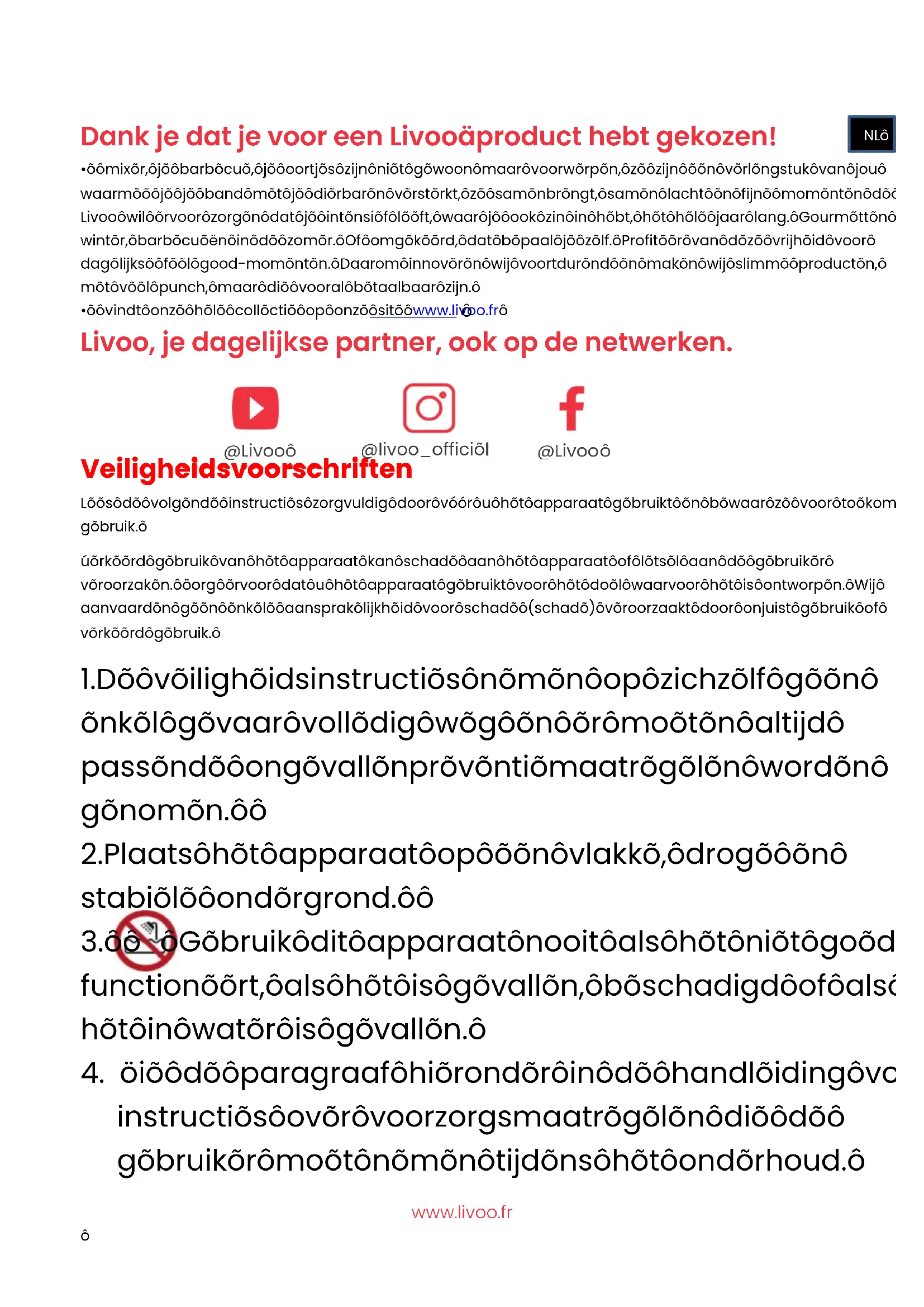Dank je dat je voor een Livoo-product hebt gekozen! Je mixer, je barbecue, je oortjes zijn niet gewoon maar voorwerpen, ze zijn een verlengstuk van jou waarmee je je band met je dierbaren versterkt, ze samenbrengt, samen lacht en fijne momenten deelt. Livoo wil ervoor zorgen dat je intensief leeft, waar je ook zin in hebt, het hele jaar lang. Gourmetten in de winter, barbecueën in de zomer. Of omgekeerd, dat bepaal je zelf. Profiteer van deze vrijheid voor dagelijkse feel good-momenten. Daarom innoveren wij voortdurend en maken wij slimme producten, met veel punch, maar die vooral betaalbaar zijn. Je vindt onze hele collectie op onze site www.livoo.fr Livoo, je dagelijkse partner, ook op de netwerken.