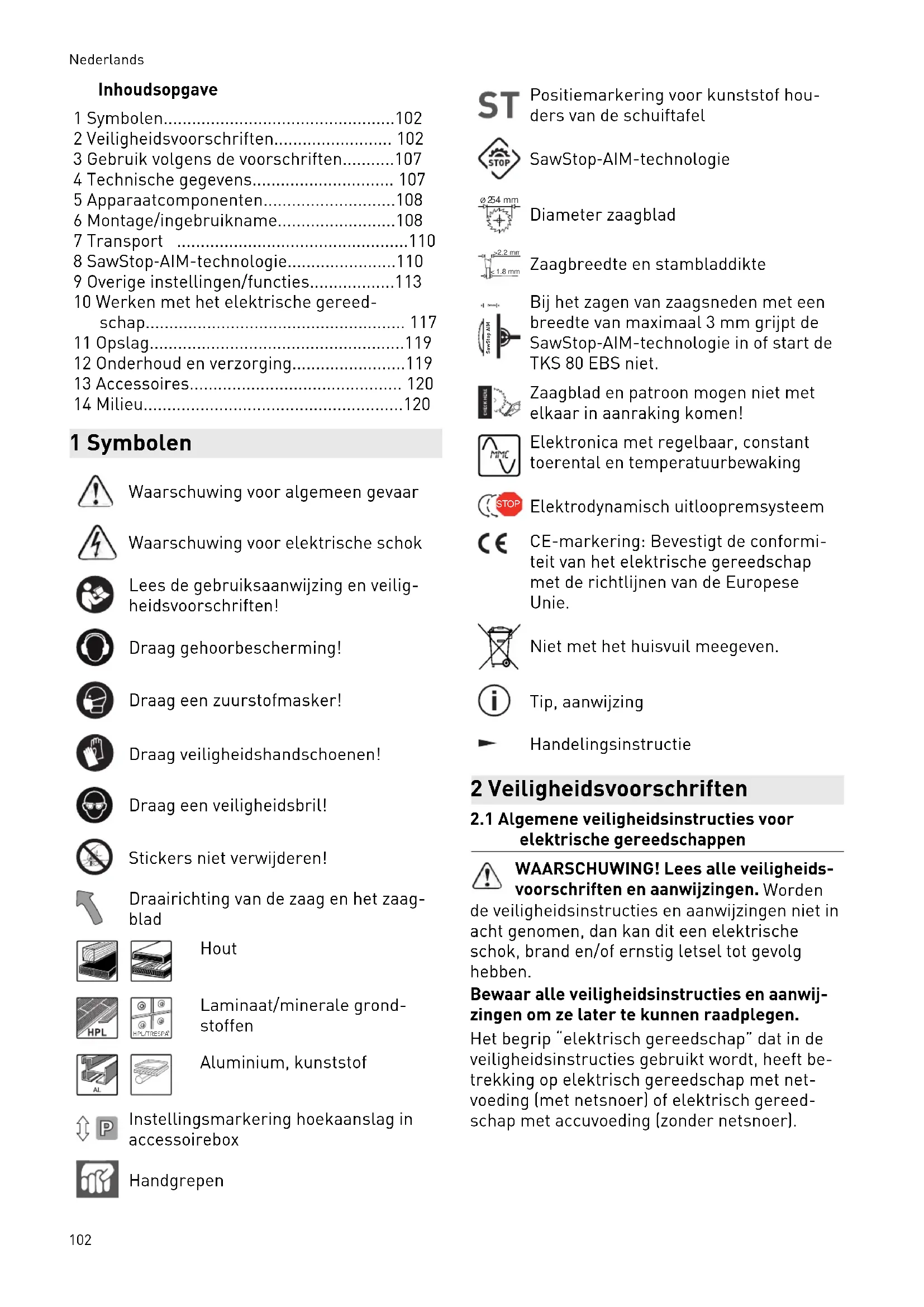 TKS 80 EBS is als draagbaar elektrisch ge reedschap conform het gebruiksdoel geschikt voor het zagen van hout, gelamineerde houten panelen, non-ferro metalen en kunststof. LET OP SawStop‑AIM-technologie is geactiveerd ► Deactiveer de SawStop‑AIM-technologie (bypass-modus) bij het zagen van non-fer rometalen, natte, statisch opgeladen of ge leidende materialen. Dit elektrische gereedschap mag uitsluitend door vakmannen of goed opgeleide personen worden gebruikt. De gebruiker is aansprakelijk bij gebruik dat niet volgens de voorschriften plaats vindt.
