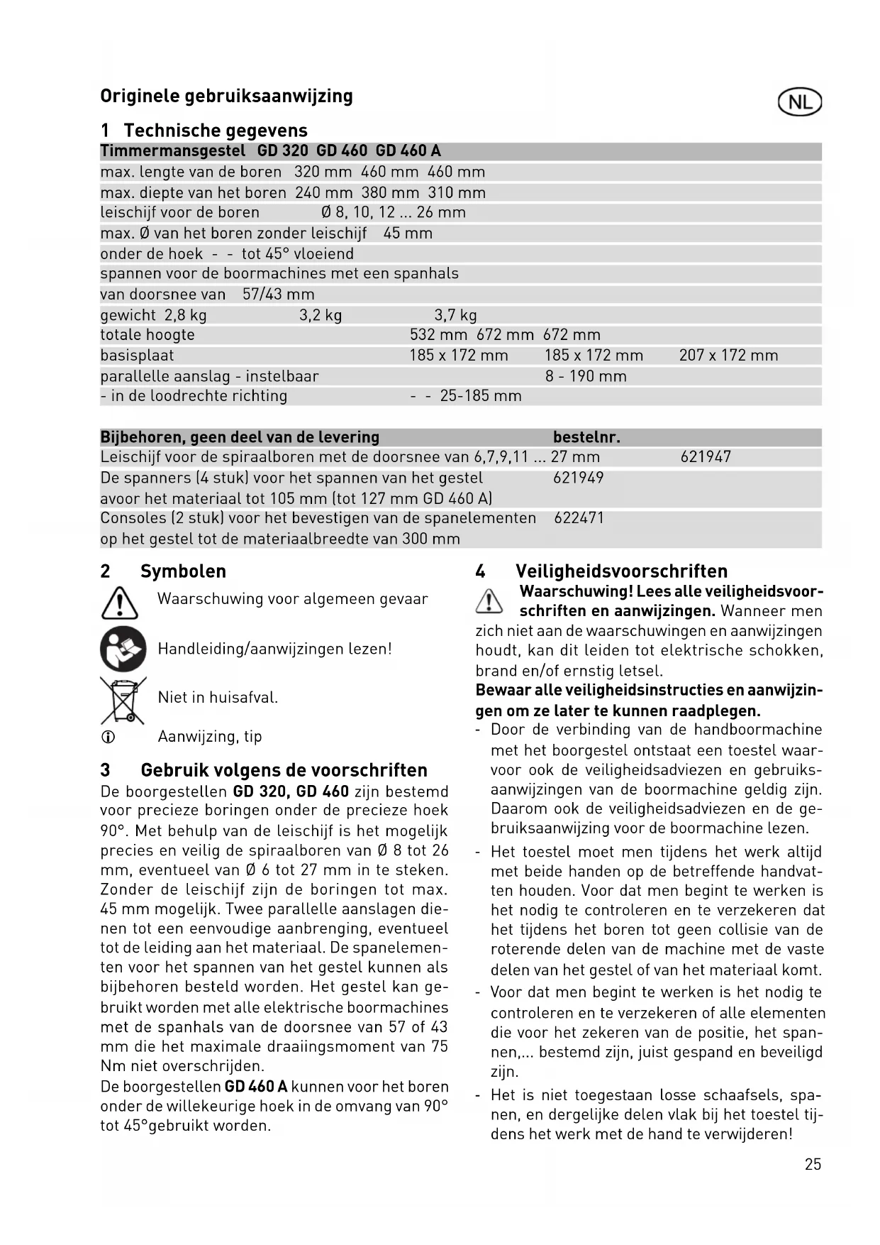 Utilizzare solo ricambi originali Festool! Cod. prodotto reperibile al sito: www.festool.com/Service - Elementi di fi ssaggio e i punti di fi ssaggio pulite dalla polvere, impurità e truciolo. - Le barre di guida pulite con lo straccio, assicu- rate le buone condizioni di scorrimento, lubri- fi cando le barre di scorrimento con grasso o I’ olio per le macchine. - Mantenete pulita la superfi cie di contatto, in questo modo sarà assicurata la precisione e correttezza degli angoli. Dovete sapere che: - Le molle utilizzate del cavalietto di trapana- tura hanno appositamente la gradazione più grande dalle barre di guida. Non si tratta della mancanza della qualità, al contrario, in questo modo si ottiene la caratteristica migliore delle molle. Queste molle assicurano la resistenza minore durante trapanatura. 9 Ambiente Non gettare l’apparecchio tra i rifi uti domestici! Smaltire gli apparecchi, gli accessori e gli imbal- laggi introducendoli nel ciclo di recupero a tutela dell’ambiente. Attenersi alle disposizioni di legge nazionali in materia. Informazioni su REACh: www.festool.com/reach25 Originele gebruiksaanwijzing 1 Technische gegevens Timmermansgestel GD 320 GD 460 GD 460 A max. lengte van de boren 320 mm 460 mm 460 mm max. diepte van het boren 240 mm 380 mm 310 mm leischijf voor de boren Ø 8, 10, 12 ... 26 mm max. Ø van het boren zonder leischijf 45 mm onder de hoek - - tot 45° vloeiend spannen voor de boormachines met een spanhals van doorsnee van 57/43 mm gewicht 2,8 kg 3,2 kg 3,7 kg totale hoogte 532 mm 672 mm 672 mm basisplaat 185 x 172 mm 185 x 172 mm 207 x 172 mm parallelle aanslag - instelbaar 8 - 190 mm - in de loodrechte richting - - 25-185 mm Bijbehoren, geen deel van de levering bestelnr. Leischijf voor de spiraalboren met de doorsnee van 6,7,9,11 ... 27 mm 621947 De spanners (4 stuk) voor het spannen van het gestel 621949 avoor het materiaal tot 105 mm (tot 127 mm GD 460 A) Consoles (2 stuk) voor het bevestigen van de spanelementen 622471 op het gestel tot de materiaalbreedte van 300 mm 2 Symbolen Waarschuwing voor algemeen gevaar Handleiding/aanwijzingen lezen! Niet in huisafval. Aanwijzing, tip 3 Gebruik volgens de voorschriften De boorgestellen GD 320, GD 460 zijn bestemd voor precieze boringen onder de precieze hoek 90°. Met behulp van de leischijf is het mogelijk precies en veilig de spiraalboren van Ø 8 tot 26 mm, eventueel van Ø 6 tot 27 mm in te steken. Zonder de leischijf zijn de boringen tot max. 45mm mogelijk. Twee parallelle aanslagen die- nen tot een eenvoudige aanbrenging, eventueel tot de leiding aan het materiaal. De spanelemen- ten voor het spannen van het gestel kunnen als bijbehoren besteld worden. Het gestel kan ge- bruikt worden met alle elektrische boormachines met de spanhals van de doorsnee van 57 of 43 mm die het maximale draaiingsmoment van 75 Nm niet overschrijden. De boorgestellen GD 460 A kunnen voor het boren onder de willekeurige hoek in de omvang van 90° tot 45°gebruikt worden. 4 Veiligheidsvoorschriften Waarschuwing! Lees alle veiligheidsvoor- schriften en aanwijzingen. Wanneer men zich niet aan de waarschuwingen en aanwijzingen houdt, kan dit leiden tot elektrische schokken, brand en/of ernstig letsel. Bewaar alle veiligheidsinstructies en aanwijzin- gen om ze later te kunnen raadplegen. - Door de verbinding van de handboormachine met het boorgestel ontstaat een toestel waar- voor ook de veiligheidsadviezen en gebruiks- aanwijzingen van de boormachine geldig zijn. Daarom ook de veiligheidsadviezen en de ge- bruiksaanwijzing voor de boormachine lezen. - Het toestel moet men tijdens het werk altijd met beide handen op de betreffende handvat- ten houden. Voor dat men begint te werken is het nodig te controleren en te verzekeren dat het tijdens het boren tot geen collisie van de roterende delen van de machine met de vaste delen van het gestel of van het materiaal komt. - Voor dat men begint te werken is het nodig te controleren en te verzekeren of alle elementen die voor het zekeren van de positie, het span- nen,... bestemd zijn, juist gespand en beveiligd zijn. - Het is niet toegestaan losse schaafsels, spa- nen, en dergelijke delen vlak bij het toestel tij- dens het werk met de hand te verwijderen!26 - Bij de boormachines met het draaiingsmoment boven 55 Nm is het nodig altijd voor de aanvul- lende handvat net verlengende deel te gebrui- ken. - Het materiaal moet altijd met een vaste onder- legger onderlegd en tegen het doordraaien of afglijden verzekerd worden. - De kipbare boorgestellen (GD 460 A) moeten tijdens het boren van de openingen onder de hoek tegen de verschuiving verzekerd worden. Het is raadzaam voor dit doel de spanners (bij- behoren) te gebruiken. - Tijdens het werk voor een veilige en vaste posi- tie zorgen. - Tijdens alle arbeiden die tot de voorbereiding, montage, ombouw, instelling, vervangen van de boren of tot onderhoud en behandeling dienen, is het nodig de stekker van de boormachine uit het net uit te trekken. 4 Toestelelementen 1 Basisplaat 2 Parallelle leiband 3 Leischijf voor de boren 4 Leistaven 5 Springveren 6 Aanslagbuis 7 Diepteaanslagen 8 Leiverbindingsstuk 9 Reductie D 57/43 mm 10 Aanvullende houder 11 Verlengstuk van de aanvullende houder 12 Spanners 13 Consoles 14 Schroef voor de instelling van de ortho- gonaliteit 15 Voetstukken 16 Spanmoeren 17 Schaal 18 Wijzer 19 Spanschroef van de wijzer 20 Beugel Het complete afgebeelde en beschrevene bijbeho- ren moet geen bestanddeel van de levering zijn. De vermelde afbeeldingen staan in het begin van de gebruiksaanwijzing. 6 Ingebruikname en toepassing