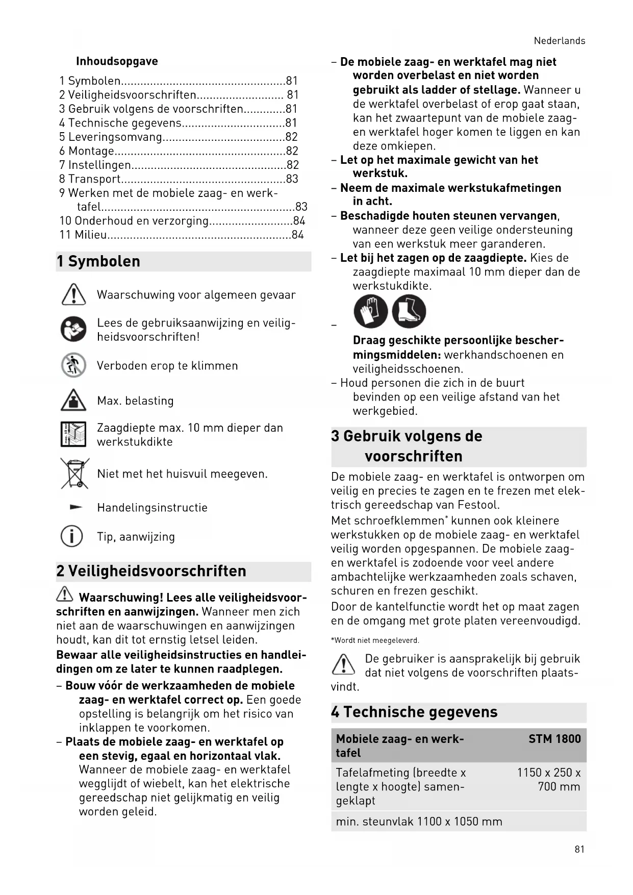 - 11 Milieu 1 Symbolen Waarschuwing voor algemeen gevaar Lees de gebruiksaanwijzing en veilig heidsvoorschriften! Verboden erop te klimmen Max. belasting max. 10 mm Zaagdiepte max. 10 mm dieper dan werkstukdikte Niet met het huisvuil meegeven. Handelingsinstructie Tip, aanwijzing 2 Veiligheidsvoorschriften Waarschuwing! Lees alle veiligheidsvoor schriften en aanwijzingen. Wanneer men zich niet aan de waarschuwingen en aanwijzingen houdt, kan dit tot ernstig letsel leiden. Bewaar alle veiligheidsinstructies en handlei dingen om ze later te kunnen raadplegen. – Bouw vóór de werkzaamheden de mobiele zaag- en werktafel correct op. Een goede opstelling is belangrijk om het risico van inklappen te voorkomen. – Plaats de mobiele zaag- en werktafel op een stevig, egaal en horizontaal vlak. Wanneer de mobiele zaag- en werktafel wegglijdt of wiebelt, kan het elektrische gereedschap niet gelijkmatig en veilig worden geleid. – De mobiele zaag- en werktafel mag niet worden overbelast en niet worden gebruikt als ladder of stellage. Wanneer u de werktafel overbelast of erop gaat staan, kan het zwaartepunt van de mobiele zaag- en werktafel hoger komen te liggen en kan deze omkiepen. – Let op het maximale gewicht van het werkstuk. – Neem de maximale werkstukafmetingen in acht. – Beschadigde houten steunen vervangen, wanneer deze geen veilige ondersteuning van een werkstuk meer garanderen. – Let bij het zagen op de zaagdiepte. Kies de zaagdiepte maximaal 10 mm dieper dan de werkstukdikte. p. 84