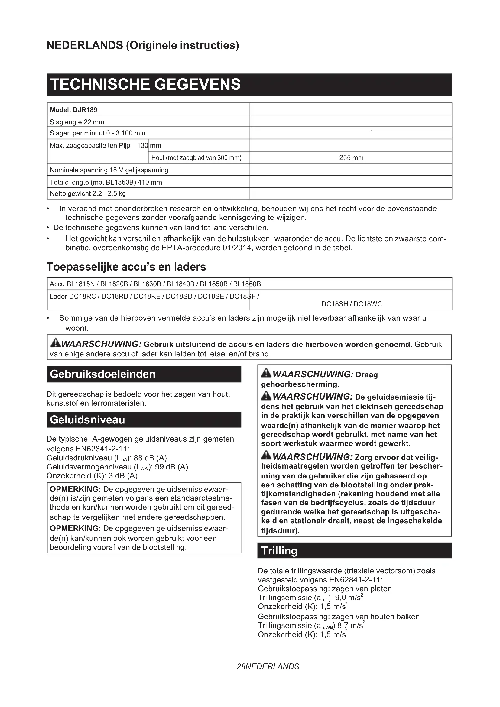 - Sommigevandehierbovenvermeldeaccu’senladerszijnmogelijknietleverbaarafhankelijkvanwaaru woont. WAARSCHUWING: Gebruik uitsluitend de accu’s en laders die hierboven worden genoemd. Gebruik van enige andere accu of lader kan leiden tot letsel en/of brand. Gebruiksdoeleinden Dit gereedschap is bedoeld voor het zagen van hout, kunststof en ferromaterialen. Geluidsniveau Detypische,A-gewogengeluidsniveauszijngemeten volgens EN62841-2-11: Geluidsdrukniveau (L