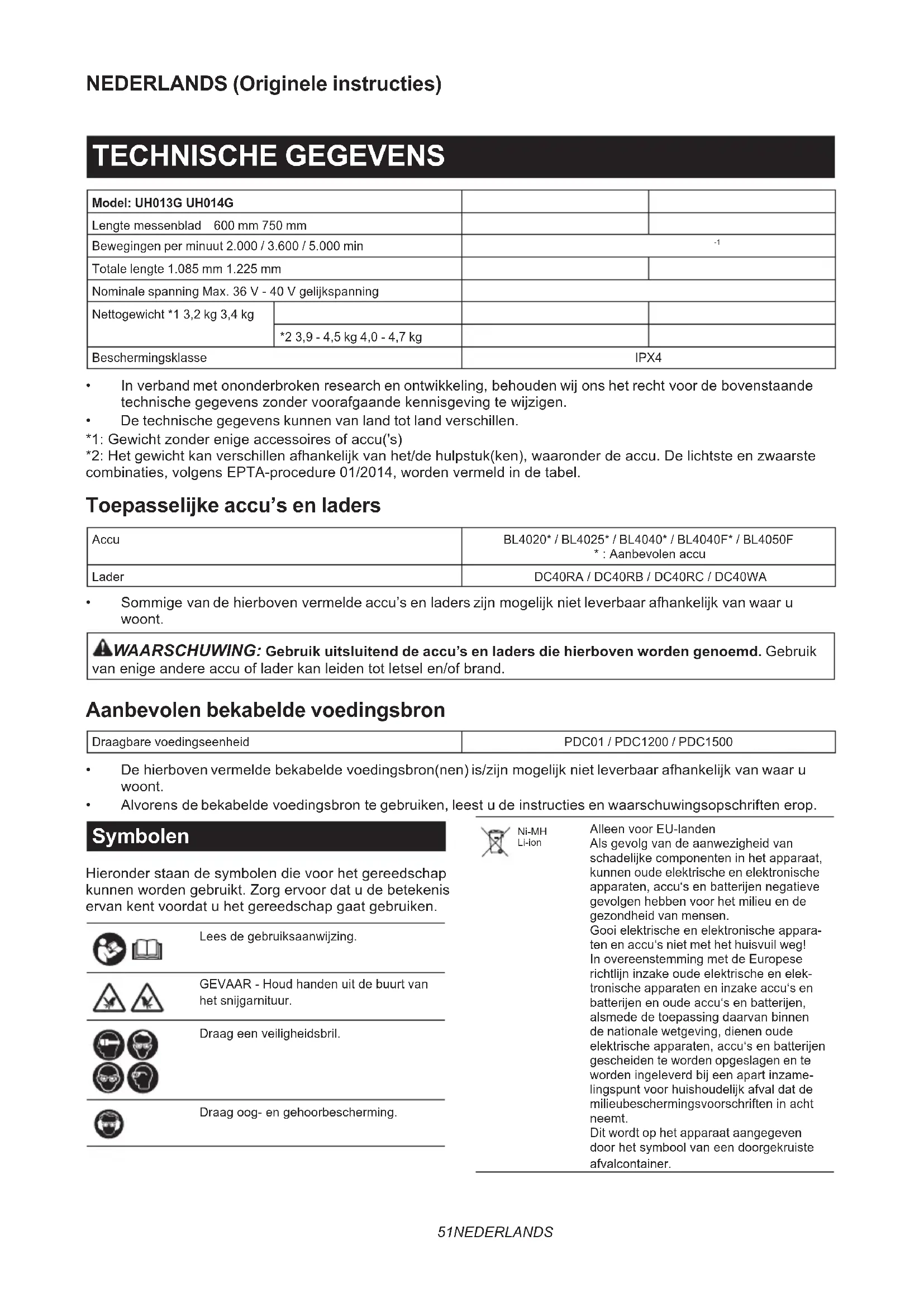 (dB (A)) Onzekerheid K (dB (A)) UH013G 83 3 93 91 2,4 UH014G 84 3 95 92 2,2 OPMERKING:Deopgegevengeluidsemissiewaarde(n)is/zijngemetenvolgenseenstandaardtestmethodeen kan/kunnenwordengebruiktomditgereedschaptevergelijkenmetanderegereedschappen. OPMERKING:Deopgegevengeluidsemissiewaarde(n)kan/kunnenookwordengebruiktvooreenbeoordeling voorafvandeblootstelling. WAARSCHUWING: Draag gehoorbescherming. WAARSCHUWING: De geluidsemissie tijdens het gebruik van het elektrisch gereedschap in de prak- tijk kan verschillen van de opgegeven waarde(n) afhankelijk van de manier waarop het gereedschap wordt gebruikt, met name van het soort werkstuk waarmee wordt gewerkt. WAARSCHUWING: Zorg ervoor dat veiligheidsmaatregelen worden getroen ter bescherming van de gebruiker die zijn gebaseerd op een schatting van de blootstelling onder praktijkomstandigheden (reke- ning houdend met alle fasen van de bedrijfscyclus, zoals de tijdsduur gedurende welke het gereedschap is uitgeschakeld en stationair draait, naast de ingeschakelde tijdsduur). Trilling Detotaletrillingswaarde(triaxialevectorsom)zoalsvastgesteldvolgensEN62841-4-2: Model Voorhandgreep Achterhandgreep ah (m/s