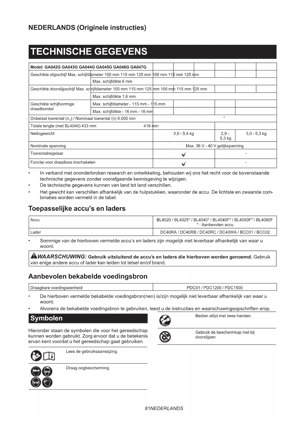 - Alvorens de bekabelde voedingsbron te gebruiken, leest u de instructies en waarschuwingsopschriften erop. Symbolen Hieronder staan de symbolen die voor het gereedschap kunnen worden gebruikt. Zorg ervoor dat u de betekenis ervan kent voordat u het gereedschap gaat gebruiken. Lees de gebruiksaanwijzing. Draag oogbescherming. Bedien altijd met twee handen. Gebruik de beschermkap niet bij doorslijpen.82 NEDERLANDS Ni-MH Li-ion Alleen voor EU-landen Als gevolg van de aanwezigheid van schadelijke componenten in het apparaat, kunnen oude elektrische en elektronische apparaten, accu‘s en batterijen negatieve gevolgen hebben voor het milieu en de gezondheid van mensen. Gooi elektrische en elektronische appara- ten en accu‘s niet met het huisvuil weg! In overeenstemming met de Europese richtlijn inzake oude elektrische en elek- tronische apparaten en inzake accu‘s en batterijen en oude accu‘s en batterijen, alsmede de toepassing daarvan binnen de nationale wetgeving, dienen oude elektrische apparaten, accu‘s en batterijen gescheiden te worden opgeslagen en te worden ingeleverd bij een apart inzame- lingspunt voor huishoudelijk afval dat de milieubeschermingsvoorschriften in acht neemt. Dit wordt op het apparaat aangegeven door het symbool van een doorgekruiste afvalcontainer. Gebruiksdoeleinden Het gereedschap is bedoeld voor het slijpen, draad- borstelen, schuren en doorslijpen van metaal en steen zonder gebruik van water. Geluidsniveau De typische, A-gewogen geluidsniveaus zijn gemeten volgens EN62841-2-3: Model Geluidsdrukniveau (L