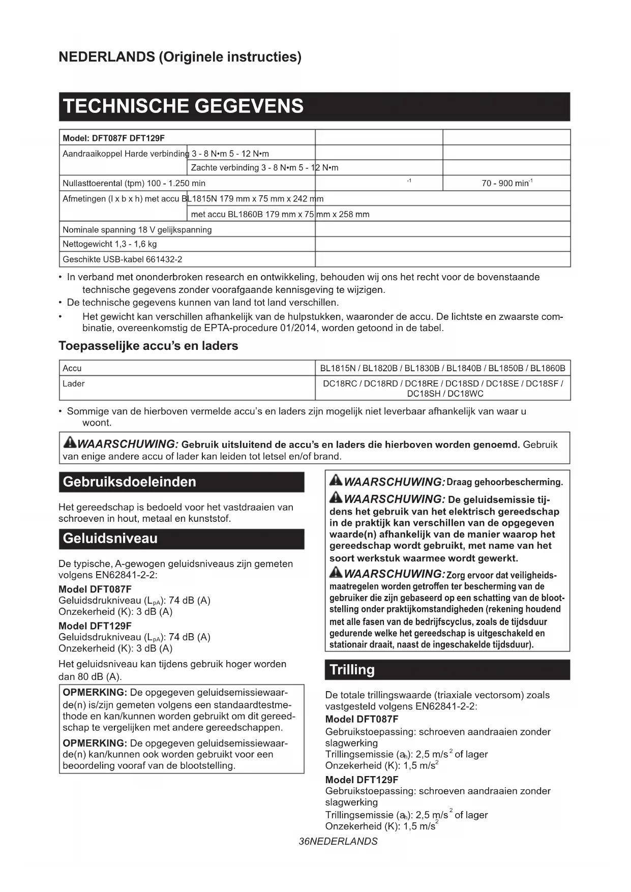 - Sommige van de hierboven vermelde accu’s en laders zijn mogelijk niet leverbaar afhankelijk van waar u woont. WAARSCHUWING: Gebruik uitsluitend de accu’s en laders die hierboven worden genoemd. Gebruik van enige andere accu of lader kan leiden tot letsel en/of brand. Gebruiksdoeleinden Het gereedschap is bedoeld voor het vastdraaien van schroeven in hout, metaal en kunststof. Geluidsniveau De typische, A-gewogen geluidsniveaus zijn gemeten volgens EN62841-2-2: Model DFT087F Geluidsdrukniveau (L