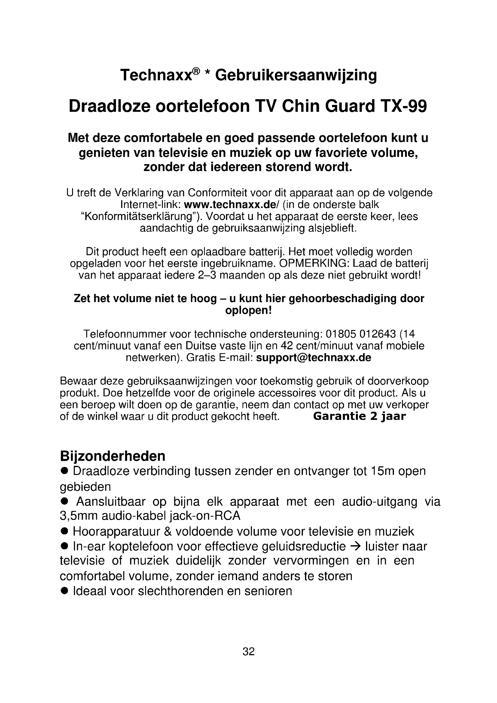 - Gebruikersaanwijzing Draadloze oortelefoon TV Chin Guard TX-99 Met deze comfortabele en goed passende oortelefoon kunt u genieten van televisie en muziek op uw favoriete volume, zonder dat iedereen storend wordt. U treft de Verklaring van Conformiteit voor dit apparaat aan op de volgende Internet-link: www.technaxx.de/ (in de onderste balk “Konformitätserklärung”). Voordat u het apparaat de eerste keer, lees aandachtig de gebruiksaanwijzing alsjeblieft. Dit product heeft een oplaadbare batterij. Het moet volledig worden opgeladen voor het eerste ingebruikname. OPMERKING: Laad de batterij van het apparaat iedere 2–3 maanden op als deze niet gebruikt wordt! Zet het volume niet te hoog – u kunt hier gehoorbeschadiging door oplopen! Telefoonnummer voor technische ondersteuning: 01805 012643 (14 cent/minuut vanaf een Duitse vaste lijn en 42 cent/minuut vanaf mobiele netwerken). Gratis E-mail: support@technaxx.de Bewaar deze gebruiksaanwijzingen voor toekomstig gebruik of doorverkoop produkt. Doe hetzelfde voor de originele accessoires voor dit product. Als u een beroep wilt doen op de garantie, neem dan contact op met uw verkoper of de winkel waar u dit product gekocht heeft. Garantie 2 jaar