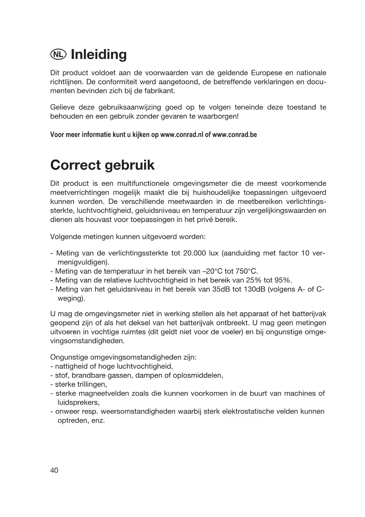 Inleiding Dit product voldoet aan de voorwaarden van de geldende Europese en nationale richtlijnen. De conformiteit werd aangetoond, de betreffende verklaringen en docu- menten bevinden zich bij de fabrikant. Gelieve deze gebruiksaanwijzing goed op te volgen teneinde deze toestand te behouden en een gebruik zonder gevaren te waarborgen! Voor meer informatie kunt u kijken op www.conrad.nl of www.conrad.be Correct gebruik Dit product is een multifunctionele omgevingsmeter die de meest voorkomende meetverrichtingen mogelijk maakt die bij huishoudelijke toepassingen uitgevoerd kunnen worden. De verschillende meetwaarden in de meetbereiken verlichtings- sterkte, luchtvochtigheid, geluidsniveau en temperatuur zijn vergelijkingswaarden en dienen als houvast voor toepassingen in het privé bereik. Volgende metingen kunnen uitgevoerd worden: - Meting van de verlichtingssterkte tot 20.000 lux (aanduiding met factor 10 ver- menigvuldigen). - Meting van de temperatuur in het bereik van –20°C tot 750°C. - Meting van de relatieve luchtvochtigheid in het bereik van 25% tot 95%. - Meting van het geluidsniveau in het bereik van 35dB tot 130dB (volgens A- of C- weging). U mag de omgevingsmeter niet in werking stellen als het apparaat of het batterijvak geopend zijn of als het deksel van het batterijvak ontbreekt. U mag geen metingen uitvoeren in vochtige ruimtes (dit geldt niet voor de voeler) en bij ongunstige omge- vingsomstandigheden. Ongunstige omgevingsomstandigheden zijn: - nattigheid of hoge luchtvochtigheid, - stof, brandbare gassen, dampen of oplosmiddelen, - sterke trillingen, - sterke magneetvelden zoals die kunnen voorkomen in de buurt van machines of luidsprekers, - onweer resp. weersomstandigheden waarbij sterk elektrostatische velden kunnen optreden, enz.41 Een ander gebruik dan hier beschreven heeft de beschadiging van het product tot gevolg. Dit is bovendien met gevaren verbonden zoals b.v. kortsluitingsgevaar, brandgevaar, elektrische schokken, enz. Het volledige product mag niet worden aangepast of omgebouwd! U dient te allen tijde de veiligheidsaanwijzingen in acht te nemen! Beschrijving van de onderdelen (Afbeelding op de uitklappagina) 1 Microfoon met afneembare windbescherming 2 Luchtvochtigheidsvoeler (vast gemonteerd) 3 Afneembare houder voor de luchtvochtigheidsvoeler met schroefaansluiting aan de achterkant 4 Bedieningstoetsen voor aan/uit, MAX-Hold, Data-HOLD en functiekeuze (SELECT) 5 Keuzeschakelaar voor het meetbereik 6 Batterijvak aan de achterkant 7 Aansluiting voor temperatuurvoeler type K (13) 8 Aansluiting voor de lichtsensor (10) 9 LCD-scherm (3,5-cijferig, grootste weergave: 1999; functiesymbolen zoals deci- male punt, polariteit (-), batterijsymbool, "%, °C, dB, Lux" en overschrijding van het bereik worden mede weergegeven) 10 Lichtsensor met zwarte beschermkap 11 Jack plug voor aansluiting (8) 12 Temperatuurvoeler (type K) 13 Aansluitstekker type K voor aansluiting (7) Gevaren en veiligheidsaanwijzingen Bij schade ten gevolge van niet-naleving van deze gebruiksaanwi- jzing vervalt het recht op garantie! Voor gevolgschade die uit een schadegeval voortvloeit zijn wij niet aansprakelijk! Bij materiële schade of persoonlijke ongelukken, die door onoor- deelkundig gebruik of niet-naleving van de veiligheidsaanwijzin- gen werden veroorzaakt, zijn wij niet aansprakelijk. In dergelijke gevallen vervalt elk recht op garantie.42 Dit meetapparaat heeft de fabriek in een veiligheidstechnisch perfecte toestand ver- laten. Om deze toestand te bewaren en een gebruik zonder gevaren te waarborgen, dient de gebruiker de veiligheidsaanwijzingen en waarschuwingsaantekeningen ("Waar- schuwing!" en "Wenk!") van deze gebruiksaanwijzing aandachtig op te volgen. Volgende symbolen moeten in acht genomen worden: Wenk! Lees de gebruiksaanwijzing! Meetapparatuur en toebehoren zijn geen speelgoed en moeten buiten het bereik van kinderen worden gehouden! In bedrijven dienen de voorschriften ter voorkoming van ongevallen t.a.v. elektrische installaties en productiemiddelen te worden opgevolgd. In scholen, opleidingscentra, hobbyruimtes en doe-het-zelf werkplaatsen dient de omgang met het meetapparaat door vakkundig personeel te worden gecontroleerd. Controleer uw meetapparaat en de meetsnoeren vóór elke meting op beschadi- ging(en). Verricht in geen geval metingen indien de beschermende isolatie bescha- digd is of scheuren vertoont. U mag enkel temperatuurmetingen aan spanningsloze onderdelen verrichten. De meetingang is tot 60 VDC en 24 VAC beveiligd. Wanneer kan worden aangenomen dat een veilig gebruik van het meetapparaat niet meer mogelijk is, dient u het toestel buiten werking te stellen en tegen onopzettelijk gebruik te beveiligen. Er mag worden aangenomen, dat een veilig gebruik van het meetapparaat niet meer mogelijk is indien - er beschadigingen aan het apparaat zichtbaar zijn, - het apparaat niet meer functioneert en - na lange opslag onder ongunstige omstandigheden of - na zware transportbelastingen. Schakel het meetapparaat nooit onmiddellijk in nadat het toestel van een koude naar een warme ruimte werd gebracht. Het condensatiewater dat hierbij gevormd wordt kan onder bepaalde omstandigheden uw meetapparaat vernielen. Schakel het appa- raat niet direct in, maar laat het eerst op kamertemperatuur komen. U mag verpakkingsmateriaal niet zomaar laten liggen. Plastic zakken en folies, onderdelen uit piepschuim, enz. zijn gevaarlijk speelgoed voor kinderen.43 Gelieve tevens de veiligheidsaanwijzingen in de afzonderlijke hoofdstukken van deze gebruiksaanwijzing nauwgezet op te volgen. Functiebeschrijving De multifunctionele omgevingsmeter 4 in 1 combineert de vier meest gebruikte omgevingsmeetprocedures voor hobbytoepassingen en het huishouden. De omgevingsmeter voert vergelijkingsmetingen uit van de verlichtingssterkte in lux, de relatieve luchtvochtigheid in %, het geluidsniveau in dB (decibel) en de tempera- tuur in °C. De omgevingsmeter bezit een automatische uitschakelfunctie (