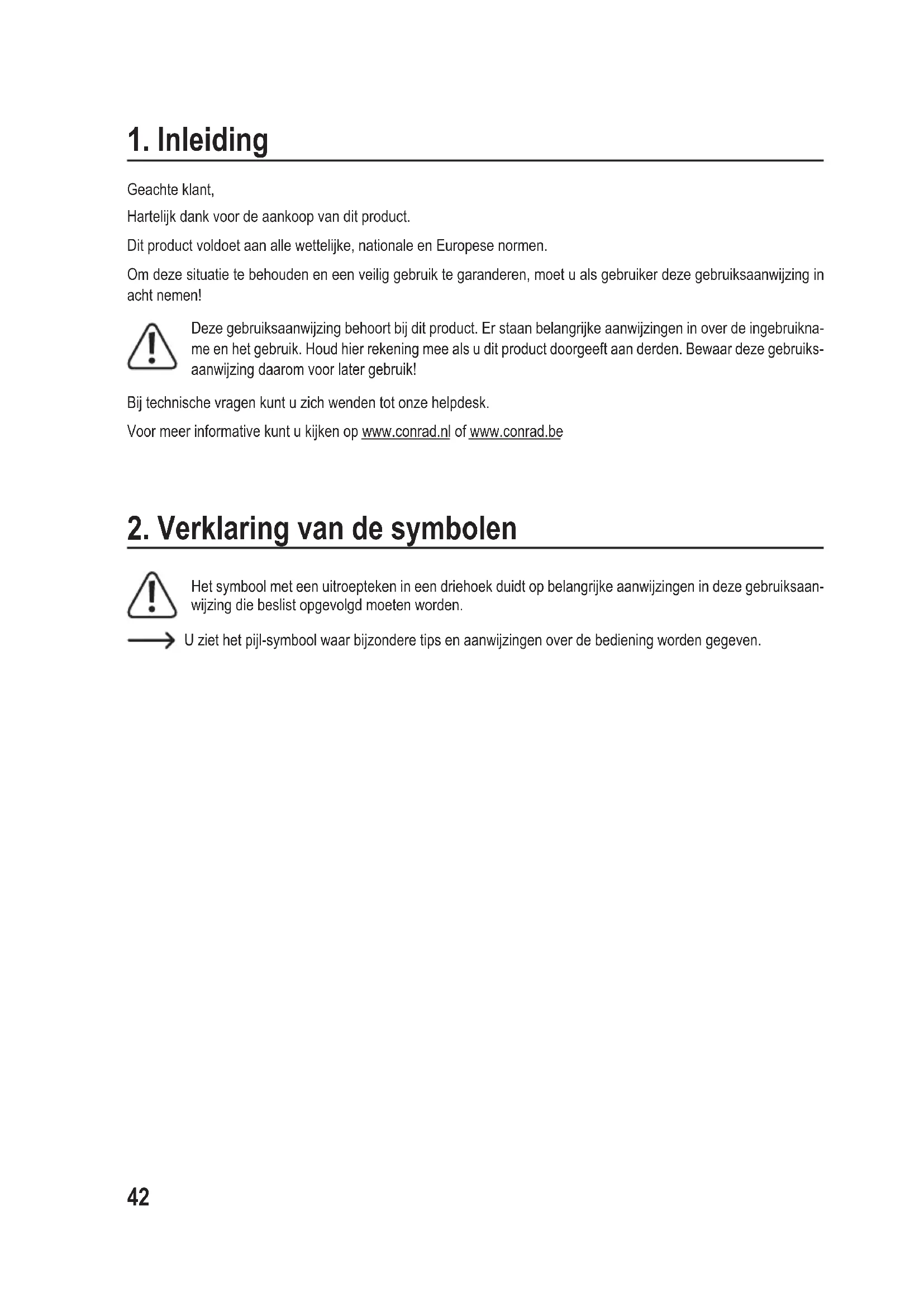 Geachte klant, Hartelijk dank voor de aankoop van dit product. Dit product voldoet aan alle wettelijke, nationale en Europese normen. Om deze situatie te behouden en een veilig gebruik te garanderen, moet u als gebruiker deze gebruiksaanwijzing in acht nemen! Deze gebruiksaanwijzing behoort bij dit product. Er staan belangrijke aanwijzingen in over de ingebruikna- me en het gebruik. Houd hier rekening mee als u dit product doorgeeft aan derden. Bewaar deze gebruiks- aanwijzing daarom voor later gebruik! Bij technische vragen kunt u zich wenden tot onze helpdesk. Voor meer informative kunt u kijken op www.conrad.nl of www.conrad.be
