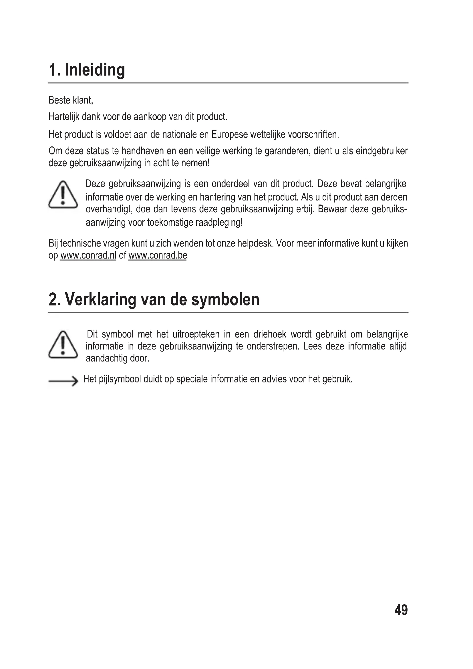 Beste klant, Hartelijk dank voor de aankoop van dit product. Het product is voldoet aan de nationale en Europese wettelijke voorschriften. Om deze status te handhaven en een veilige werking te garanderen, dient u als eindgebruiker deze gebruiksaanwijzing in acht te nemen! Deze gebruiksaanwijzing is een onderdeel van dit product. Deze bevat belangrijke informatie over de werking en hantering van het product. Als u dit product aan derden overhandigt, doe dan tevens deze gebruiksaanwijzing erbij. Bewaar deze gebruiks- aanwijzing voor toekomstige raadpleging! Bij technische vragen kunt u zich wenden tot onze helpdesk. Voor meer informative kunt u kijken op www.conrad.nl of www.conrad.be