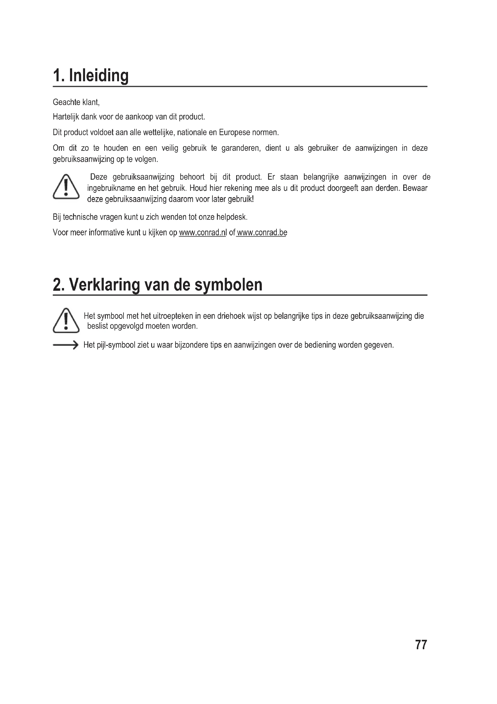 Geachte klant, Hartelijk dank voor de aankoop van dit product. Dit product voldoet aan alle wettelijke, nationale en Europese normen. Om dit zo te houden en een veilig gebruik te garanderen, dient u als gebruiker de aanwijzingen in deze gebruiksaanwijzing op te volgen. Deze gebruiksaanwijzing behoort bij dit product. Er staan belangrijke aanwijzingen in over de ingebruikname en het gebruik. Houd hier rekening mee als u dit product doorgeeft aan derden. Bewaar deze gebruiksaanwijzing daarom voor later gebruik! Bij technische vragen kunt u zich wenden tot onze helpdesk. Voor meer informative kunt u kijken op www.conrad.nl of www.conrad.be