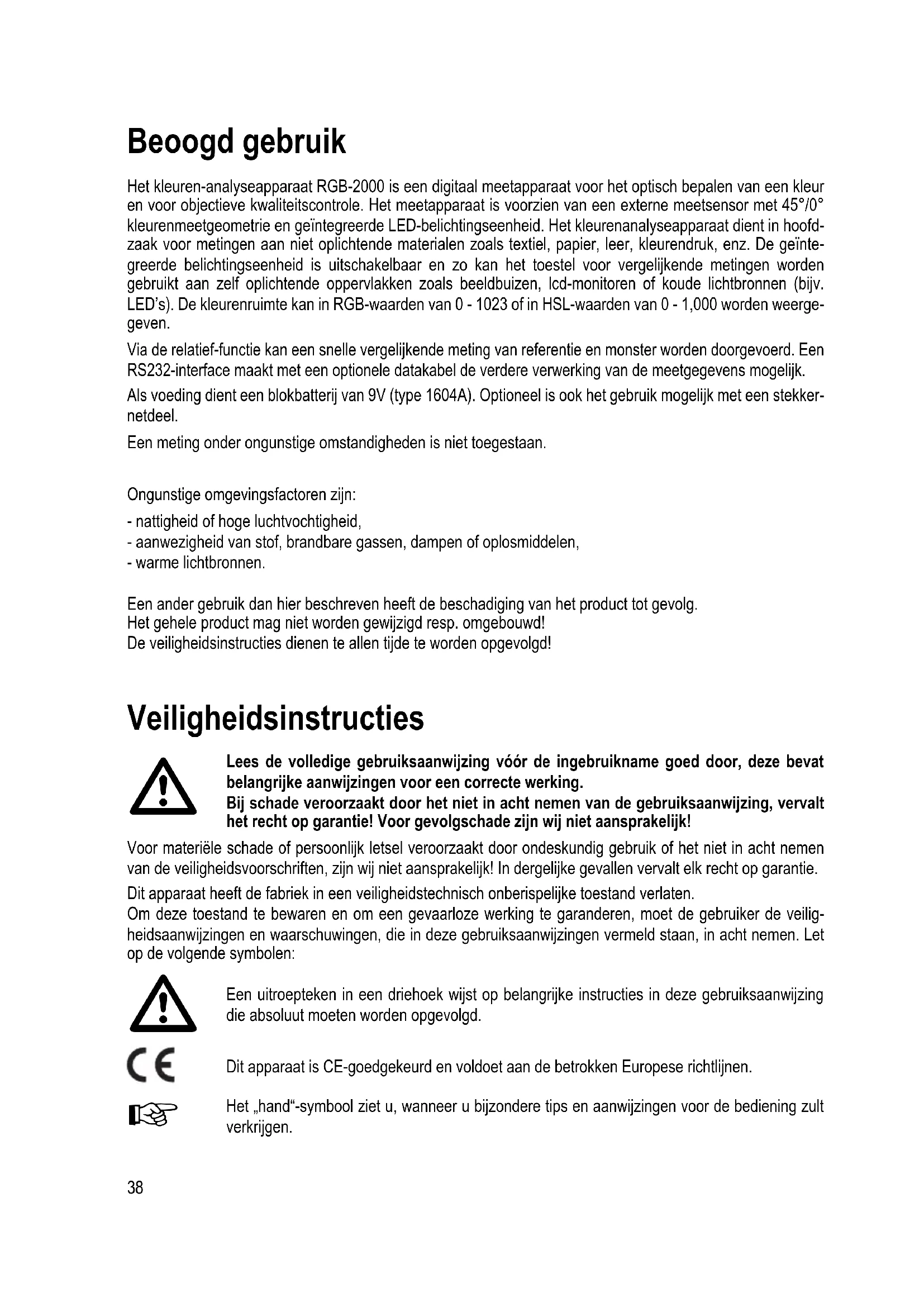 - Technische gegevens Beoogd gebruik Het kleuren-analyseapparaat RGB-2000 is een digitaal meetapparaat voor het optisch bepalen van een kleur en voor objectieve kwaliteitscontrole. Het meetapparaat is voorzien van een externe meetsensor met 45°/0° kleurenmeetgeometrie en geïntegreerde LED-belichtingseenheid. Het kleurenanalyseapparaat dient in hoofd- zaak voor metingen aan niet oplichtende materialen zoals textiel, papier, leer, kleurendruk, enz. De geïnte- greerde belichtingseenheid is uitschakelbaar en zo kan het toestel voor vergelijkende metingen worden gebruikt aan zelf oplichtende oppervlakken zoals beeldbuizen, lcd-monitoren of koude lichtbronnen (bijv. LED’s). De kleurenruimte kan in RGB-waarden van 0 - 1023 of in HSL-waarden van 0 - 1,000 worden weerge- geven. Via de relatief-functie kan een snelle vergelijkende meting van referentie en monster worden doorgevoerd. Een RS232-interface maakt met een optionele datakabel de verdere verwerking van de meetgegevens mogelijk. Als voeding dient een blokbatterij van 9V (type 1604A). Optioneel is ook het gebruik mogelijk met een stekker- netdeel. Een meting onder ongunstige omstandigheden is niet toegestaan. Ongunstige omgevingsfactoren zijn: - nattigheid of hoge luchtvochtigheid, - aanwezigheid van stof, brandbare gassen, dampen of oplosmiddelen, - warme lichtbronnen. Een ander gebruik dan hier beschreven heeft de beschadiging van het product tot gevolg. Het gehele product mag niet worden gewijzigd resp. omgebouwd! De veiligheidsinstructies dienen te allen tijde te worden opgevolgd! Veiligheidsinstructies Lees de volledige gebruiksaanwijzing vóór de ingebruikname goed door, deze bevat belangrijke aanwijzingen voor een correcte werking. Bij schade veroorzaakt door het niet in acht nemen van de gebruiksaanwijzing, vervalt het recht op garantie! Voor gevolgschade zijn wij niet aansprakelijk! Voor materiële schade of persoonlijk letsel veroorzaakt door ondeskundig gebruik of het niet in acht nemen van de veiligheidsvoorschriften, zijn wij niet aansprakelijk! In dergelijke gevallen vervalt elk recht op garantie. Dit apparaat heeft de fabriek in een veiligheidstechnisch onberispelijke toestand verlaten. Om deze toestand te bewaren en om een gevaarloze werking te garanderen, moet de gebruiker de veilig- heidsaanwijzingen en waarschuwingen, die in deze gebruiksaanwijzingen vermeld staan, in acht nemen. Let op de volgende symbolen: Een uitroepteken in een driehoek wijst op belangrijke instructies in deze gebruiksaanwijzing die absoluut moeten worden opgevolgd. Dit apparaat is CE-goedgekeurd en voldoet aan de betrokken Europese richtlijnen. Het „hand“-symbool ziet u, wanneer u bijzondere tips en aanwijzingen voor de bediening zult verkrijgen. p. 4738