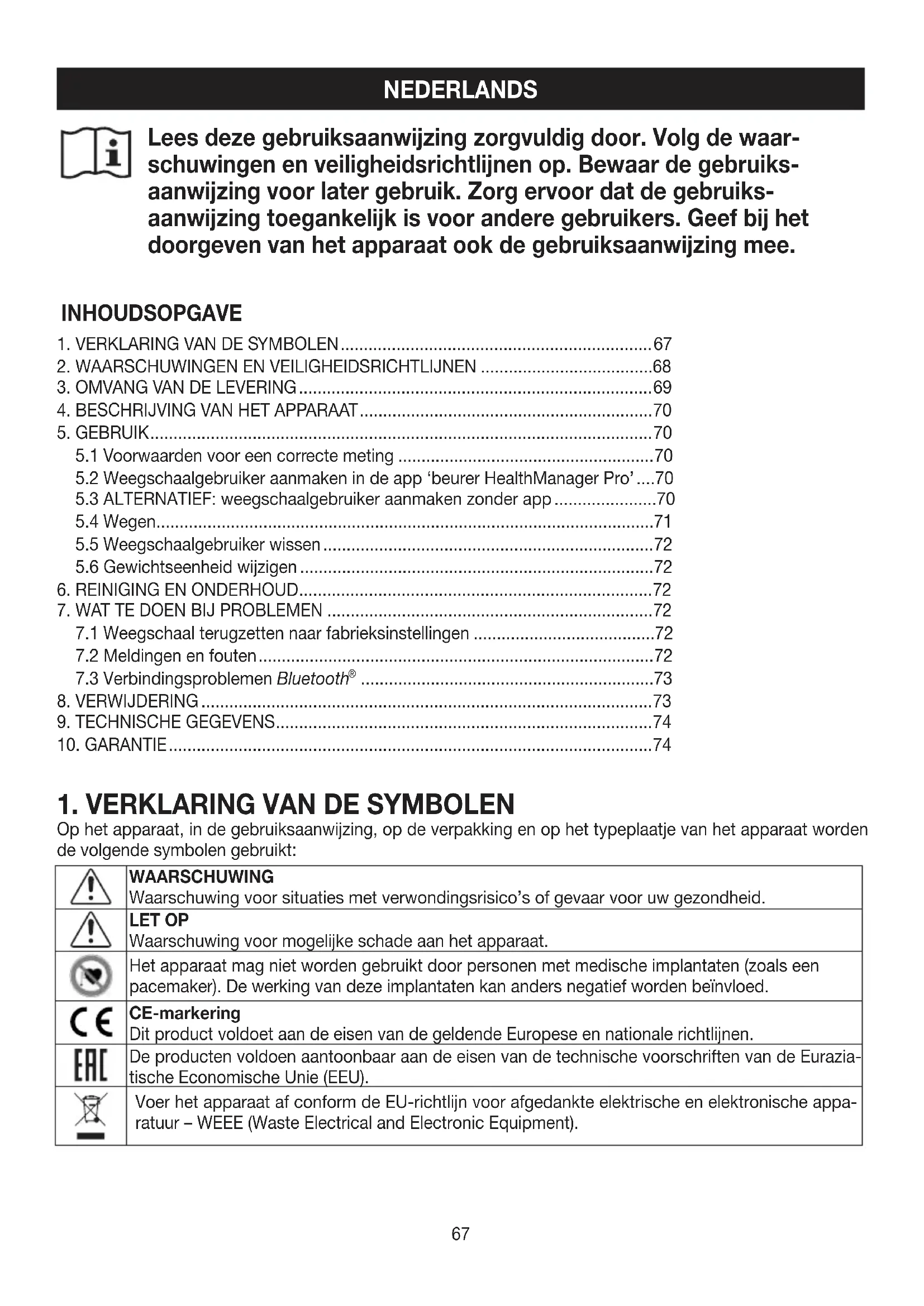low energy technology Frequentieband: 2402 - 2480 MHz, zendvermogen max. +4dBm Systeemvereisten en lijst met compatibele apparaten voor de app ‘beurer HealthManager Pro’* Technische wijzigingen voorbehouden. *Dit product voldoet aan de eisen van de geldende Europese richtlijnen. In overeenstemming met de volgende Europese richtlijnen is de CE-markering aangebracht: Richtlijn 2014/53/EU (Radio Equipment Directive - RED) De conformiteitsverklaring van dit product vindt u op: https://www.beurer.com/web/we-landingpages/de/cedeclarationofconformity.php