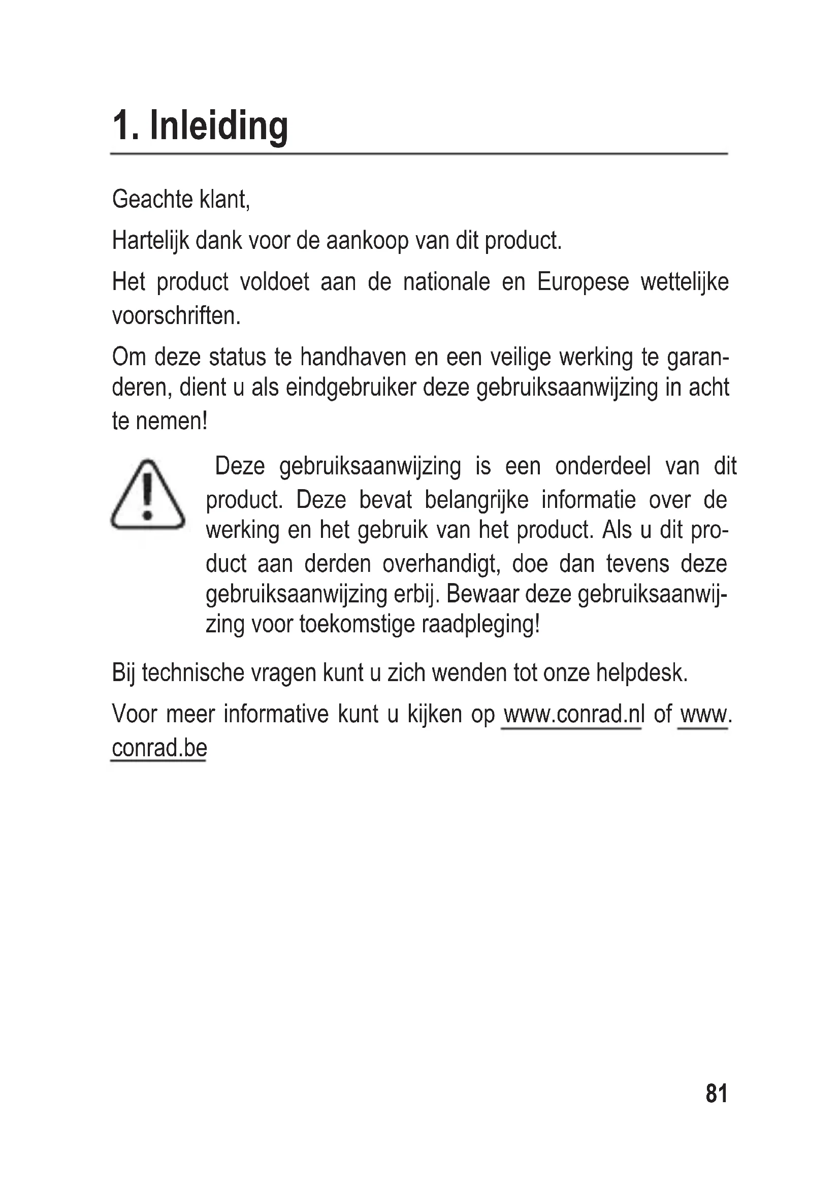 Geachte klant, Hartelijk dank voor de aankoop van dit product. Het product voldoet aan de nationale en Europese wettelijke voorschriften. Om deze status te handhaven en een veilige werking te garan- deren, dient u als eindgebruiker deze gebruiksaanwijzing in acht te nemen! Deze gebruiksaanwijzing is een onderdeel van dit product. Deze bevat belangrijke informatie over de werking en het gebruik van het product. Als u dit pro- duct aan derden overhandigt, doe dan tevens deze gebruiksaanwijzing erbij. Bewaar deze gebruiksaanwij- zing voor toekomstige raadpleging! Bij technische vragen kunt u zich wenden tot onze helpdesk. Voor meer informative kunt u kijken op www.conrad.nl of www. conrad.be