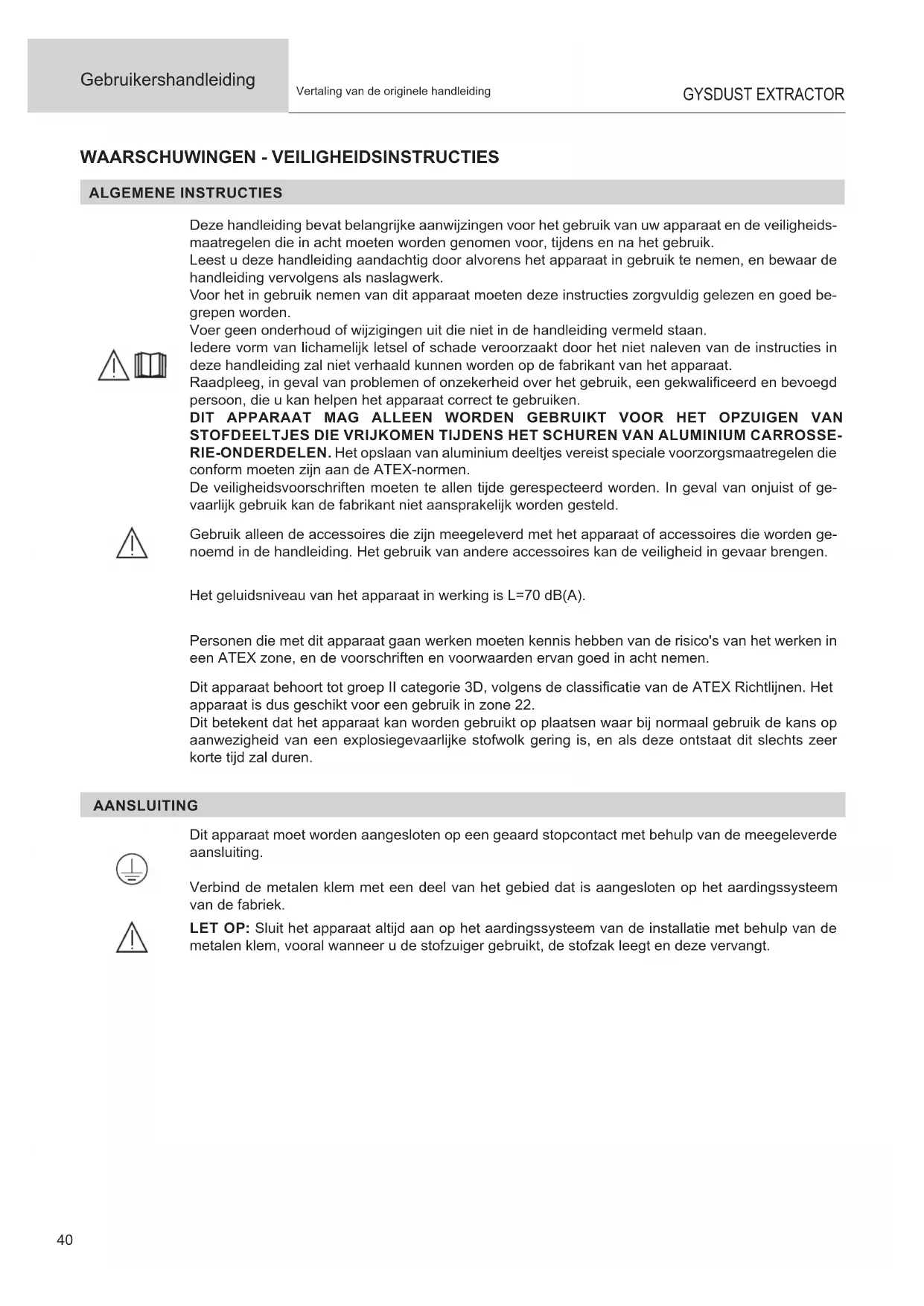 - Afzonderlijke inzameling vereist. Apparaat niet weggooien met het huishoudelijk afval.42 Gebruikershandleiding GYSDUST EXTRACTOR Vertaling van de originele handleiding EN 60335-2-69 EN 60335-2-69 Het stof-compartiment moet geleegd worden als het vol is. Het moet tevens geleegd worden na ieder gebruik. Voor stofdeeltjes waarvan de ontstekingsenergie lager is dan 1mJ kunnen verdere restricties, die voortvloeien uit de Arbowet, van toepassing zijn. Type 22 apparaten zijn niet geschikt voor het opzuigen van stofdeeltjes of vloeistoen die een ve- rhoogd explosie-risico hebben, of melanges van brandbare stoen en vloeistoen. WAARSCHUWING - Gebruik alleen accessoires die zijn goedgekeurd door de fabrikant voor het ge- bruik van Type 22. Het gebruik van andere accessoires kan ontplongen veroorzaken. WAARSCHUWING - Gebruik alleen accessoires die zijn goedgekeurd voor een gebruik in zones die beveiligd zijn tegen ontlading van statische elektriciteit (Electro Protected Area). Het gebruik van an- dere accessoires kan elektro-statische ontladingen veroorzaken. Het apparaat mag alleen aan worden gezet wanneer alle lters, inclusief de luchtlters voor het afkoe- len van de motor, correct op hun plaats zijn en niet beschadigd zijn. De stofzuigers Type EPA zijn geschikt voor een aansluiting aan apparatuur die stof produceren in EPA zones. De gebruikers van dit apparaat moeten er goed opletten dat er geen ontvlambare elementen worden opgezogen. De geleidende delen van deze apparaten, inclusief afzuig-apparatuur en de ge- leidende onderdelen van Klasse II apparaten moeten geaard worden door middel van een elektro-sta- tisch element. Het elektro-statisch aarden kan worden gerealiseerd door middel van de stofzuiger, of door een onafhankelijk aarde-dispositief. De stofzuigers Type 1 en Type EPA zijn niet geschikt voor gebruik met apparaten waarin ontvlambare bronnen worden gecreëerd. PNEUMATISCH De luchtdruk aan de ingang moet lager of gelijk zijn aan 10 bar. Bij een hogere pneumatische druk dan die wordt aanbevolen zal het apparaat minder goed werken en kan er een verlies van zuigkracht ontstaan. In dit geval moet u de luchtdruk aan de ingang van het apparaat en binnenin het apparaat controleren. (Afstellen max. 4 bar). Het afzuigsysteem zal minder goed of niet meer functioneren wanneer de zak vol is of verstopt is geraakt. In dit geval moet u een nieuwe stofzak plaatsen. Bij het kiezen van de stofzak dient u de aanwijzingen van de fabrikant op te volgen. Droge, gelterde luchttoevoer. SCHUURMACHINE U kunt een pneumatische schuurmachine (niet meegeleverd) met een zuigmond Ø32 mm op de stofzuiger aansluiten. Deze kan tevens worden aangesloten op het pneumatisch circuit, door middel van het automatische mondstuk in de afzuigslang. WAARSCHUWING Volg de volgende aanwijzingen nauwgezet op :