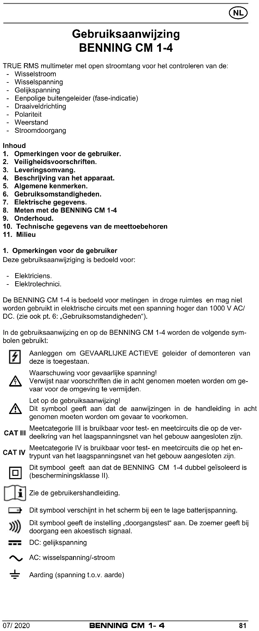 TRUE RMS multimeter met open stroomtang voor het controleren van de: - Wisselstroom - Wisselspanning - Gelijkspanning - Eenpolige buitengeleider (fase-indicatie) - Draaiveldrichting - Polariteit - Weerstand - StroomdoorgangInhoud1. Opmerkingen voor de gebruiker.2. Veiligheidsvoorschriften.3. Leveringsomvang.4. Beschrijving van het apparaat.5. Algemene kenmerken.6. Gebruiksomstandigheden.7. Elektrische gegevens.8. Meten met de BENNING CM 1-49. Onderhoud.10. Technische gegevens van de meettoebehoren11. Milieu1. Opmerkingen voor de gebruikerDeze gebruiksaanwijziging is bedoeld voor: - Elektriciens. - Elektrotechnici.De BENNING CM 1-4 is bedoeld voor metingen in droge ruimtes en mag niet worden gebruikt in elektrische circuits met een spanning hoger dan 1000 V AC/DC. (zie ook pt. 6: „Gebruiksomstandigheden“).In de gebruiksaanwijzing en op de BENNING CM 1-4 worden de volgende sym-bolen gebruikt:Aanleggen om GEVAARLIJKE ACTIEVE geleider of demonteren van deze is toegestaan. Waarschuwing voor gevaarlijke spanning!Verwijst naar voorschriften die in acht genomen moeten worden om ge-vaar voor de omgeving te vermijden. Let op de gebruiksaanwijzing!Dit symbool geeft aan dat de aanwijzingen in de handleiding in acht genomen moeten worden om gevaar te voorkomen.CAT IIIMeetcategorie III is bruikbaar voor test- en meetcircuits die op de ver-deelkring van het laagspanningsnet van het gebouw aangesloten zijn.CAT IVMeetcategorie IV is bruikbaar voor test- en meetcircuits die op het en-trypunt van het laagspanningsnet van het gebouw aangesloten zijn. Dit symbool geeft aan dat de BENNING CM 1-4 dubbel geïsoleerd is (bescherminingsklasse II).Zie de gebruikershandleiding.Dit symbool verschijnt in het scherm bij een te lage batterijspanning.Dit symbool geeft de instelling „doorgangstest“ aan. De zoemer geeft bij doorgang een akoestisch signaal.DC: gelijkspanning AC: wisselspanning/-stroom Aarding (spanning t.o.v. aarde)82