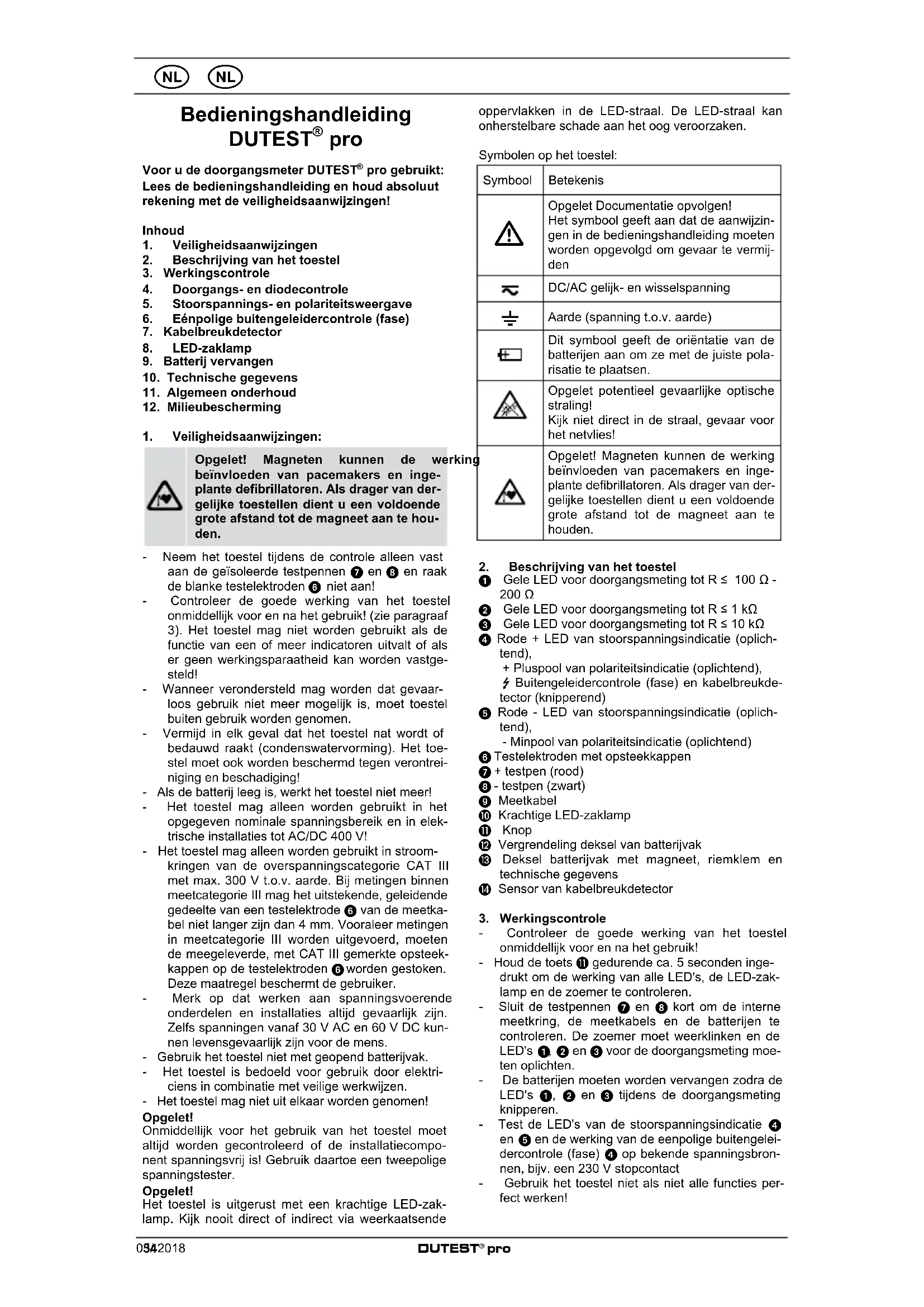 - Batterijen: 3 x Mignon, LR06/ AA (1,5 V) - Gewicht: ca. 130 g - Meetleiding met testgrepen: ca. 1000 mm - Bedrijfstemperatuurbereik: - 15 °C tot + 55 °C - Bewaartemperatuurbereik: - 15 °C tot + 55 °C - Relatieve luchtvochtigheid: 20 % tot 80 % - Lichtsterkte van de LED-zaklamp: Stand 1 (25%), stand 2 (50%), stand 3 (75%), stand 4 (100%) 11.Algemeenonderhoud Reinig het toestel aan de buitenkant met een schone, droge doek. Als verontreinigingen of afzettingen ter hoogte van de batterij of de batterijbehuizing voorhan- den zijn. Reinig ook deze met een droge doek. Haal de batterijen uit het toestel als u het toestel gedu- rende lange tijd niet gebruikt! 12.Milieubescherming Breng de lege batterijen en het toestel op het einde van zijn levensduur naar de daartoe bestemde inzamelpunten.05/ 2018 DUTEST