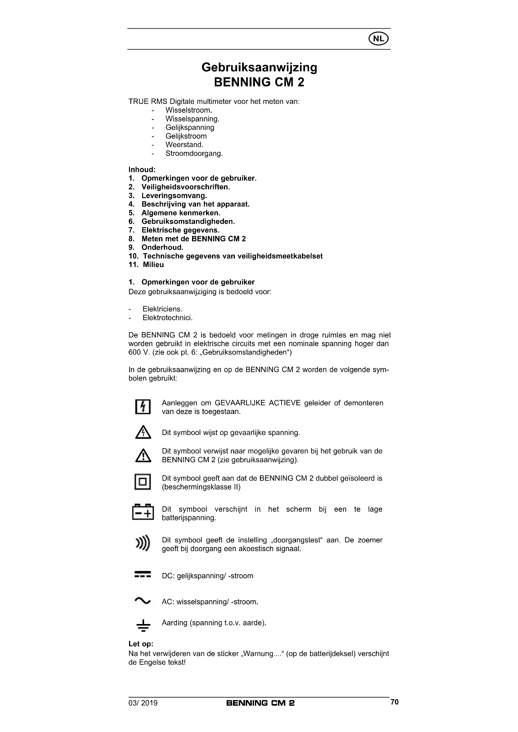 Deze gebruiksaanwijziging is bedoeld voor: - Elektriciens. - Elektrotechnici. De BENNING CM 2 is bedoeld voor metingen in droge ruimtes en mag niet worden gebruikt in elektrische circuits met een nominale spanning hoger dan 600 V. (zie ook pt. 6: „Gebruiksomstandigheden“) In de gebruiksaanwijzing en op de BENNING CM 2 worden de volgende sym- bolen gebruikt: Aanleggen om GEVAARLIJKE ACTIEVE geleider of demonteren van deze is toegestaan.