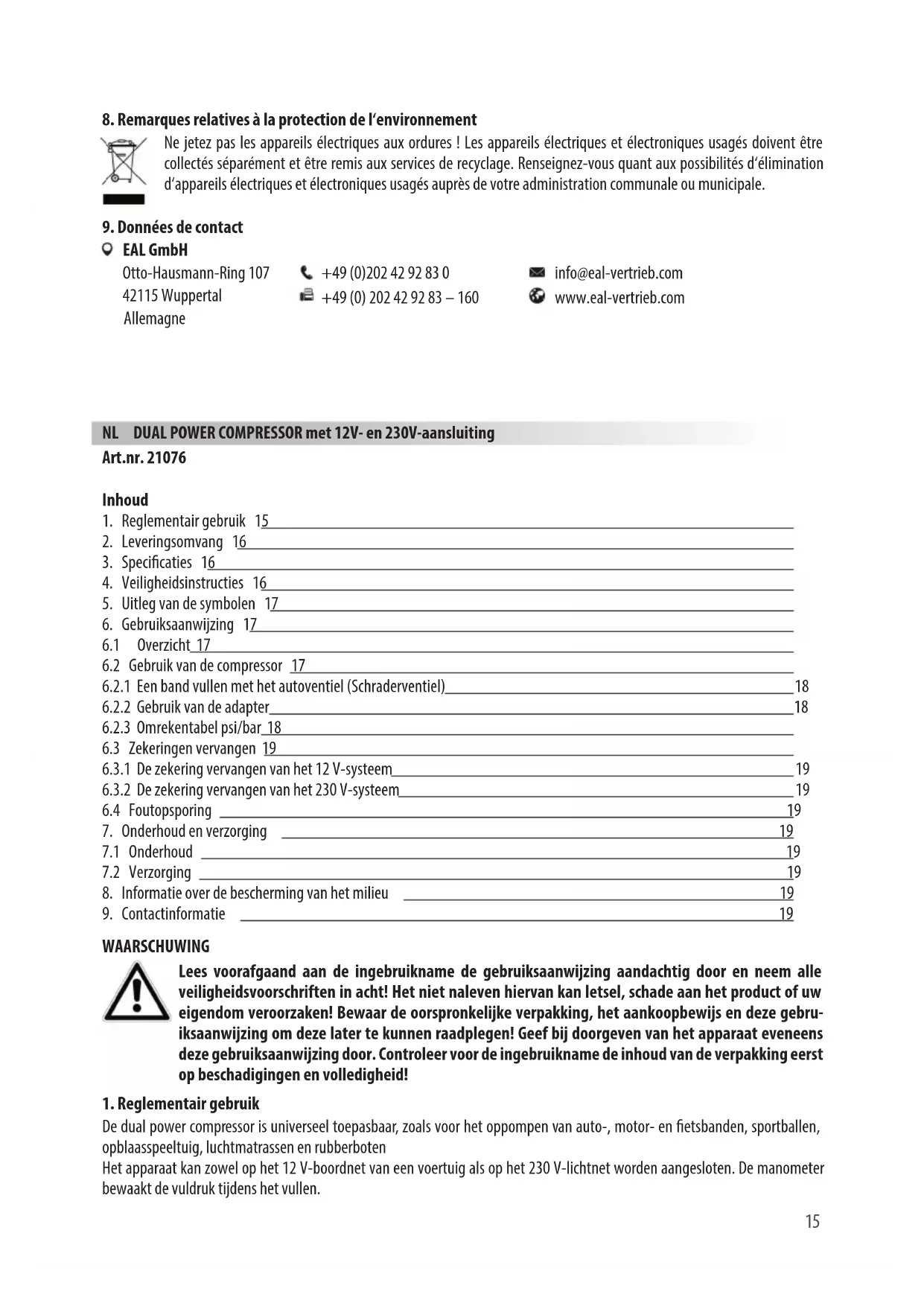 De dual power compressor is universeel toepasbaar, zoals voor het oppompen van auto-, motor- en etsbanden, sportballen, opblaasspeeltuig, luchtmatrassen en rubberboten Het apparaat kan zowel op het 12 V-boordnet van een voertuig als op het 230 V-lichtnet worden aangesloten. De manometer bewaakt de vuldruk tijdens het vullen. EAL GmbH Otto-Hausmann-Ring 107 42115 Wuppertal Allemagne +49 (0)202 42 92 83 0 +49 (0) 202 42 92 83 – 160 info@eal-vertrieb.com www.eal-vertrieb.com16