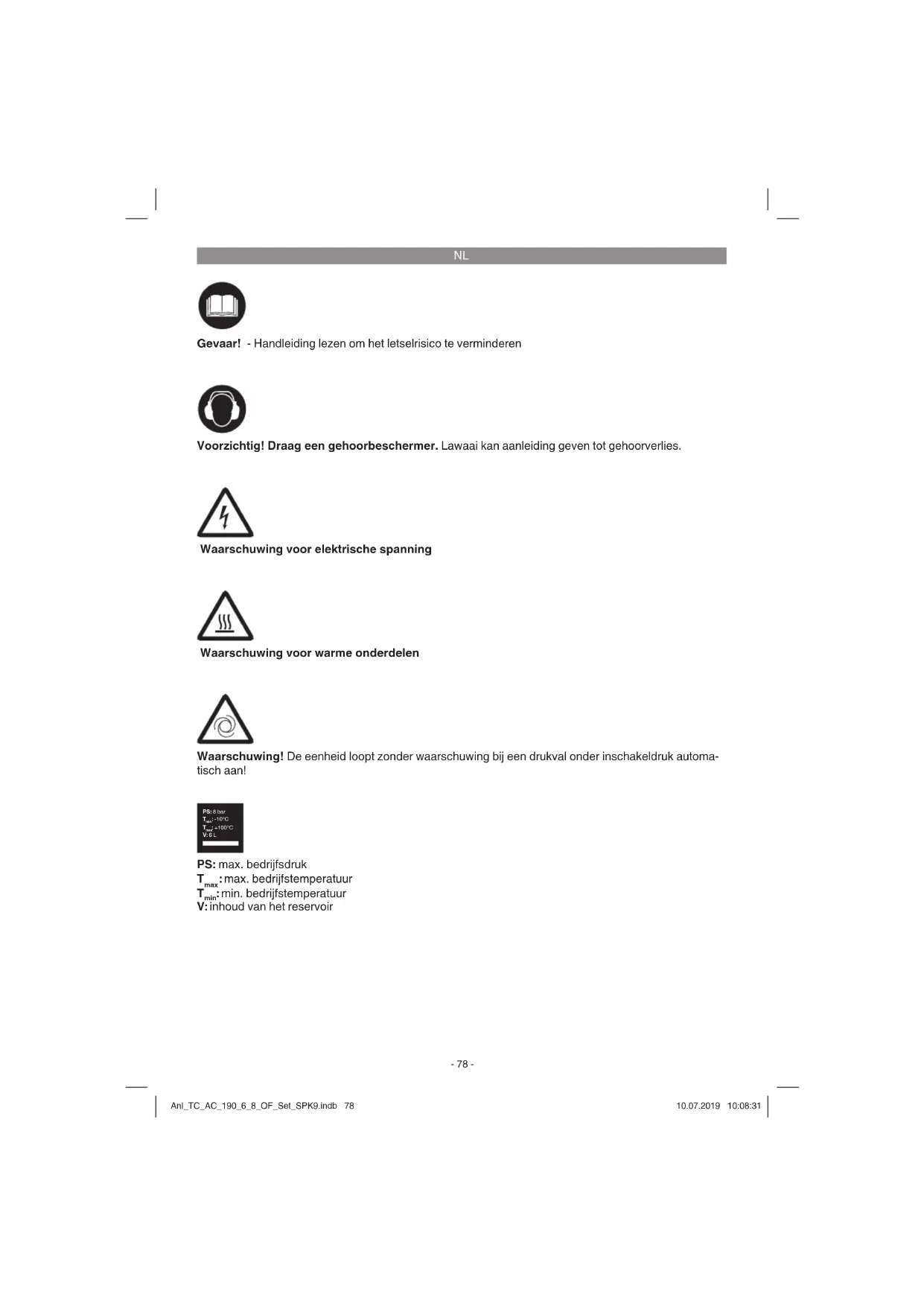 Voorzichtig! Draag een gehoorbeschermer. Lawaai kan aanleiding geven tot gehoorverlies. Gevaar! - Handleiding lezen om het letselrisico te verminderen Waarschuwing voor elektrische spanning Waarschuwing voor warme onderdelen Waarschuwing! De eenheid loopt zonder waarschuwing bij een drukval onder inschakeldruk automa- tisch aan! PS: max. bedrijfsdruk