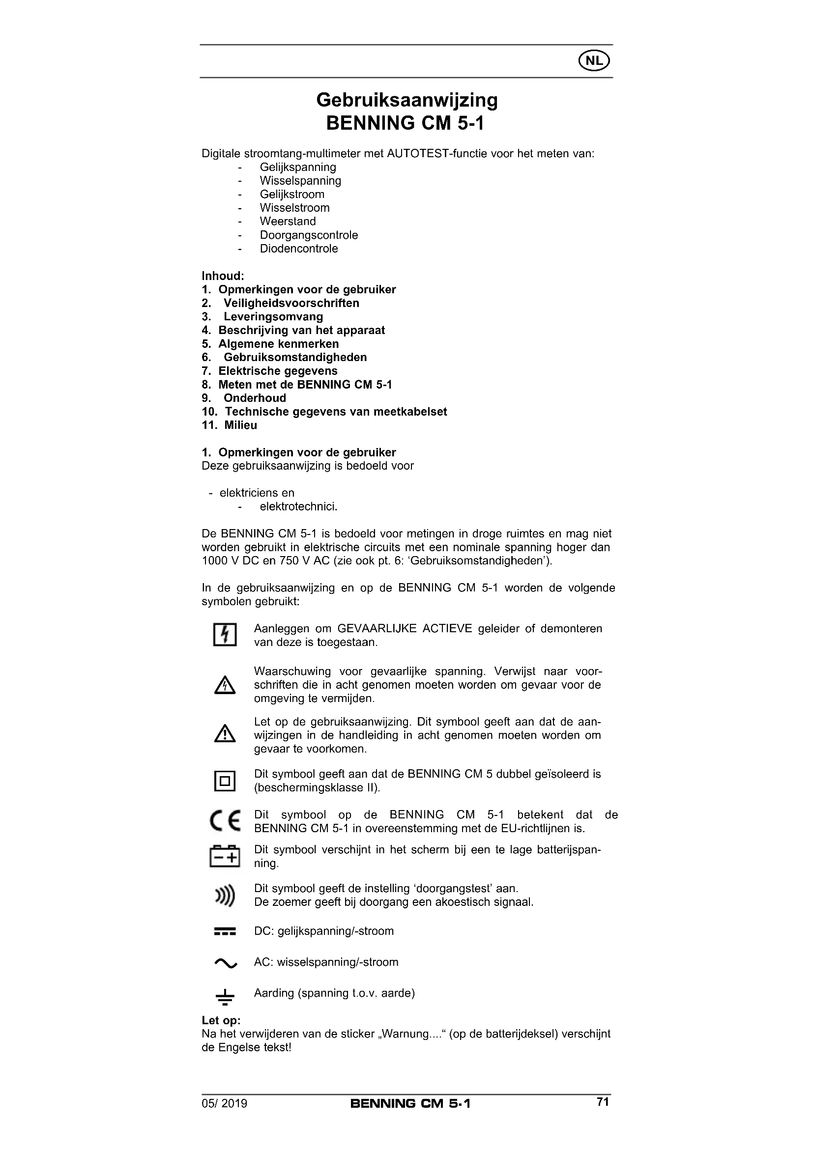 Wij raden u aan het apparaat aan het einde van zijn nuttige levens- duur, niet bij het gewone huisafval te deponeren, maar op de daar- voor bestemde adressen.BENNING CM 5-1 05/ 2019