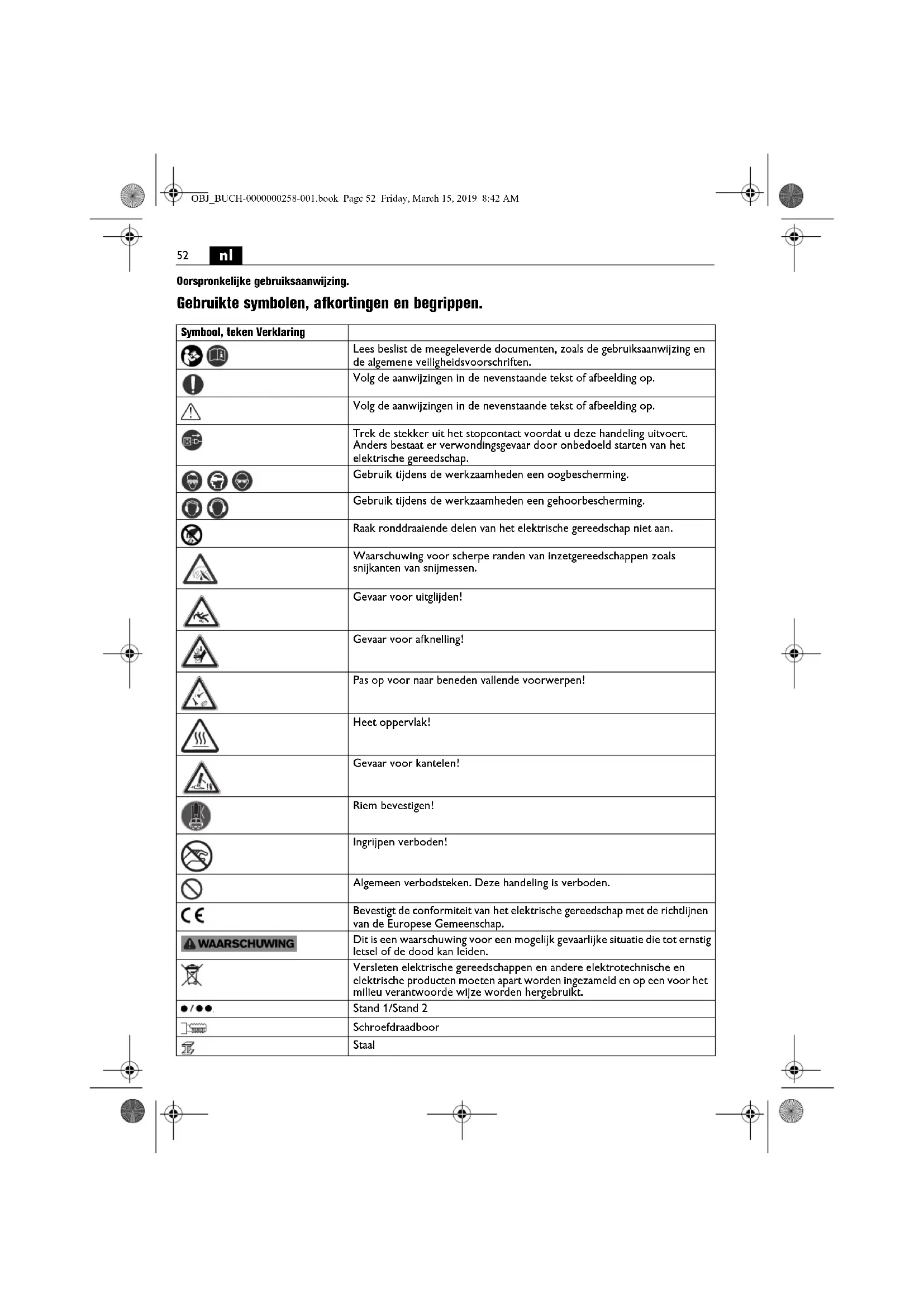 Oorspronkelijke gebruiksaanwijzing. Gebruikte symbolen, afkortingen en begrippen. Symbool, teken Verklaring Lees beslist de meegeleverde documenten, zoals de gebruiksaanwijzing en de algemene veiligheidsvoorschriften. Volg de aanwijzingen in de nevenstaande tekst of afbeelding op. Volg de aanwijzingen in de nevenstaande tekst of afbeelding op. Trek de stekker uit het stopcontact voordat u deze handeling uitvoert. Anders bestaat er verwondingsgevaar door onbedoeld starten van het elektrische gereedschap. Gebruik tijdens de werkzaamheden een oogbescherming. Gebruik tijdens de werkzaamheden een gehoorbescherming. Raak ronddraaiende delen van het elektrische gereedschap niet aan. Waarschuwing voor scherpe randen van inzetgereedschappen zoals snijkanten van snijmessen. Gevaar voor uitglijden! Gevaar voor afknelling! Pas op voor naar beneden vallende voorwerpen! Heet oppervlak! Gevaar voor kantelen! Riem bevestigen! Ingrijpen verboden! Algemeen verbodsteken. Deze handeling is verboden. Bevestigt de conformiteit van het elektrische gereedschap met de richtlijnen van de Europese Gemeenschap. Dit is een waarschuwing voor een mogelijk gevaarlijke situatie die tot ernstig letsel of de dood kan leiden. Versleten elektrische gereedschappen en andere elektrotechnische en elektrische producten moeten apart worden ingezameld en op een voor het milieu verantwoorde wijze worden hergebruikt. Stand 1/Stand 2 Schroefdraadboor Staal OBJ_BUCH-0000000258-001.book Page 52 Friday, March 15, 2019 8:42 AM53