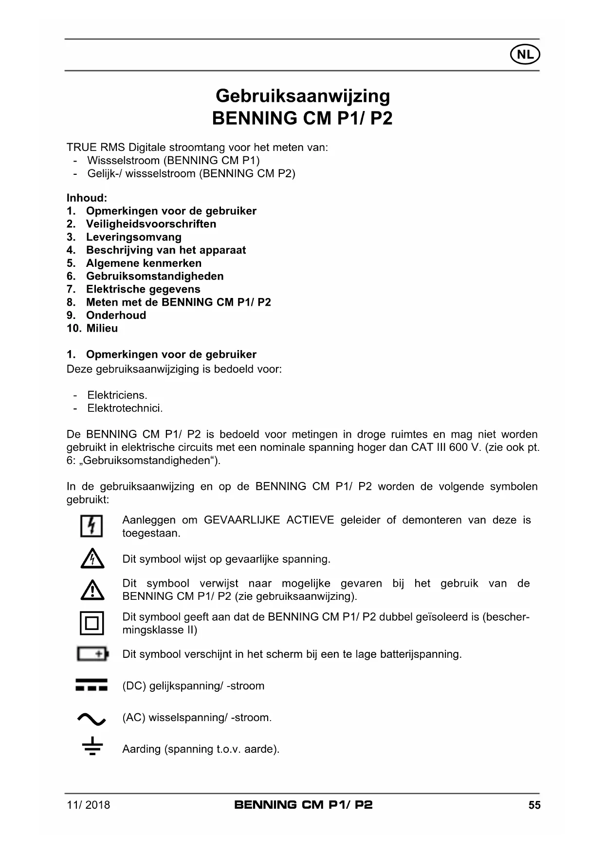 TRUE RMS Digitale stroomtang voor het meten van: - Wissselstroom (BENNING CM P1) - Gelijk-/ wissselstroom (BENNING CM P2)Inhoud: 1. Opmerkingen voor de gebruiker 2. Veiligheidsvoorschriften 3. Leveringsomvang 4. Beschrijving van het apparaat 5. Algemene kenmerken 6. Gebruiksomstandigheden 7. Elektrische gegevens 8. Meten met de BENNING CM P1/ P29. Onderhoud 10. Milieu 1. Opmerkingen voor de gebruiker Deze gebruiksaanwijziging is bedoeld voor: - Elektriciens. - Elektrotechnici. De BENNING CM P1/ P2 is bedoeld voor metingen in droge ruimtes en mag niet worden gebruikt in elektrische circuits met een nominale spanning hoger dan CAT III 600 V. (zie ook pt. 6: „Gebruiksomstandigheden“). In de gebruiksaanwijzing en op de BENNING CM P1/ P2 worden de volgende symbolen gebruikt: Aanleggen om GEVAARLIJKE ACTIEVE geleider of demonteren van deze is toegestaan. Dit symbool wijst op gevaarlijke spanning. Dit symbool verwijst naar mogelijke gevaren bij het gebruik van de BENNING CM P1/ P2 (zie gebruiksaanwijzing). Dit symbool geeft aan dat de BENNING CM P1/ P2 dubbel geïsoleerd is (bescher-mingsklasse II)Dit symbool verschijnt in het scherm bij een te lage batterijspanning.(DC) gelijkspanning/ -stroom (AC) wisselspanning/ -stroom. Aarding (spanning t.o.v. aarde).11/ 2018
