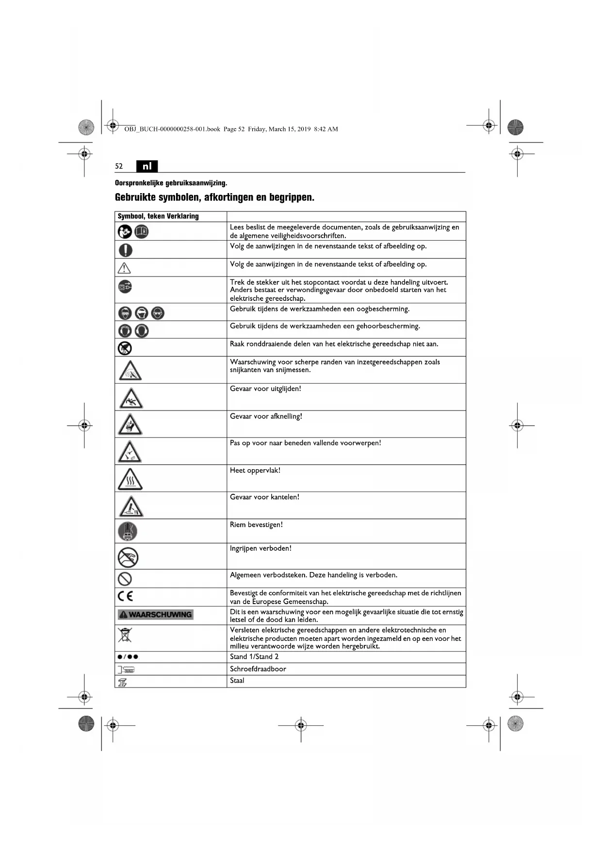 Oorspronkelijke gebruiksaanwijzing. Gebruikte symbolen, afkortingen en begrippen. Symbool, teken Verklaring Lees beslist de meegeleverde documenten, zoals de gebruiksaanwijzing en de algemene veiligheidsvoorschriften. Volg de aanwijzingen in de nevenstaande tekst of afbeelding op. Volg de aanwijzingen in de nevenstaande tekst of afbeelding op. Trek de stekker uit het stopcontact voordat u deze handeling uitvoert. Anders bestaat er verwondingsgevaar door onbedoeld starten van het elektrische gereedschap. Gebruik tijdens de werkzaamheden een oogbescherming. Gebruik tijdens de werkzaamheden een gehoorbescherming. Raak ronddraaiende delen van het elektrische gereedschap niet aan. Waarschuwing voor scherpe randen van inzetgereedschappen zoals snijkanten van snijmessen. Gevaar voor uitglijden! Gevaar voor afknelling! Pas op voor naar beneden vallende voorwerpen! Heet oppervlak! Gevaar voor kantelen! Riem bevestigen! Ingrijpen verboden! Algemeen verbodsteken. Deze handeling is verboden. Bevestigt de conformiteit van het elektrische gereedschap met de richtlijnen van de Europese Gemeenschap. Dit is een waarschuwing voor een mogelijk gevaarlijke situatie die tot ernstig letsel of de dood kan leiden. Versleten elektrische gereedschappen en andere elektrotechnische en elektrische producten moeten apart worden ingezameld en op een voor het milieu verantwoorde wijze worden hergebruikt. Stand 1/Stand 2 Schroefdraadboor Staal OBJ_BUCH-0000000258-001.book Page 52 Friday, March 15, 2019 8:42 AM53