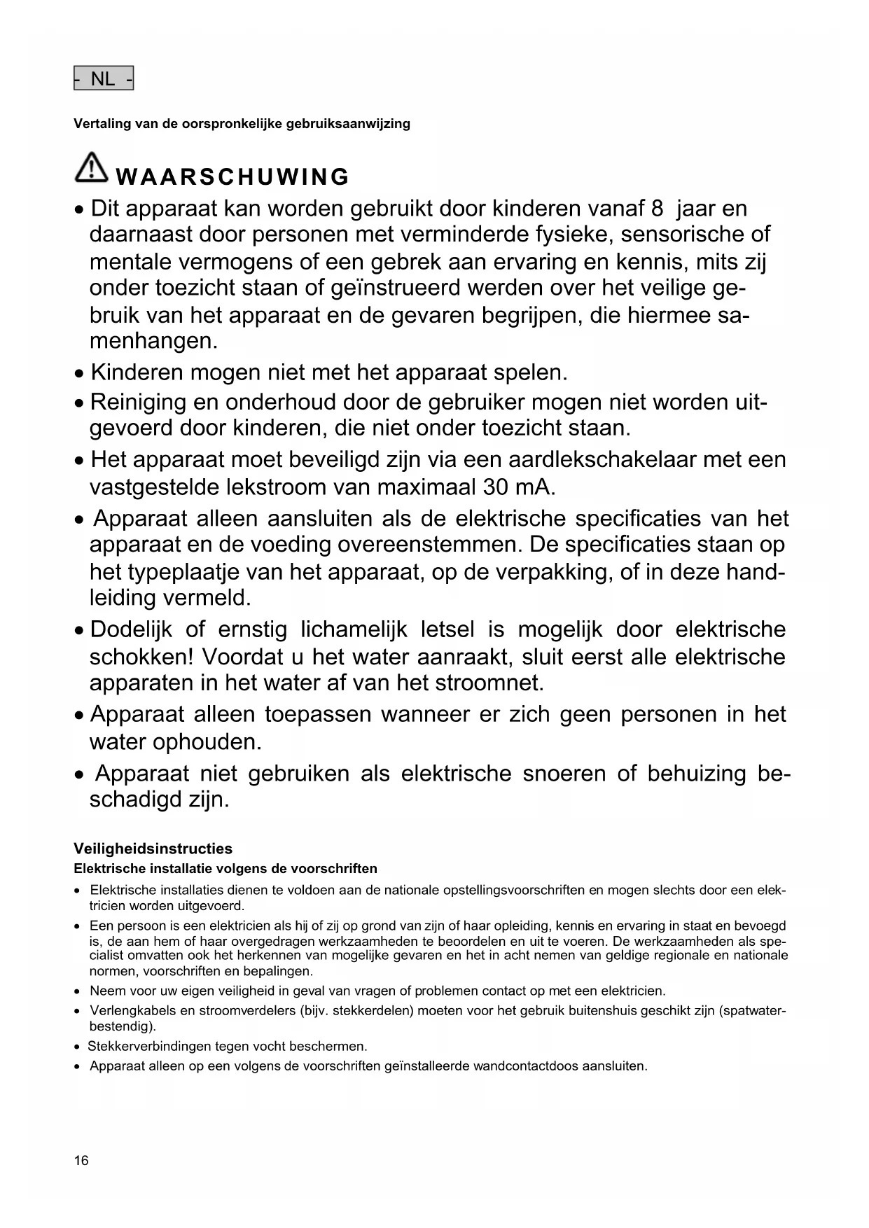 WAARSCHUWING Dit apparaat kan worden gebruikt door kinderen vanaf 8 jaar en daarnaast door personen met verminderde fysieke, sensorische of mentale vermogens of een gebrek aan ervaring en kennis, mits zij onder toezicht staan of geïnstrueerd werden over het veilige ge- bruik van het apparaat en de gevaren begrijpen, die hiermee sa- menhangen. Kinderen mogen niet met het apparaat spelen. Reiniging en onderhoud door de gebruiker mogen niet worden uit- gevoerd door kinderen, die niet onder toezicht staan. Het apparaat moet beveiligd zijn via een aardlekschakelaar met een vastgestelde lekstroom van maximaal 30 mA. Apparaat alleen aansluiten als de elektrische specificaties van het apparaat en de voeding overeenstemmen. De specificaties staan op het typeplaatje van het apparaat, op de verpakking, of in deze hand- leiding vermeld. Dodelijk of ernstig lichamelijk letsel is mogelijk door elektrische schokken! Voordat u het water aanraakt, sluit eerst alle elektrische apparaten in het water af van het stroomnet. Apparaat alleen toepassen wanneer er zich geen personen in het water ophouden. Apparaat niet gebruiken als elektrische snoeren of behuizing be- schadigd zijn.