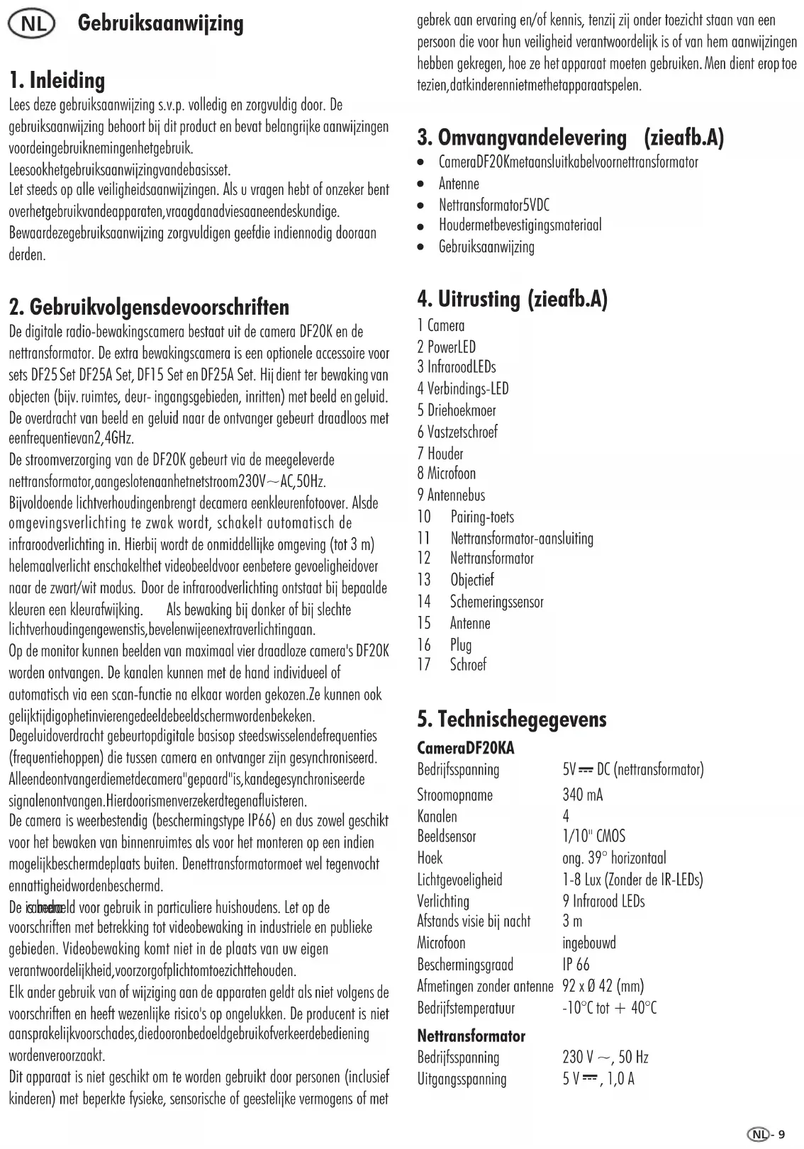 Leesookhetgebruiksaanwijzingvandebasisset. Bijvoldoende lichtverhoudingenbrengt decamera eenkleurenfotoover. Alsde omgevingsverlichting te zwak wordt, schakelt automatisch de infraroodverlichting in. Hierbij wordt de onmiddellijke omgeving (tot 3 m) helemaalverlicht enschakelthet videobeeldvoor eenbetere gevoeligheidover naar de zwart/wit modus. Als bewaking bij donker of bij slechte lichtverhoudingengewenstis,bevelenwijeenextraverlichtingaan. camera De digitale radio-bewakingscamera bestaat uit de camera DF20K en de nettransformator. De extra bewakingscamera is een optionele accessoire voor sets DF25Set DF25A Set,DF15 Set enDF25A Set. Hijdient ter bewakingvan objecten (bijv.ruimtes, deur- ingangsgebieden, inritten)met beeld engeluid. De overdracht van beeld en geluid naar de ontvanger gebeurt draadloos met eenfrequentievan2,4GHz. De stroomverzorging van de DF20K gebeurt via de meegeleverde nettransformator,aangeslotenaanhetnetstroom230V~AC,50Hz. Door de infraroodverlichting ontstaat bij bepaalde kleuren een kleurafwijking. Op de monitor kunnen beelden van maximaal vier draadloze camera's DF20K worden ontvangen. De kanalen kunnen met de hand individueel of automatisch via een scan-functie na elkaar worden gekozen.Ze kunnen ook gelijktijdigophetinvierengedeeldebeeldschermwordenbekeken. gebrek aan ervaring en/of kennis, tenzij zij onder toezicht staan van een persoon die voor hun veiligheid verantwoordelijk is of van hem aanwijzingen hebben gekregen,hoe ze hetapparaat moeten gebruiken.Men dient eroptoe tezien,datkinderennietmethetapparaatspelen.