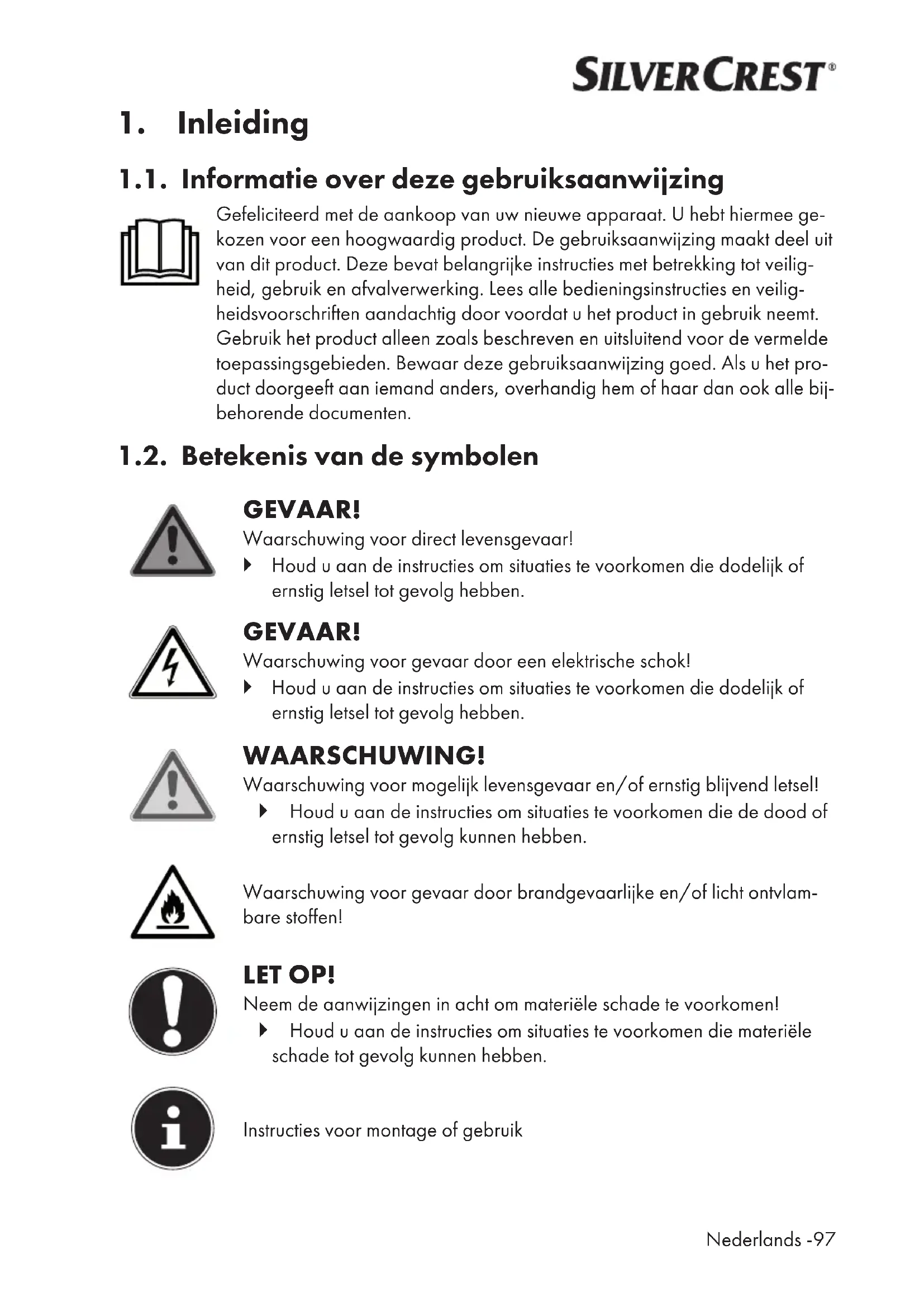 1.1. Informatie over deze gebruiksaanwijzing Gefeliciteerd met de aankoop van uw nieuwe apparaat. U hebt hiermee ge- kozen voor een hoogwaardig product. De gebruiksaanwijzing maakt deel uit van dit product. Deze bevat belangrijke instructies met betrekking tot veilig- heid, gebruik en afvalverwerking. Lees alle bedieningsinstructies en veilig- heidsvoorschriften aandachtig door voordat u het product in gebruik neemt. Gebruik het product alleen zoals beschreven en uitsluitend voor de vermelde toepassingsgebieden. Bewaar deze gebruiksaanwijzing goed. Als u het pro- duct doorgeeft aan iemand anders, overhandig hem of haar dan ook alle bij- behorende documenten. 1.2. Betekenis van de symbolen GEVAAR! Waarschuwing voor direct levensgevaar! Houd u aan de instructies om situaties te voorkomen die dodelijk of ernstig letsel tot gevolg hebben. GEVAAR! Waarschuwing voor gevaar door een elektrische schok! Houd u aan de instructies om situaties te voorkomen die dodelijk of ernstig letsel tot gevolg hebben. WAARSCHUWING! Waarschuwing voor mogelijk levensgevaar en/of ernstig blijvend letsel! Houd u aan de instructies om situaties te voorkomen die de dood of ernstig letsel tot gevolg kunnen hebben. Waarschuwing voor gevaar door brandgevaarlijke en/of licht ontvlam- bare stoffen! LET OP! Neem de aanwijzingen in acht om materiële schade te voorkomen! Houd u aan de instructies om situaties te voorkomen die materiële schade tot gevolg kunnen hebben. Instructies voor montage of gebruik98 - Nederlands Neem de aanwijzingen in de gebruiksaanwijzing in acht! Wisselstroom