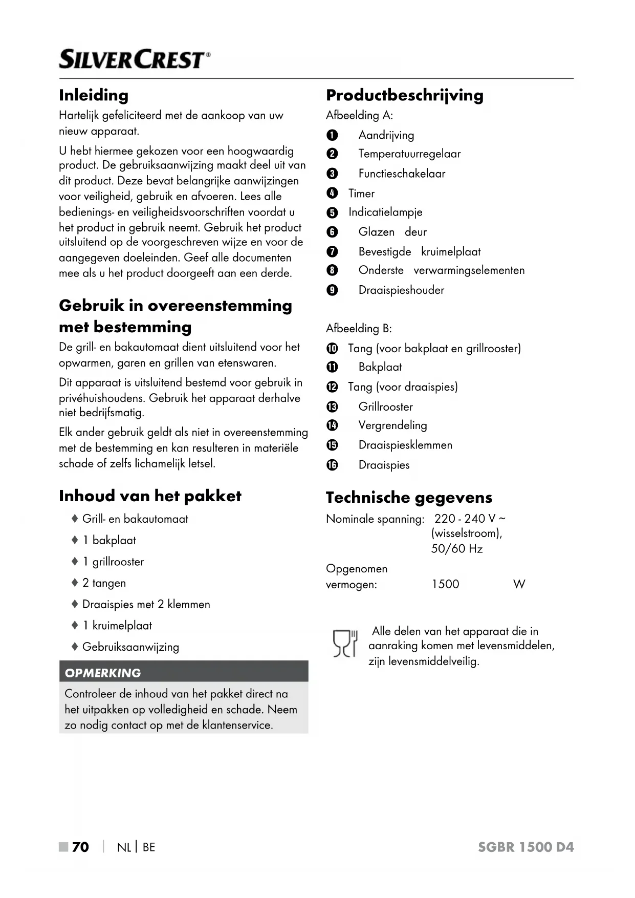 Indicatielampje 6 Glazen deur 7 Bevestigde kruimelplaat 8 Onderste verwarmingselementen 9 Draaispieshouder Afbeelding B: 0 Tang (voor bakplaat en grillrooster) q Bakplaat w Tang (voor draaispies) e Grillrooster r Vergrendeling t Draaispiesklemmen z Draaispies Technische gegevens Nominale spanning: 220 - 240 V ∼ (wisselstroom), 50/60 Hz Opgenomen vermogen: 1500 W Alle delen van het apparaat die in aanraking komen met levensmiddelen, zijn levensmiddelveilig.SGBR 1500 D4