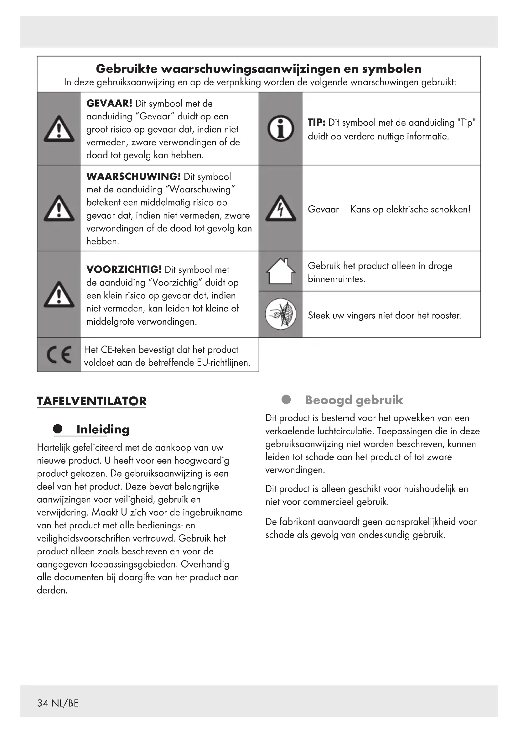 MEE! In geval van schade als gevolg van het niet naleven van deze gebruiksaanwijzing vervalt uw aanspraak op garantie! Wij aanvaarden geen aansprakelijkheid voor gevolgschade! Er wordt geen aansprakelijkheid aanvaard voor materiële schade of persoonlijk letsel, die ontstaan als gevolg van ondeskundig gebruik of het niet opvolgen van de veiligheidsaanwijzingen! Kinderen en personen met beperkingen mGEVAAR! Verstikkingsgevaar! Laat kinderen nooit zonder toezicht achter met het verpakkingsmateriaal. Het verpakkingsmateriaal vormt een verstikkingsgevaar. Kinderen onderschatten vaak de daaraan verbonden gevaren. Houd kinderen altijd uit de buurt van verpakkingsmateriaal. Dit product mag door kinderen vanaf 8jaar alsmede door personen met verminderde fysieke, sensorische of geestelijke vermogens of gebrek aan ervaring en kennis alleen gebruikt worden als ze onder supervisie staan of geïnstrueerd zijn wat betreft veilig gebruik van het product en begrepen hebben welke gevaren uit dat gebruik voortvloeien. Schoonmaken en onderhoud door de gebruiker mogen niet door kinderen worden uitgevoerd, tenzij ze onder toezicht staan. Kinderen mogen niet met het product spelen.37 NL/BE Elektrische veiligheid mWAARSCHUWING! Risico op letsel! Zet het product uit en koppel het los van het elektriciteitsnet voordat u het reinigt en zorg ervoor dat het op dat moment niet gebruikt wordt. mWAARSCHUWING! Risico voor elektrische schokken! Let erop dat de nominale spanning die op het typeplaatje is aangegeven, overeenstemt met de netspanning van uw elektriciteitsnet. mWAARSCHUWING! Risico voor elektrische schokken! Als het aansluitsnoer van dit product beschadigd is, moet dit, om gevaar te vermijden, door de fabrikant, zijn klantendienst of een vergelijkbaar gekwalificeerd persoon vervangen worden. Bediening Gebruik het product alleen in droge binnenruimtes. Bescherm het product, het aansluitsnoer en de netstekker tegen stof, direct zonlicht, waterdruppels en opspattend water. mVOORZICHTIG! Risico op letsel! Koppel het product los van het elektriciteitsnet voordat u het veiligheidsrooster verwijdert. mVOORZICHTIG! Risico op letsel! Gebruik het product nooit zonder veiligheidsroosters of als één van die veiligheidsroosters beschadigd is. mVOORZICHTIG! Risico op letsel! Houd tijdens het gebruik handen, haren, kleding en andere voorwerpen uit de buurt van het veiligheidsrooster om verwondingen en beschadiging van het product te voorkomen.38 NL/BE Voor gebruik Uitpakken Verwijder het verpakkingsmateriaal. Controleer het product op mogelijke schade. Montage Benodigde accessoires: Kruiskopschroevendraaier Aantal benodigde personen voor de montage: 1Volwassene Afb. Stap