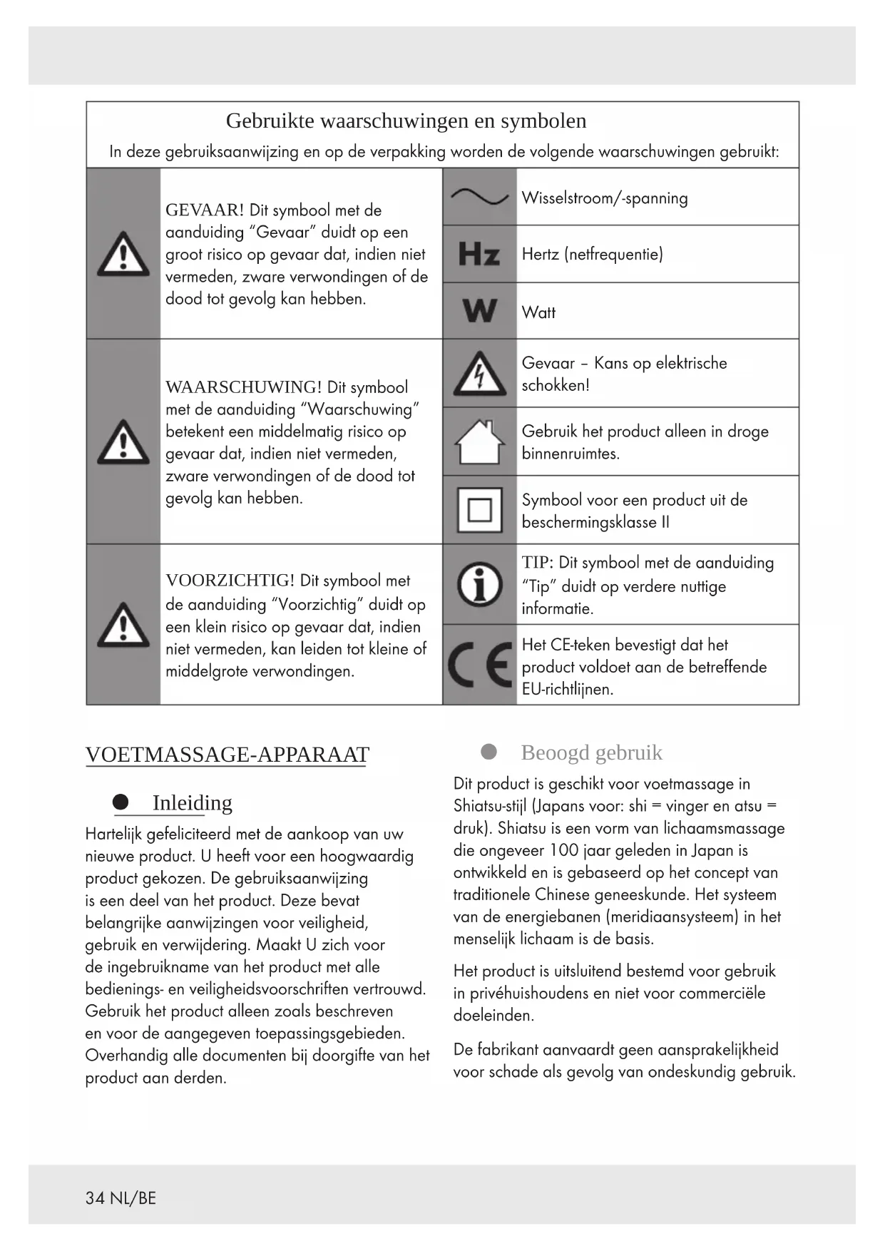 WAARSCHUWING! Kans op elektrische schokken! Dompel het product nooit onder in water of andere vloeistoffen. Houd het product nooit onder stromend water. Maak het product schoon met een enigszins vochtig doekje. Laat geen water of andere vloeistoffen in het binnenste van het product terechtkomen. Gebruik geen bijtende of schurende schoonmaakmiddelen om het product schoon te maken. Na het schoonmaken: Laat het product drogen. Opbergen Rol het aansluitsnoer [5] op over de kabelhaspel [6]. Bewaar het product als het niet wordt gebruikt in de originele verpakking. Bewaar het product op een droge plaats buiten het bereik van kinderen. Afvoer De verpakking bestaat uit milieuvriendelijke grondstoffen die u via de plaatselijke recyclingcontainers kunt afvoeren. Neem de aanduiding van de verpakkingsmaterialen voor de afvalscheiding in acht. Deze zijn gemarkeerd met de afkortingen (a) en een cijfers (b) met de volgende betekenis: 1–7: kunststoffen / 20–22: papier en vezelplaten / 80–98: composietmaterialen. Het product en de verpakkingsmaterialen zijn recyclebaar; verwijder deze afzonderlijk voor een betere afvalbehandeling. Het Triman-logo geldt alleen voor Frankrijk. Informatie over de mogelijkheden om het uitgediende product na gebruik te verwijderen, verstrekt uw gemeentelijke overheid. Gooi het afgedankte product omwille van het milieu niet weg via het huisvuil, maar geef het af bij het daarvoor bestemde depot of het gemeentelijke milieupark. Over afgifteplaatsen en hun openingstijden kunt u zich bij uw aangewezen instantie informeren.41NL/BE Garantie Het product wordt volgens strenge kwaliteitsrichtlijnen zorgvuldig geproduceerd en voor levering grondig getest. In geval van schade aan het product kunt u rechtmatig beroep doen op de verkoper van het product. Deze wettelijke rechten worden door onze hierna vermelde garantie niet beperkt. Op dit product verlenen wij 3 jaar garantie vanaf aankoopdatum. De garantieperiode start op de dag van aankoop. Bewaar de originele kassabon alstublieft. Dit document is nodig als bewijs voor aankoop. Wanneer binnen 3 jaar na de aankoopdatum van dit product een materiaal- of productiefout optreedt, dan wordt het product door ons – naar onze keuze – gratis voor u gerepareerd of vervangen. Deze garantie komt te vervallen als het product beschadigd wordt, niet correct gebruikt of onderhouden wordt. De garantie geldt voor materiaal- en productiefouten. Deze garantie is niet van toepassing op productonderdelen, die onderhevig zijn aan normale slijtage en hierdoor als aan slijtage onderhevige onderdelen gelden (bijv. batterijen) of voor beschadigingen aan breekbare onderdelen, zoals bijv. schakelaars, accu’s of dergelijke onderdelen, die gemaakt zijn van glas. Afwikkeling in geval van garantie Om een snelle afhandeling van uw reclamatie te waarborgen dient u de volgende instructies in acht te nemen: Houd bij alle vragen alstublieft de kassabon en het artikelnummer (IAN 394266_2104) als bewijs van aankoop bij de hand. Het artikelnummer vindt u op de typeplaat, ingegraveerd, op het titelblad van uw handleiding (linksonder) of als sticker op de achter- of onderzijde. Wanneer er storingen in de werking of andere gebreken optreden, dient u eerst telefonisch of per e-mail contact met de onderstaande service- afdeling op te nemen. Een als defect geregistreerd product kunt u dan samen met uw aankoopbewijs (kassabon) en vermelding van de concrete schade alsmede het tijdstip van optreden voor u franco aan het u meegedeelde servicepunt verzenden. Service Service Nederland Tel.: 08000225537 E-Mail: owim@lidl.nl Service België Tel.: 080071011 Tel.: 80023970 (Luxemburg) E-Mail: owim@lidl.be42 PL Używane ostrzeżenia i symbole .................................. Strona 43 Wstęp ................................................................. Strona 43 Używać zgodnie z przeznaczeniem ......................................... Strona 43 Zakres dostawy ......................................................... Strona 44 Opis części............................................................. Strona 44 Dane techniczne ........................................................ Strona 44 Instrukcje bezpieczeństwa ......................................... Strona 44 Przed pierwszym użyciem ......................................... Strona 47 Obsługa............................................................... Strona 47 Ustawianie produktu ..................................................... Strona 47 Używanie funkcji masażu i grzania .......................................... Strona 48 Wyłączanie produktu..................................................... Strona 48 Usuwanie usterek ................................................... Strona 49 Czyszczenie i konserwacja ......................................... Strona 49 Przechowywanie .................................................... Strona 49 Utylizacja ............................................................. Strona 49 Gwarancja............................................................ Strona 5043PL Używane ostrzeżenia i symbole W tej instrukcji i na opakowaniu używane są poniższe ostrzeżenia: NIEBEZPIECZEŃSTWO! Ten symbol ze słowem „Niebezpieczeństwo” wskazuje na zagrożenie o wysokim stopniu ryzyka, które, jeśli się go nie uniknie, spowoduje śmierć lub poważne obrażenia. Prąd przemienny/napięcie przemienne Herc (częstotliwość sieciowa) Wat OSTRZEŻENIE! Ten symbol ze słowem „Ostrzeżenie” wskazuje na zagrożenie o średnim stopniu ryzyka, które, jeśli się go nie uniknie, spowoduje śmierć lub poważne obrażenia. Niebezpieczeństwo – Ryzyko porażenia prądem! Produkt stosować tylko w pomieszczeniach suchych. Symbol dla produktu ze stopniem ochronyII OSTROŻNIE! Ten symbol ze słowem „Ostrożnie” wskazuje na zagrożenie o niskim stopniu ryzyka, które, jeśli się go nie uniknie, spowoduje małe lub umiarkowane obrażenia. RADA: Ten symbol ze słowem „Rada” 