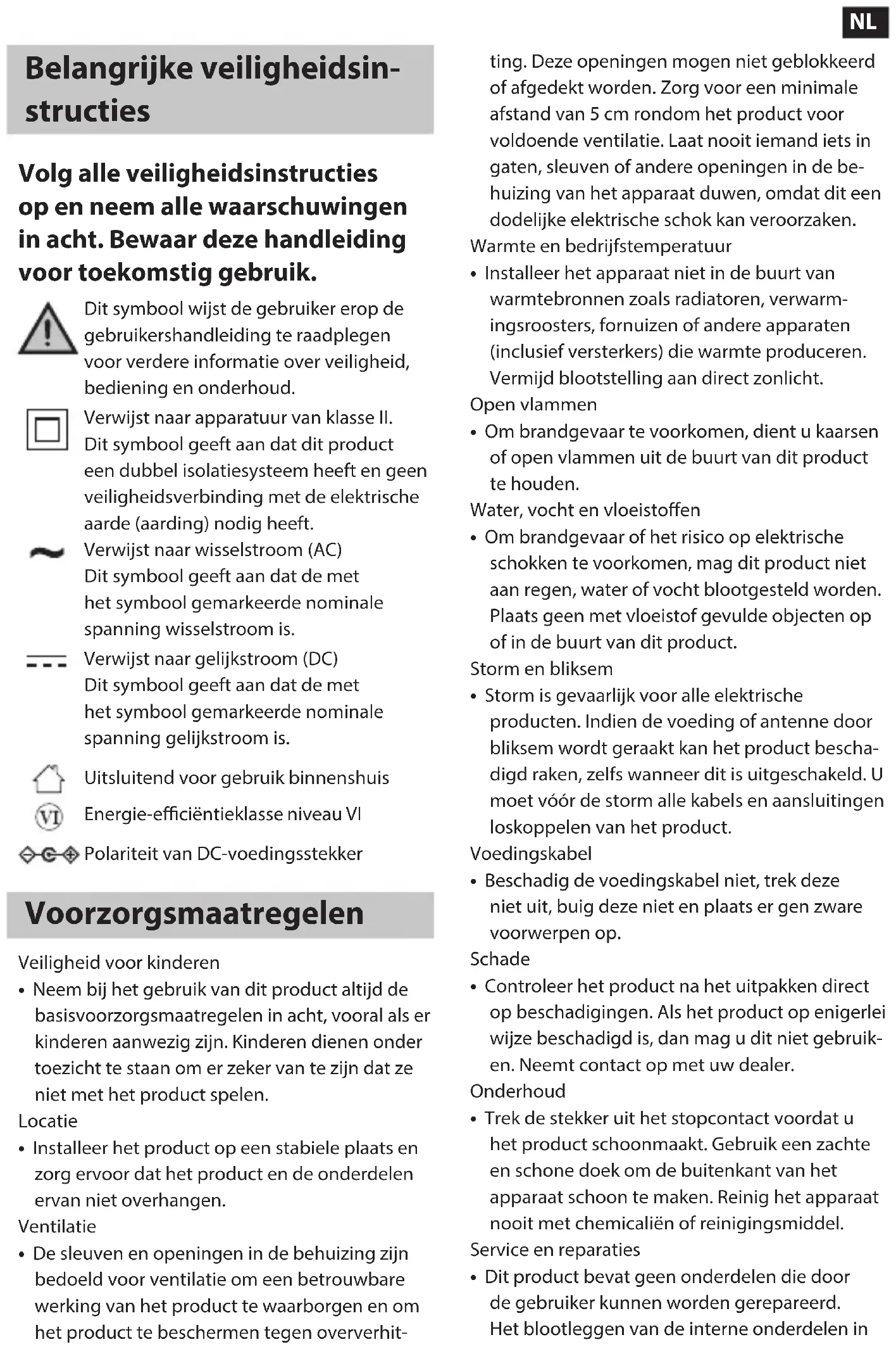 Dit symbool wijst de gebruiker erop de gebruikershandleiding te raadplegen voor verdere informatie over veiligheid, bediening en onderhoud. Verwijst naar apparatuur van klasse II. Dit symbool geeft aan dat dit product een dubbel isolatiesysteem heeft en geen veiligheidsverbinding met de elektrische aarde (aarding) nodig heeft. Verwijst naar wisselstroom (AC) Dit symbool geeft aan dat de met het symbool gemarkeerde nominale spanning wisselstroom is. Verwijst naar gelijkstroom (DC) Dit symbool geeft aan dat de met het symbool gemarkeerde nominale spanning gelijkstroom is. Uitsluitend voor gebruik binnenshuis Energie-eciëntieklasse niveau VI Polariteit van DC-voedingsstekker Voorzorgsmaatregelen Veiligheid voor kinderen