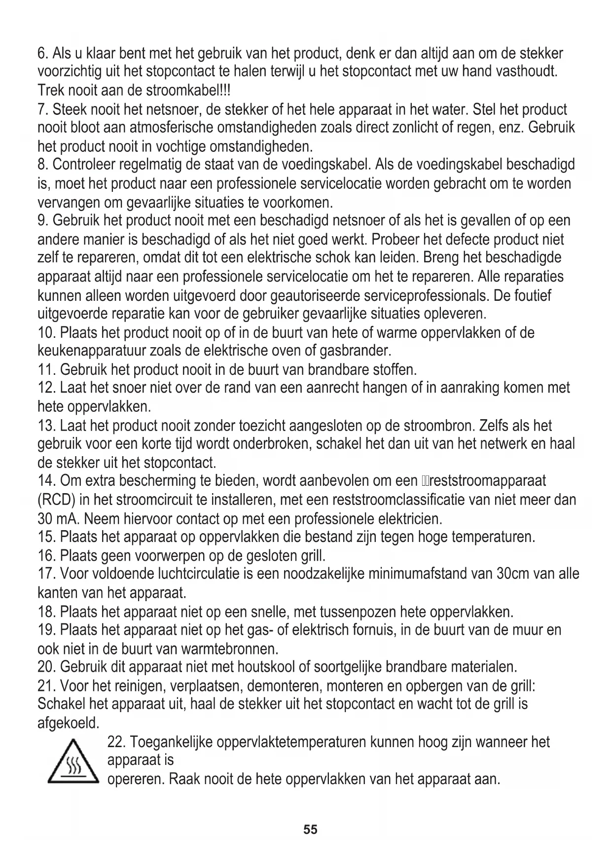 10. Plaats het product nooit op of in de buurt van hete of warme oppervlakken of de