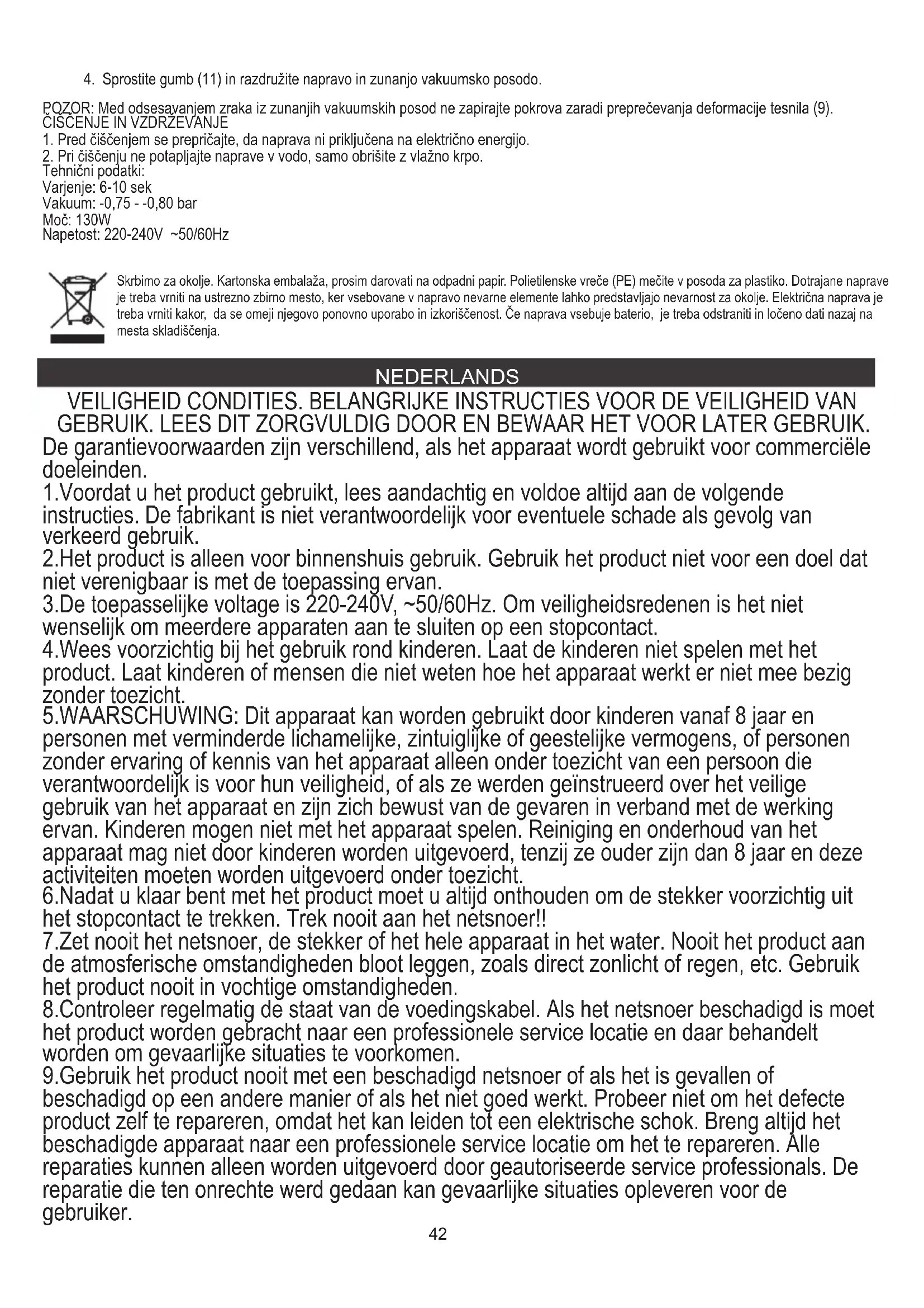 43We geven om het milieu. We vragen u om de kartonnen verpakkingen te storten bij het oud papier. Polyethyleen zakken (PE) storten in de container voor plastic . Versleten apparatuur afgeven bij het juiste verzamelpunkt, als in het apparatuur gevaarlijke elementen zitten kan dat een bedreiging zijn voor het milieu. Elektrisch apparatuur moet worden geretourneerd om het hergebruik te verminderen. Als in het apparatur batterijen ziiten, horen die verwijderd te worden en appart af te worden gegeven bij het juiste verzamelpunkt. SLOVENŠČINA HRVATSKI Radi povećanja sigurnosti uporabe izbjegavati uključivanje na jednom strujnom krugu više električnih uređaja u isto vrijeme.