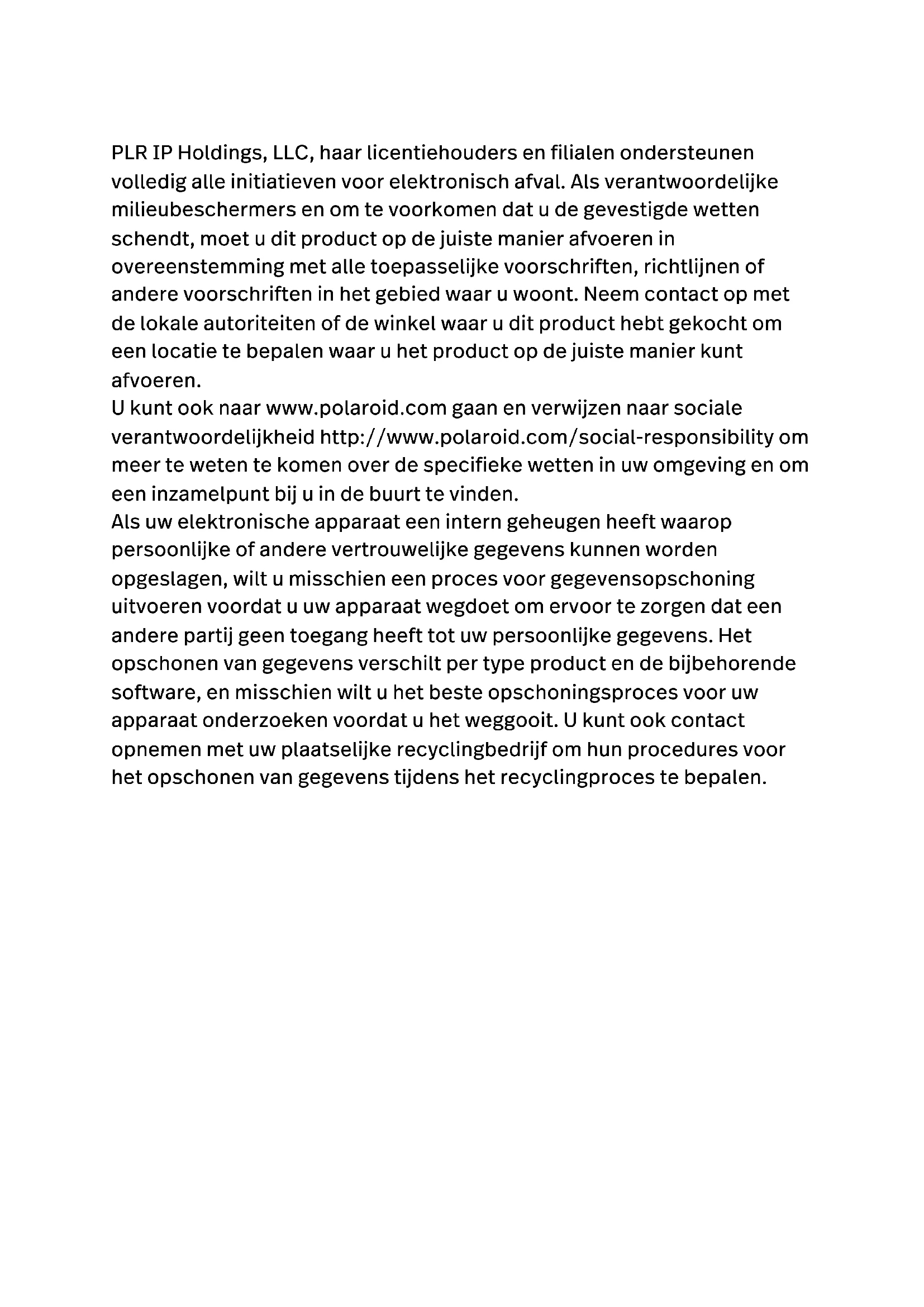 Geïmporteerd door Market Maker Brand Licensing – 79/81 Ancienne Route Nationale 7-69570 Dardilly, FrankrijkPLR IP Holdings, LLC, haar licentiehouders en filialen ondersteunen volledig alle initiatieven voor elektronisch afval. Als verantwoordelijke milieubeschermers en om te voorkomen dat u de gevestigde wetten schendt, moet u dit product op de juiste manier afvoeren in overeenstemming met alle toepasselijke voorschriften, richtlijnen of andere voorschriften in het gebied waar u woont. Neem contact op met de lokale autoriteiten of de winkel waar u dit product hebt gekocht om een locatie te bepalen waar u het product op de juiste manier kunt afvoeren. U kunt ook naar www.polaroid.com gaan en verwijzen naar sociale verantwoordelijkheid http://www.polaroid.com/social-responsibility om meer te weten te komen over de specifieke wetten in uw omgeving en om een inzamelpunt bij u in de buurt te vinden. Als uw elektronische apparaat een intern geheugen heeft waarop persoonlijke of andere vertrouwelijke gegevens kunnen worden opgeslagen, wilt u misschien een proces voor gegevensopschoning uitvoeren voordat u uw apparaat wegdoet om ervoor te zorgen dat een andere partij geen toegang heeft tot uw persoonlijke gegevens. Het opschonen van gegevens verschilt per type product en de bijbehorende software, en misschien wilt u het beste opschoningsproces voor uw apparaat onderzoeken voordat u het weggooit. U kunt ook contact opnemen met uw plaatselijke recyclingbedrijf om hun procedures voor het opschonen van gegevens tijdens het recyclingproces te bepalen.V EILIGH