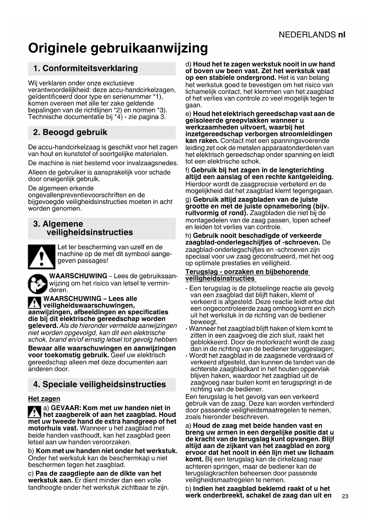 Originele gebruikaanwijzing Wij verklaren onder onze exclusieve verantwoordelijkheid: deze accu-handcirkelzagen, geïdentificeerd door type en serienummer *1), komen overeen met alle ter zake geldende bepalingen van de richtlijnen *2) en normen *3). Technische documentatie bij *4) - zie pagina 3. De accu-handcirkelzaag is geschikt voor het zagen van hout en kunststof of soortgelijke materialen. De machine is niet bestemd voor invalzaagsnedes. Alleen de gebruiker is aansprakelijk voor schade door oneigenlijk gebruik. De algemeen erkende ongevallenpreventievoorschriften en de bijgevoegde veiligheidsinstructies moeten in acht worden genomen. Let ter bescherming van uzelf en de machine op de met dit symbool aange- geven passages! WAARSCHUWING – Lees de gebruiksaan- wijzing om het risico van letsel te vermin- deren. WAARSCHUWING – Lees alle veiligheidswaarschuwingen, aanwijzingen, afbeeldingen en specificaties die bij dit elektrische gereedschap worden geleverd. Als de hieronder vermelde aanwijzingen niet worden opgevolgd, kan dit een elektrische schok, brand en/of ernstig letsel tot gevolg hebben. Bewaar alle waarschuwingen en aanwijzingen voor toekomstig gebruik. Geef uw elektrisch gereedschap alleen met deze documenten aan anderen door. Het zagen a) GEVAAR: Kom met uw handen niet in het zaagbereik of aan het zaagblad. Houd met uw tweede hand de extra handgreep of het motorhuis vast. Wanneer u het zaagblad met beide handen vasthoudt, kan het zaagblad geen letsel aan uw handen veroorzaken. b) Kom met uw handen niet onder het werkstuk. Onder het werkstuk kan de beschermkap u niet beschermen tegen het zaagblad. c) Pas de zaagdiepte aan de dikte van het werkstuk aan. Er dient minder dan een volle tandhoogte onder het werkstuk zichtbaar te zijn. d) Houd het te zagen werkstuk nooit in uw hand of boven uw been vast. Zet het werkstuk vast op een stabiele ondergrond. Het is van belang het werkstuk goed te bevestigen om het risico van lichamelijk contact, het klemmen van het zaagblad of het verlies van controle zo veel mogelijk tegen te gaan. e) Houd het elektrisch gereedschap vast aan de geïsoleerde greepvlakken wanneer u werkzaamheden uitvoert, waarbij het inzetgereedschap verborgen stroomleidingen kan raken. Contact met een spanningsvoerende leiding zet ook de metalen apparaatonderdelen van het elektrisch gereedschap onder spanning en leidt tot een elektrische schok. f) Gebruik bij het zagen in de lengterichting altijd een aanslag of een rechte kantgeleiding. Hierdoor wordt de zaagprecisie verbeterd en de mogelijkheid dat het zaagblad klemt tegengegaan. g) Gebruik altijd zaagbladen van de juiste grootte en met de juiste opnameboring (bijv. ruitvormig of rond). Zaagbladen die niet bij de montagedelen van de zaag passen, lopen scheef en leiden tot verlies van controle. h) Gebruik nooit beschadigde of verkeerde zaagblad-onderlegschijfjes of -schroeven. De zaagblad-onderlegschijfjes en -schroeven zijn speciaal voor uw zaag geconstrueerd, met het oog op optimale prestaties en veiligheid. Terugslag - oorzaken en bijbehorende veiligheidsinstructies - Een terugslag is de plotselinge reactie als gevolg van een zaagblad dat blijft haken, klemt of verkeerd is afgesteld. Deze reactie leidt ertoe dat een ongecontroleerde zaag omhoog komt en zich uit het werkstuk in de richting van de bediener beweegt. - Wanneer het zaagblad blijft haken of klem komt te zitten in een zaagvoeg die zich sluit, raakt het geblokkeerd. Door de motorkracht wordt de zaag dan in de richting van de bediener teruggeslagen; - Wordt het zaagblad in de zaagsnede verdraaid of verkeerd afgesteld, dan kunnen de tanden van de achterste zaagbladkant in het houten oppervlak blijven haken, waardoor het zaagblad uit de zaagvoeg naar buiten komt en terugspringt in de richting van de bediener. Een terugslag is het gevolg van een verkeerd gebruik van de zaag. Deze kan worden verhinderd door passende veiligheidsmaatregelen te nemen, zoals hieronder beschreven. a) Houd de zaag met beide handen vast en breng uw armen in een dergelijke positie dat u de kracht van de terugslag kunt opvangen. Blijf altijd aan de zijkant van het zaagblad en zorg ervoor dat het nooit in één lijn met uw lichaam komt. Bij een terugslag kan de cirkelzaag naar achteren springen, maar de bediener kan de terugslagkrachten beheersen door passende veiligheidsmaatregelen te nemen. b) Indien het zaagblad beklemd raakt of u het werk onderbreekt, schakel de zaag dan uit en