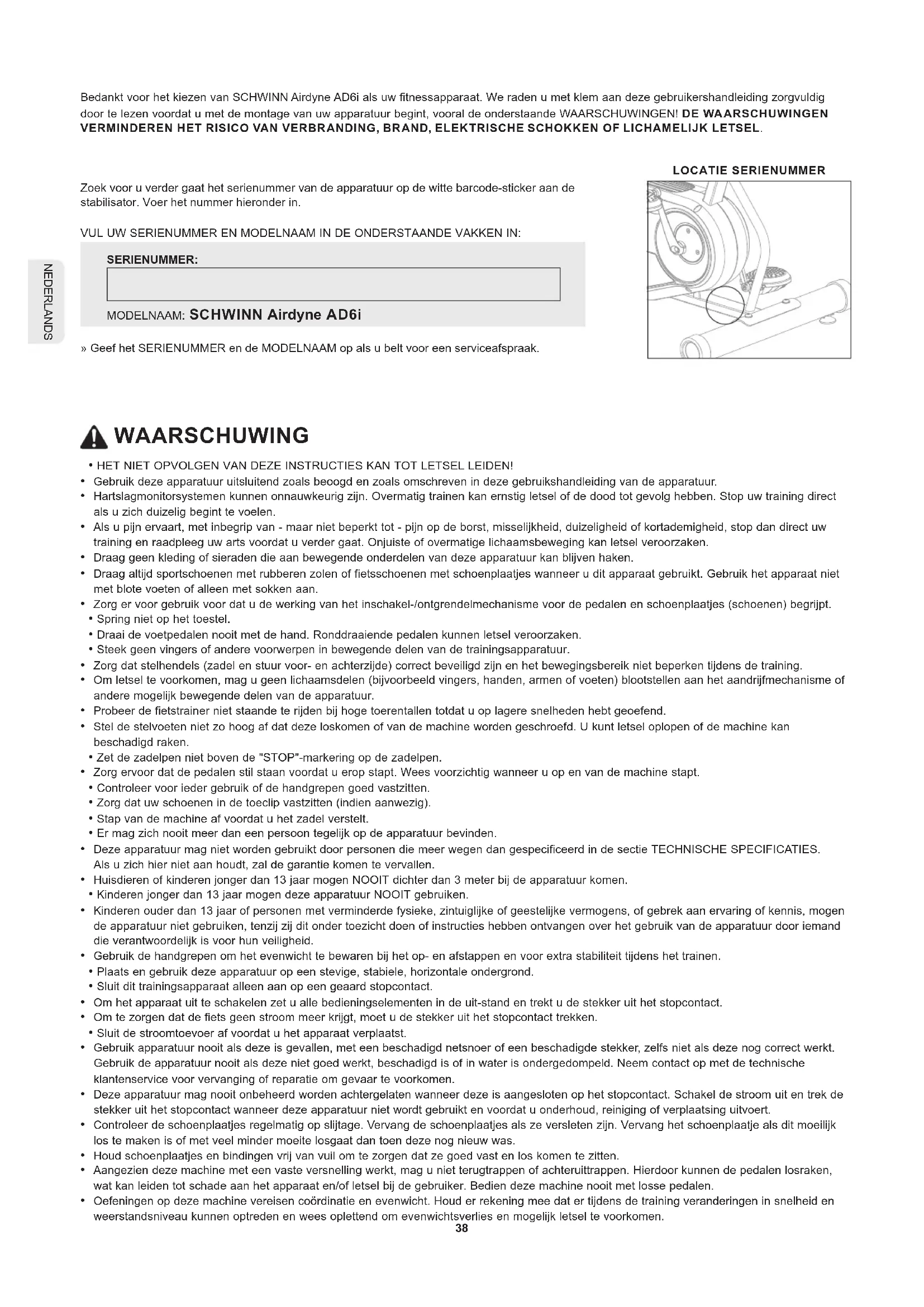 Bedankt voor het kiezen van SCHWINN Airdyne AD6i als uw fitnessapparaat. We raden u met klem aan deze gebruikershandleiding zorgvuldig door te lezen voordat u met de montage van uw apparatuur begint, vooral de onderstaande WAARSCHUWINGEN! DE WAARSCHUWINGEN VERMINDEREN HET RISICO VAN VERBRANDING, BRAND, ELEKTRISCHE SCHOKKEN OF LICHAMELIJK LETSEL.