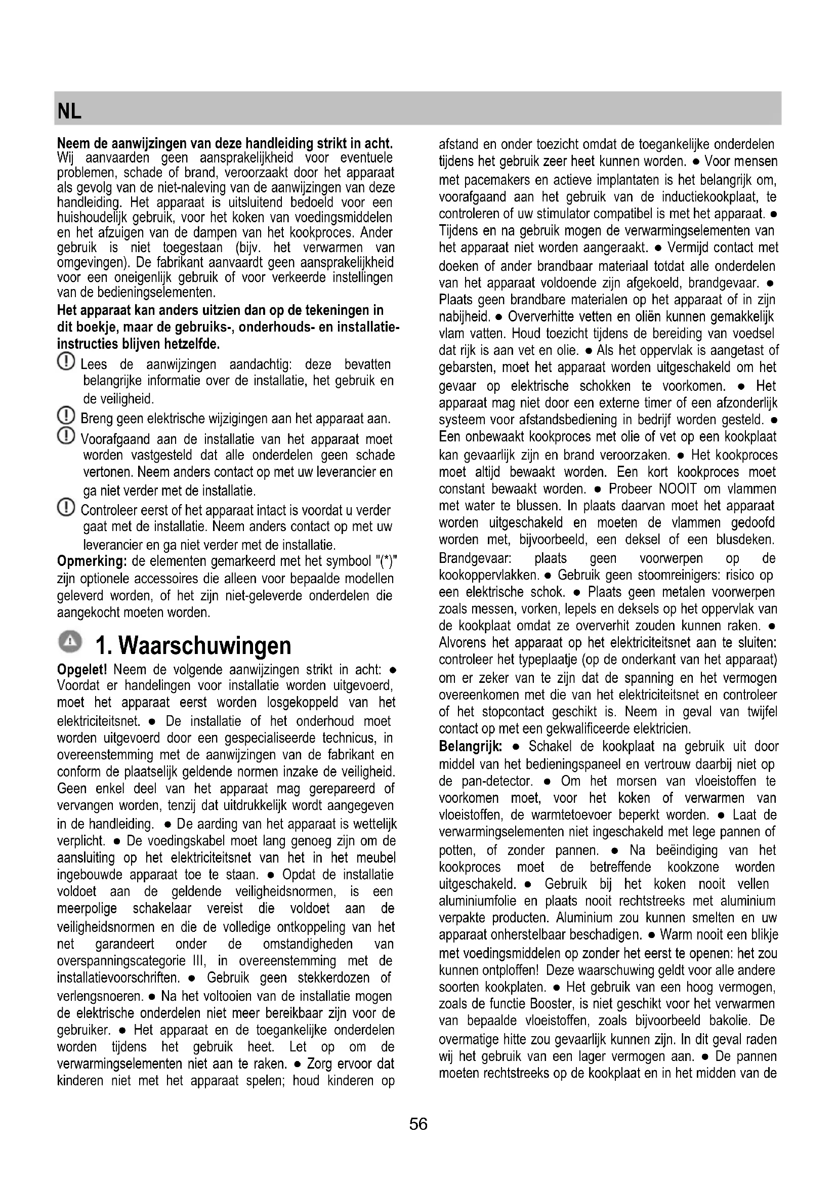 Opgelet! Neem de volgende aanwijzingen strikt in acht: ● Voordat er handelingen voor installatie worden uitgevoerd, moet het apparaat eerst worden losgekoppeld van het elektriciteitsnet. ● De installatie of het onderhoud moet worden uitgevoerd door een gespecialiseerde technicus, in overeenstemming met de aanwijzingen van de fabrikant en conform de plaatselijk geldende normen inzake de veiligheid. Geen enkel deel van het apparaat mag gerepareerd of vervangen worden, tenzij dat uitdrukkelijk wordt aangegeven in de handleiding. ● De aarding van het apparaat is wettelijk verplicht. ● De voedingskabel moet lang genoeg zijn om de aansluiting op het elektriciteitsnet van het in het meubel ingebouwde apparaat toe te staan. ● Opdat de installatie voldoet aan de geldende veiligheidsnormen, is een meerpolige schakelaar vereist die voldoet aan de veiligheidsnormen en die de volledige ontkoppeling van het net garandeert onder de omstandigheden van overspanningscategorie III, in overeenstemming met de installatievoorschriften. ● Gebruik geen stekkerdozen of verlengsnoeren. ● Na het voltooien van de installatie mogen de elektrische onderdelen niet meer bereikbaar zijn voor de gebruiker. ● Het apparaat en de toegankelijke onderdelen worden tijdens het gebruik heet. Let op om de verwarmingselementen niet aan te raken. ● Zorg ervoor dat kinderen niet met het apparaat spelen; houd kinderen op afstand en onder toezicht omdat de toegankelijke onderdelen tijdens het gebruik zeer heet kunnen worden. ● Voor mensen met pacemakers en actieve implantaten is het belangrijk om, voorafgaand aan het gebruik van de inductiekookplaat, te controleren of uw stimulator compatibel is met het apparaat. ● Tijdens en na gebruik mogen de verwarmingselementen van het apparaat niet worden aangeraakt. ● Vermijd contact met doeken of ander brandbaar materiaal totdat alle onderdelen van het apparaat voldoende zijn afgekoeld, brandgevaar. ● Plaats geen brandbare materialen op het apparaat of in zijn nabijheid. ● Oververhitte vetten en oliën kunnen gemakkelijk vlam vatten. Houd toezicht tijdens de bereiding van voedsel dat rijk is aan vet en olie. ● Als het oppervlak is aangetast of gebarsten, moet het apparaat worden uitgeschakeld om het gevaar op elektrische schokken te voorkomen. ● Het apparaat mag niet door een externe timer of een afzonderlijk systeem voor afstandsbediening in bedrijf worden gesteld. ● Een onbewaakt kookproces met olie of vet op een kookplaat kan gevaarlijk zijn en brand veroorzaken. ● Het kookproces moet altijd bewaakt worden. Een kort kookproces moet constant bewaakt worden. ● Probeer NOOIT om vlammen met water te blussen. In plaats daarvan moet het apparaat worden uitgeschakeld en moeten de vlammen gedoofd worden met, bijvoorbeeld, een deksel of een blusdeken. Brandgevaar: plaats geen voorwerpen op de kookoppervlakken. ● Gebruik geen stoomreinigers: risico op een elektrische schok. ● Plaats geen metalen voorwerpen zoals messen, vorken, lepels en deksels op het oppervlak van de kookplaat omdat ze oververhit zouden kunnen raken. ● Alvorens het apparaat op het elektriciteitsnet aan te sluiten: controleer het typeplaatje (op de onderkant van het apparaat) om er zeker van te zijn dat de spanning en het vermogen overeenkomen met die van het elektriciteitsnet en controleer of het stopcontact geschikt is. Neem in geval van twijfel contact op met een gekwalificeerde elektricien. Belangrijk: ● Schakel de kookplaat na gebruik uit door middel van het bedieningspaneel en vertrouw daarbij niet op de pan-detector. ● Om het morsen van vloeistoffen te voorkomen moet, voor het koken of verwarmen van vloeistoffen, de warmtetoevoer beperkt worden. ● Laat de verwarmingselementen niet ingeschakeld met lege pannen of potten, of zonder pannen. ● Na beëindiging van het kookproces moet de betreffende kookzone worden uitgeschakeld. ● Gebruik bij het koken nooit vellen aluminiumfolie en plaats nooit rechtstreeks met aluminium verpakte producten. Aluminium zou kunnen smelten en uw apparaat onherstelbaar beschadigen. ● Warm nooit een blikje met voedingsmiddelen op zonder het eerst te openen: het zou kunnen ontploffen! Deze waarschuwing geldt voor alle andere soorten kookplaten. ● Het gebruik van een hoog vermogen, zoals de functie Booster, is niet geschikt voor het verwarmen van bepaalde vloeistoffen, zoals bijvoorbeeld bakolie. De overmatige hitte zou gevaarlijk kunnen zijn. In dit geval raden wij het gebruik van een lager vermogen aan. ● De pannen moeten rechtstreeks op de kookplaat en in het midden van de57 kookzones worden geplaatst. Plaats in geen geval andere voorwerpen tussen de pan en de kookplaat. ● In geval van hoge temperaturen, vermindert het apparaat automatisch het vermogensniveau van de kookzones. ● Voordat u reinigings● of onderhoudswerkzaamheden uitvoert, moet u het apparaat van het stroomnet loskoppelen door de stekker uit het stopcontact te halen of de hoofdschakelaar van het huis uitschakelen. ● Gebruik tijdens alle installatie● en onderhoudshandelingen altijd werkhandschoenen. ● Het apparaat mag gebruikt worden door kinderen vanaf 8 jaar en door personen met verminderde lichamelijke, zintuiglijke of geestelijke vermogens, of personen die niet beschikken over de noodzakelijke ervaring en kennis, mits ze onder toezicht staan of nadat ze aanwijzingen hebben ontvangen inzake het veilige gebruik van het apparaat en ze de bij het gebruik betrokken gevaren begrepen hebben. ● Kinderen moeten gecontroleerd worden om ervoor te zorgen dat ze niet met het apparaat spelen. ● De reiniging en het onderhoud mogen niet worden uitgevoerd door kinderen zonder dat ze onder toezicht staan. ● De ruimte moet voldoende worden geventileerd wanneer het apparaat tegelijk met andere apparaten wordt gebruikt die op gas of andere brandstoffen werken. ● Het apparaat moet zowel intern als extern regelmatig worden gereinigd (TENMINSTE EEN KEER PER MAAND), maar volg daar