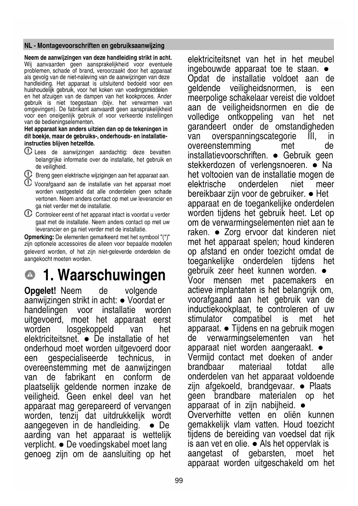 Opgelet! Neem de volgende aanwijzingen strikt in acht: ● Voordat er handelingen voor installatie worden uitgevoerd, moet het apparaat eerst worden losgekoppeld van het elektriciteitsnet. ● De installatie of het onderhoud moet worden uitgevoerd door een gespecialiseerde technicus, in overeenstemming met de aanwijzingen van de fabrikant en conform de plaatselijk geldende normen inzake de veiligheid. Geen enkel deel van het apparaat mag gerepareerd of vervangen worden, tenzij dat uitdrukkelijk wordt aangegeven in de handleiding. ● De aarding van het apparaat is wettelijk verplicht. ● De voedingskabel moet lang genoeg zijn om de aansluiting op het elektriciteitsnet van het in het meubel ingebouwde apparaat toe te staan. ● Opdat de installatie voldoet aan de geldende veiligheidsnormen, is een meerpolige schakelaar vereist die voldoet aan de veiligheidsnormen en die de volledige ontkoppeling van het net garandeert onder de omstandigheden van overspanningscategorie III, in overeenstemming met de installatievoorschriften. ● Gebruik geen stekkerdozen of verlengsnoeren. ● Na het voltooien van de installatie mogen de elektrische onderdelen niet meer bereikbaar zijn voor de gebruiker. ● Het apparaat en de toegankelijke onderdelen worden tijdens het gebruik heet. Let op om de verwarmingselementen niet aan te raken. ● Zorg ervoor dat kinderen niet met het apparaat spelen; houd kinderen op afstand en onder toezicht omdat de toegankelijke onderdelen tijdens het gebruik zeer heet kunnen worden. ● Voor mensen met pacemakers en actieve implantaten is het belangrijk om, voorafgaand aan het gebruik van de inductiekookplaat, te controleren of uw stimulator compatibel is met het apparaat. ● Tijdens en na gebruik mogen de verwarmingselementen van het apparaat niet worden aangeraakt. ● Vermijd contact met doeken of ander brandbaar materiaal totdat alle onderdelen van het apparaat voldoende zijn afgekoeld, brandgevaar. ● Plaats geen brandbare materialen op het apparaat of in zijn nabijheid. ● Oververhitte vetten en oliën kunnen gemakkelijk vlam vatten. Houd toezicht tijdens de bereiding van voedsel dat rijk is aan vet en olie. ● Als het oppervlak is aangetast of gebarsten, moet het apparaat worden uitgeschakeld om het100 gevaar op elektrische schokken te voorkomen. ● Het apparaat mag niet door een externe timer of een afzonderlijk systeem voor afstandsbediening in bedrijf worden gesteld. ● Een onbewaakt kookproces met olie of vet op een kookplaat kan gevaarlijk zijn en brand veroorzaken. ● Het kookproces moet altijd bewaakt worden. Een kort kookproces moet constant bewaakt worden. ● Probeer NOOIT om vlammen met water te blussen. In plaats daarvan moet het apparaat worden uitgeschakeld en moeten de vlammen gedoofd worden met, bijvoorbeeld, een deksel of een blusdeken. Brandgevaar: plaats geen voorwerpen op de kookoppervlakken. ● Gebruik geen stoomreinigers: risico op een elektrische schok. ● Plaats geen metalen voorwerpen zoals messen, vorken, lepels en deksels op het oppervlak van de kookplaat omdat ze oververhit zouden kunnen raken. ● Alvorens het apparaat op het elektriciteitsnet aan te sluiten: controleer het typeplaatje (op de onderkant van het apparaat) om er zeker van te zijn dat de spanning en het vermogen overeenkomen met die van het elektriciteitsnet en controleer of het stopcontact geschikt is. Neem in geval van twijfel contact op met een gekwalificeerde elektricien. Belangrijk: ● Schakel de kookplaat na gebruik uit door middel van het bedieningspaneel en vertrouw daarbij niet op de pan-detector. ● Om het morsen van vloeistoffen te voorkomen moet, voor het koken of verwarmen van vloeistoffen, de warmtetoevoer beperkt worden. ● Laat de verwarmingselementen niet ingeschakeld met lege pannen of potten, of zonder pannen. ● Na beëindiging van het kookproces moet de betreffende kookzone worden uitgeschakeld. ● Gebruik bij het koken nooit vellen aluminiumfolie en plaats nooit rechtstreeks met aluminium verpakte producten. Aluminium zou kunnen smelten en uw apparaat onherstelbaar beschadigen. ● Warm nooit een blikje met voedingsmiddelen op zonder het eerst te openen: het zou kunnen ontploffen! Deze waarschuwing geldt voor alle andere soorten kookplaten. ● Het gebruik van een hoog vermogen, zoals de functie Booster, is niet geschikt voor het verwarmen van bepaalde vloeistoffen, zoals bijvoorbeeld bakolie. De overmatige hitte zou gevaarlijk kunnen zijn. In dit geval raden wij het gebruik van een lager vermogen aan. ● De pannen moeten rechtstreeks op de kookplaat en in het midden van de kookzones worden geplaatst. Plaats in geen geval andere voorwerpen tussen de pan en de kookplaat. ● In geval van hoge temperaturen, vermindert het apparaat automatisch het vermogensniveau van de kookzones. ● Voordat u reinigings● of onderhoudswerkzaamheden uitvoert, moet u het apparaat van het stroomnet loskoppelen door de stekker uit het stopcontact te halen of de hoofdschakelaar van het huis uitschakelen. ● Gebruik tijdens alle installatie● en onderhoudshandelingen altijd werkhandschoenen. ● Het apparaat mag gebruikt worden door kinderen vanaf 8 jaar en door personen met verminderde lichamelijke, zintuiglijke of geestelijke vermogens, of personen die niet beschikken over de noodzakelijke ervaring en kennis, mits ze onder toezicht staan of nadat ze aanwijzingen101 hebben ontvangen inzake het veilige gebruik van het apparaat en ze de bij het gebruik betrokken gevaren begrepen hebben. ● Kinderen moeten gecontroleerd worden om ervoor te zorgen dat ze niet met het apparaat spelen. ● De reiniging en het onderhoud mogen niet worden uitgevoerd door kinderen zonder dat ze onder toezicht staan. ● De ruimte moet voldoende worden geventileerd wanneer het apparaat tegelijk met andere apparaten wordt gebruikt die op gas of andere brandstoffen werken. ● Het apparaat moet zowel intern als extern regelmatig worden gereinigd (TENMINSTE EEN KEER PER MAAND), maar volg 